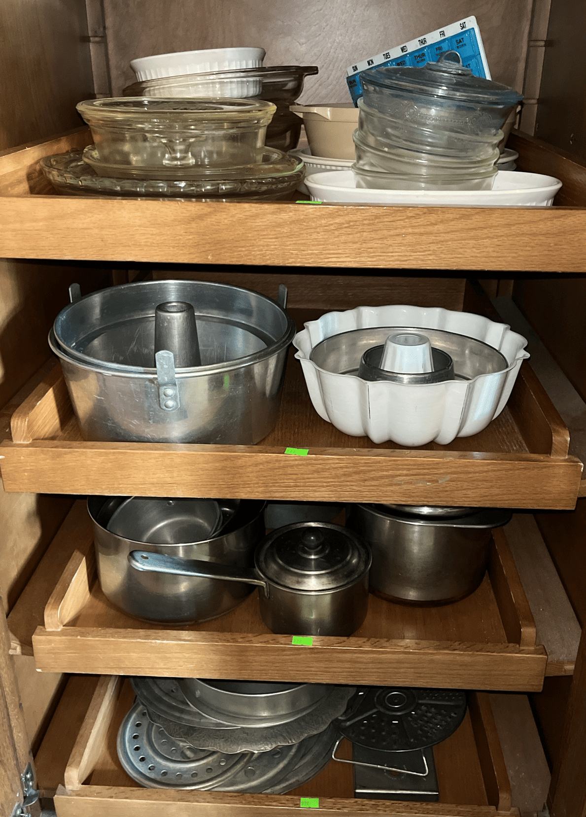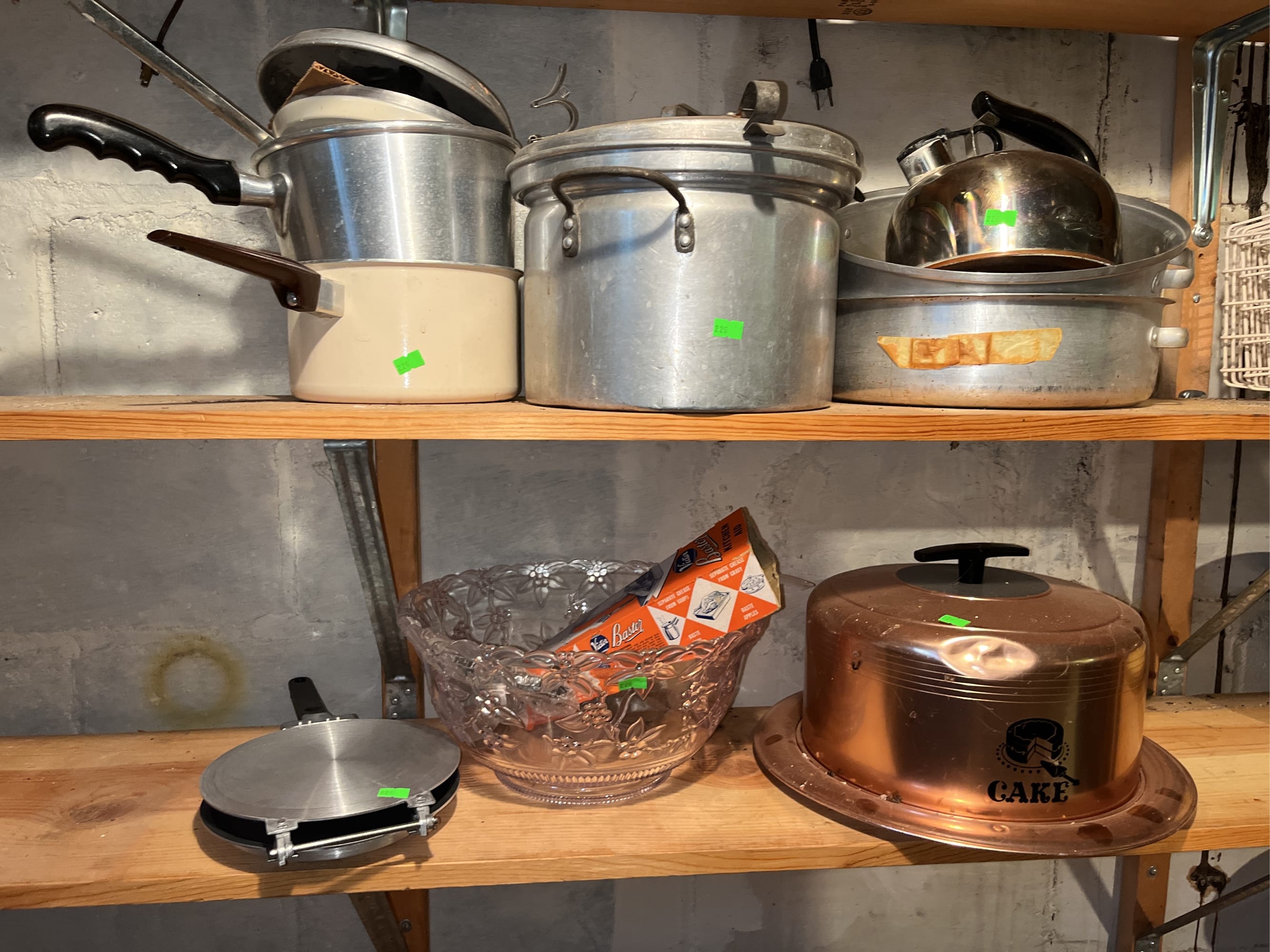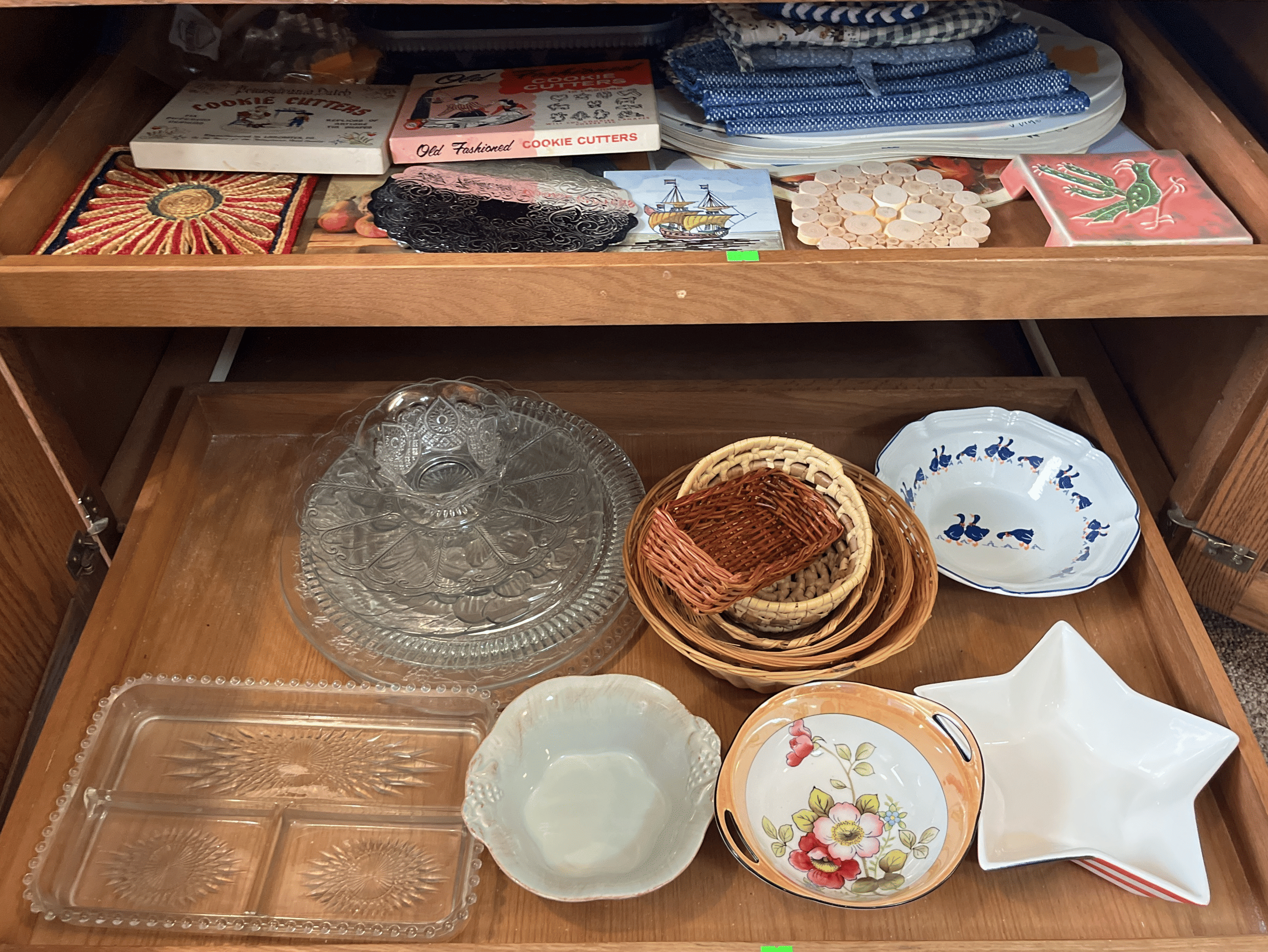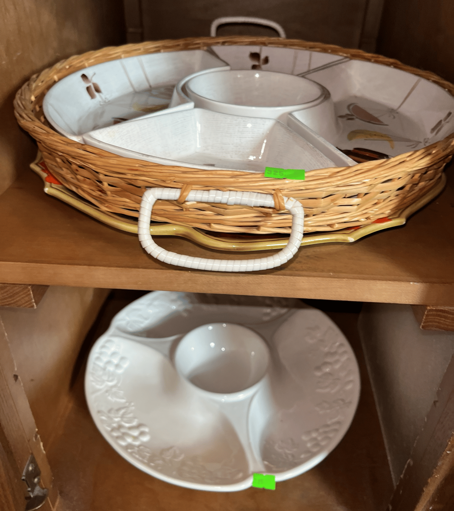 6 Serving trays, Red Wing teapot repaired, Abingdon bowl, Pyrex cheese server, wood dishes - CART NOT INCLUDED
