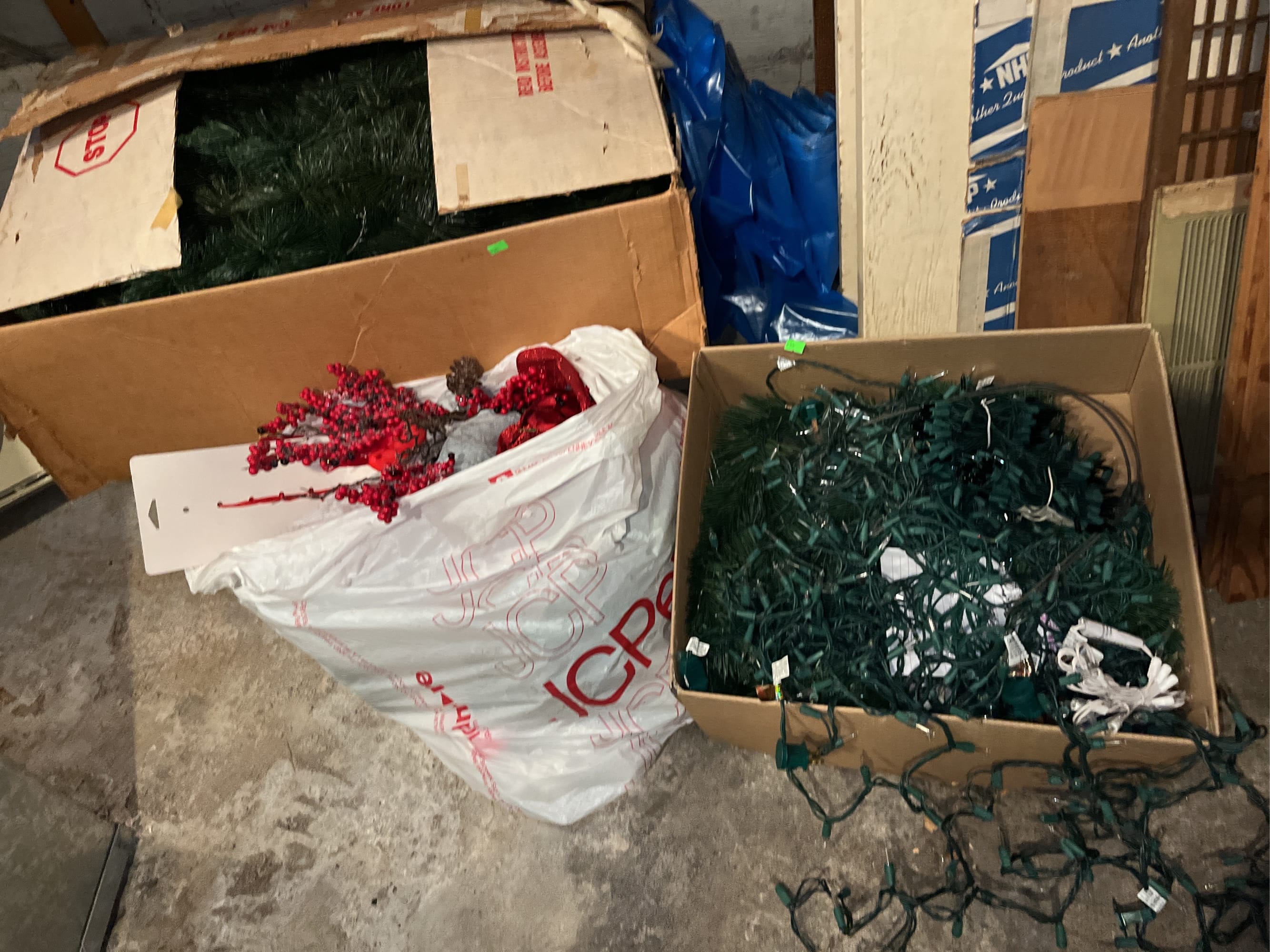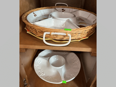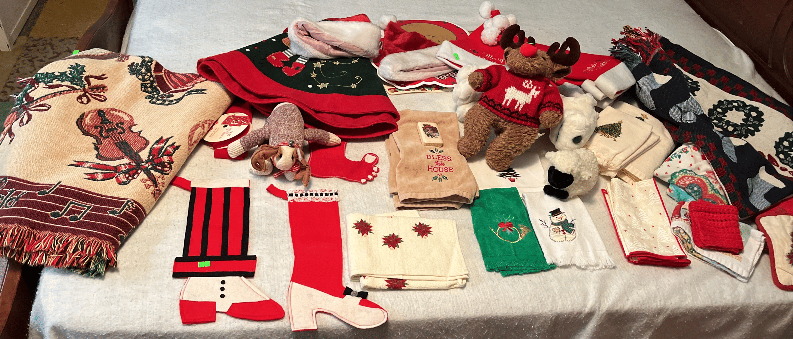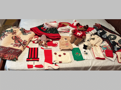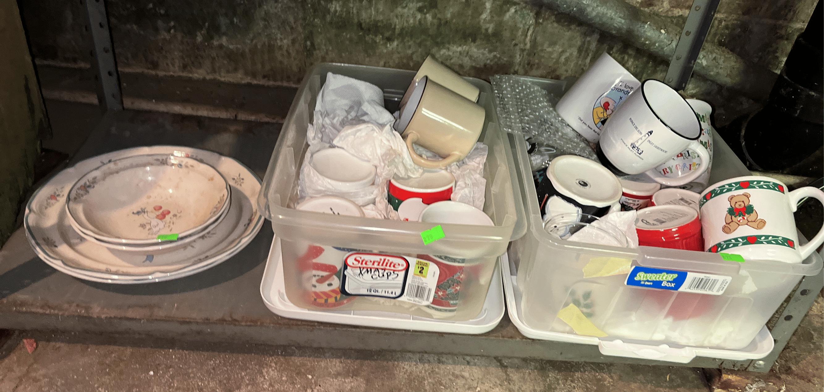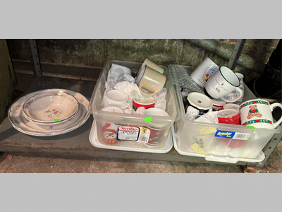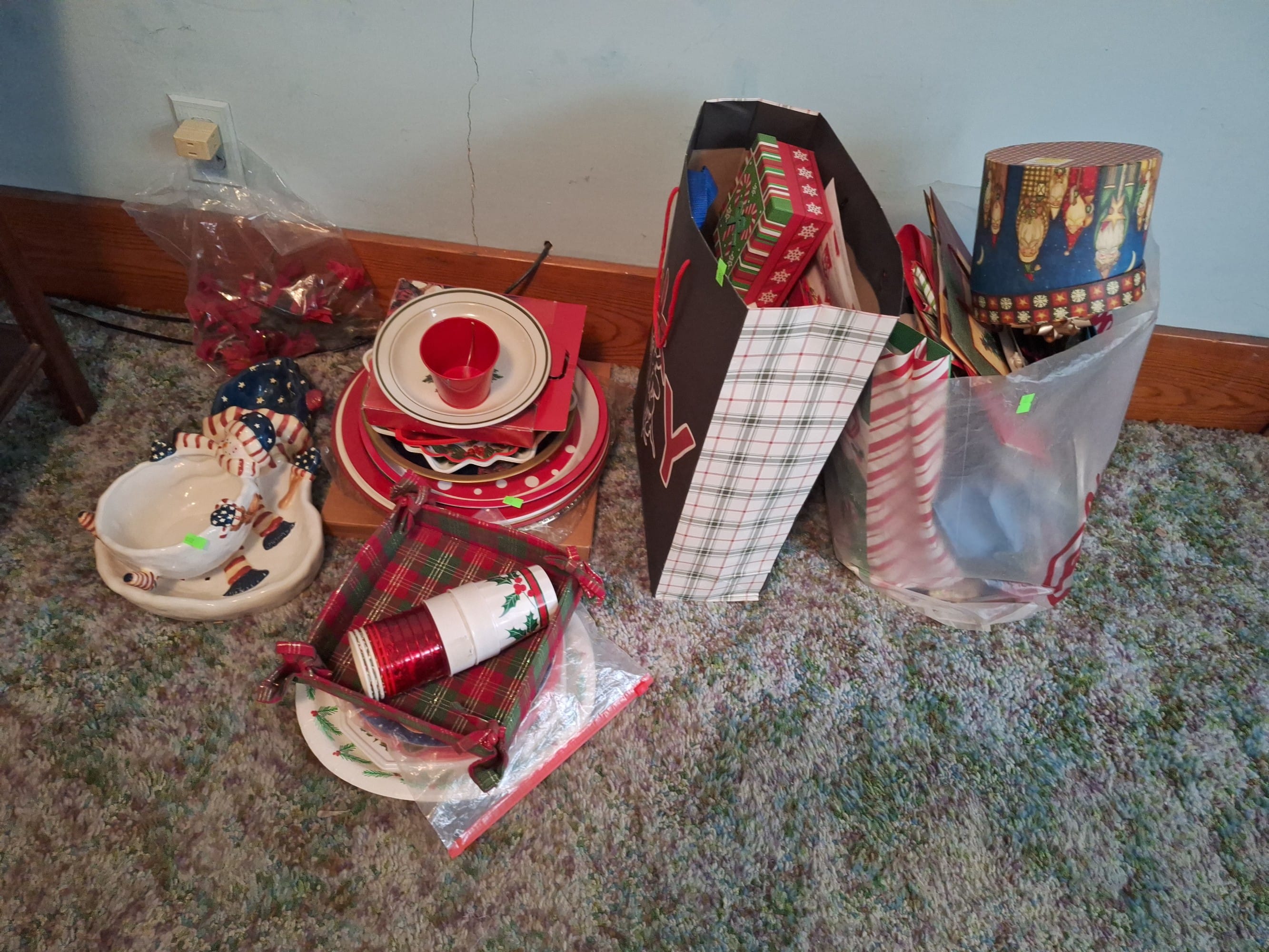 852 Christmas serving dishes and trays, paper and plastic plates and cups, Gift bags, bows, box