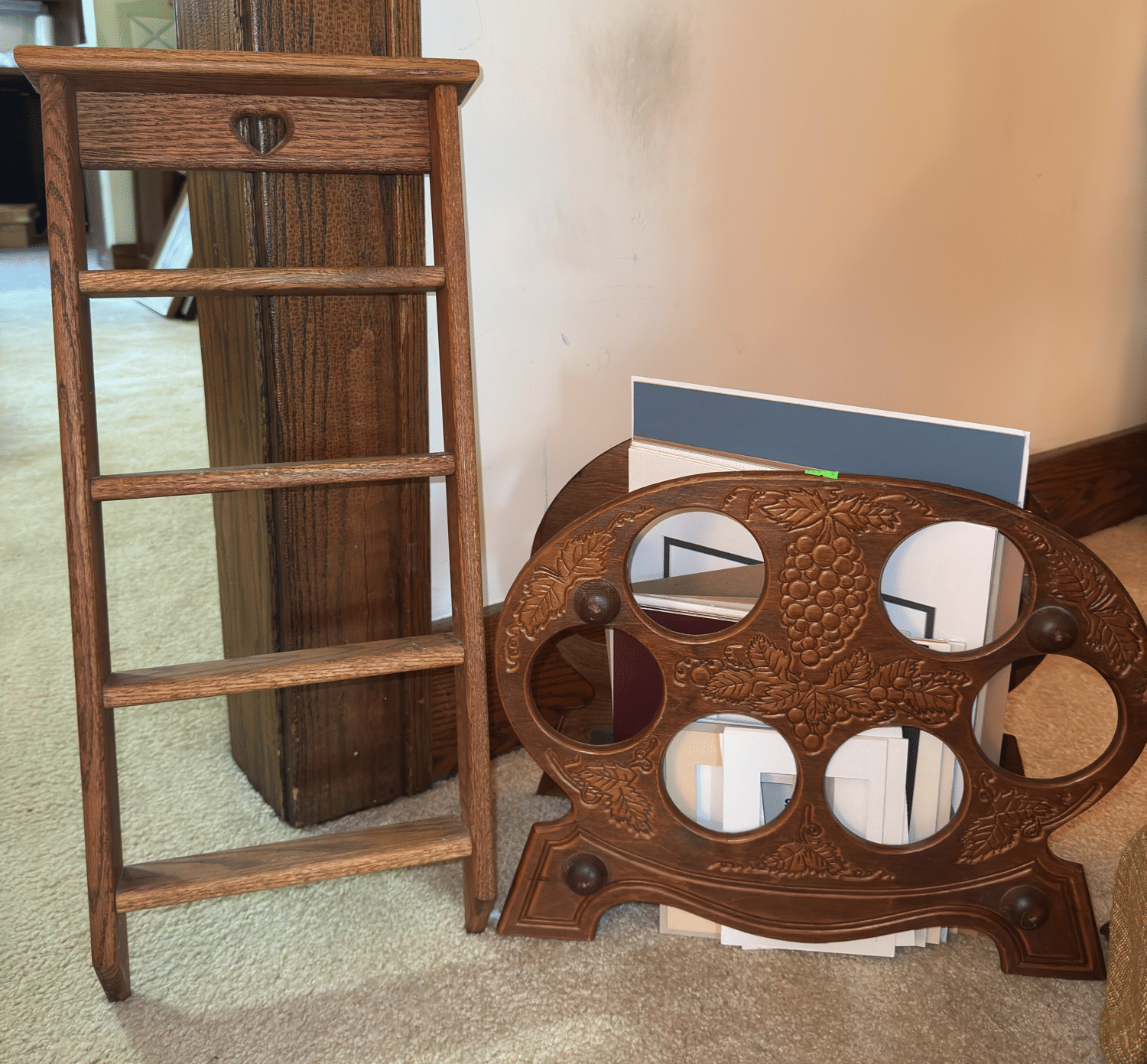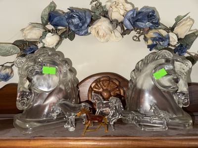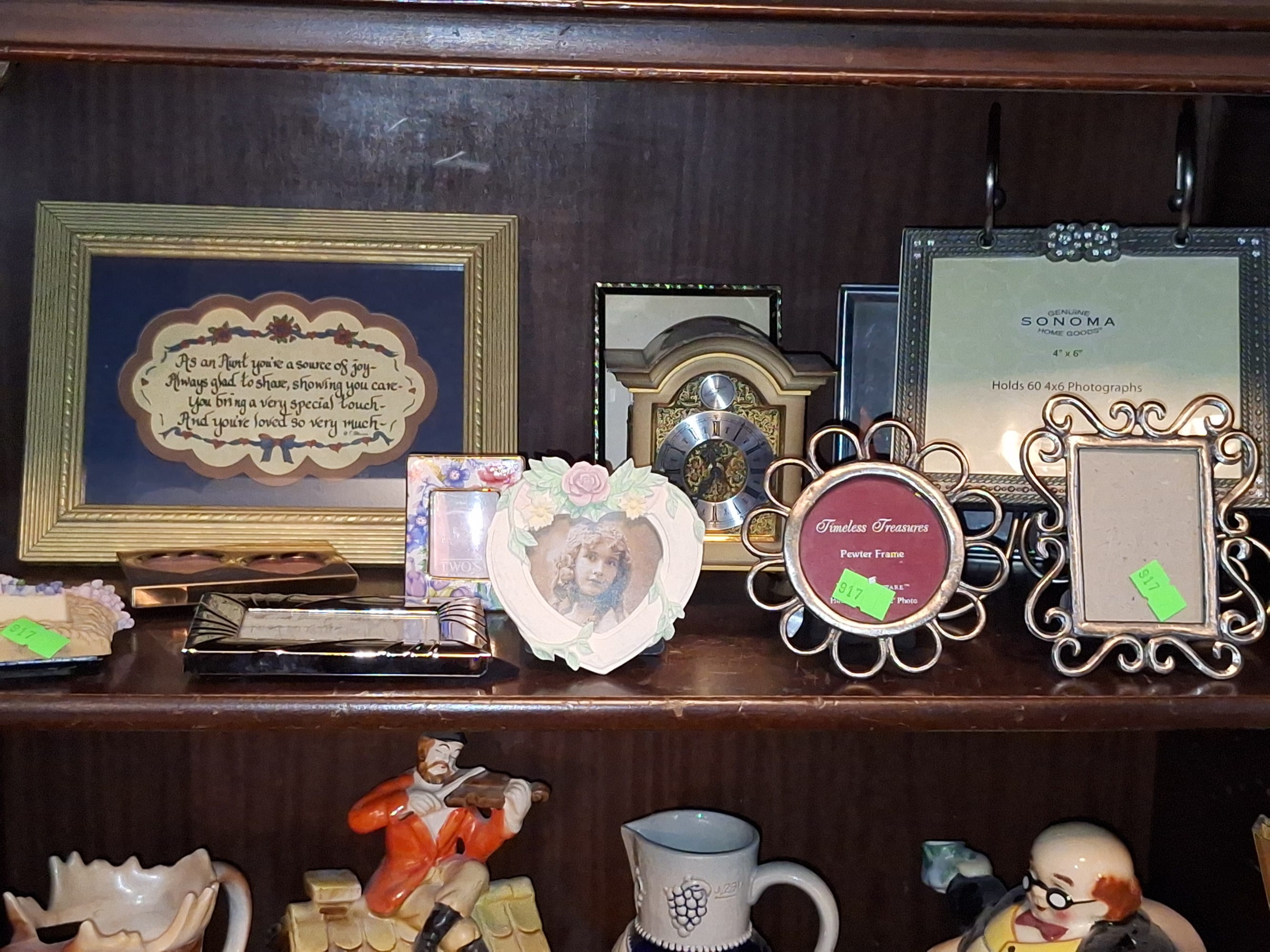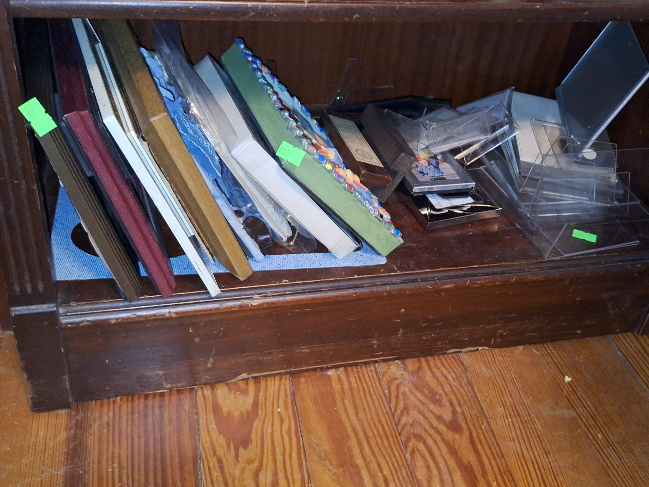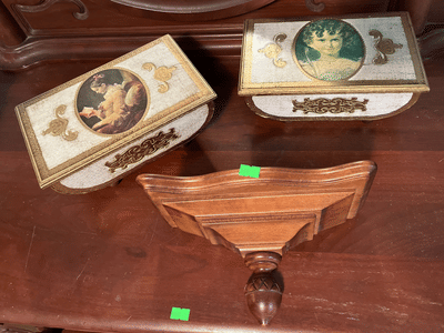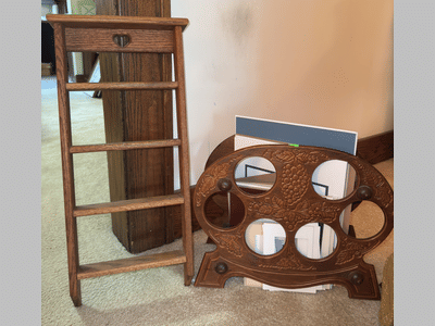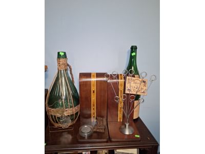 916 Glass bottles, wood bookends with wood inlay, metal picture holder tree