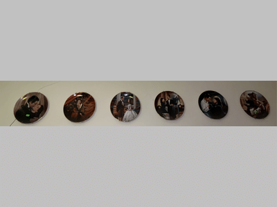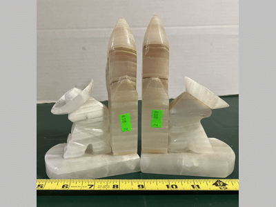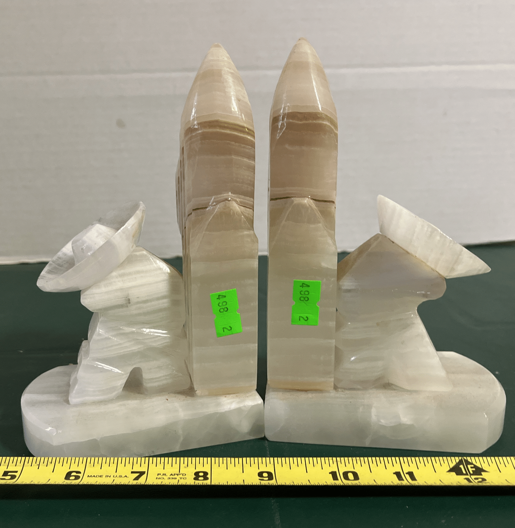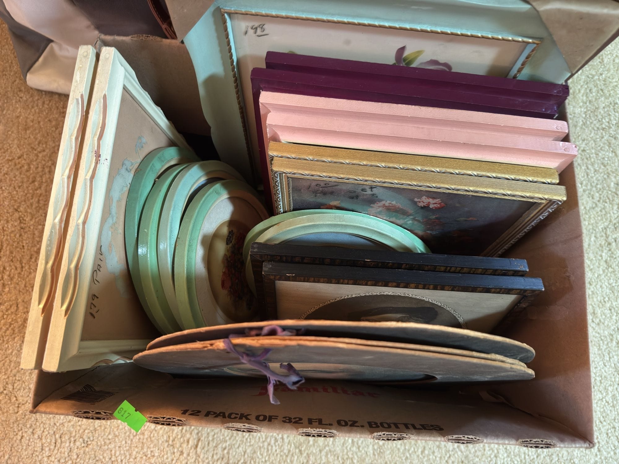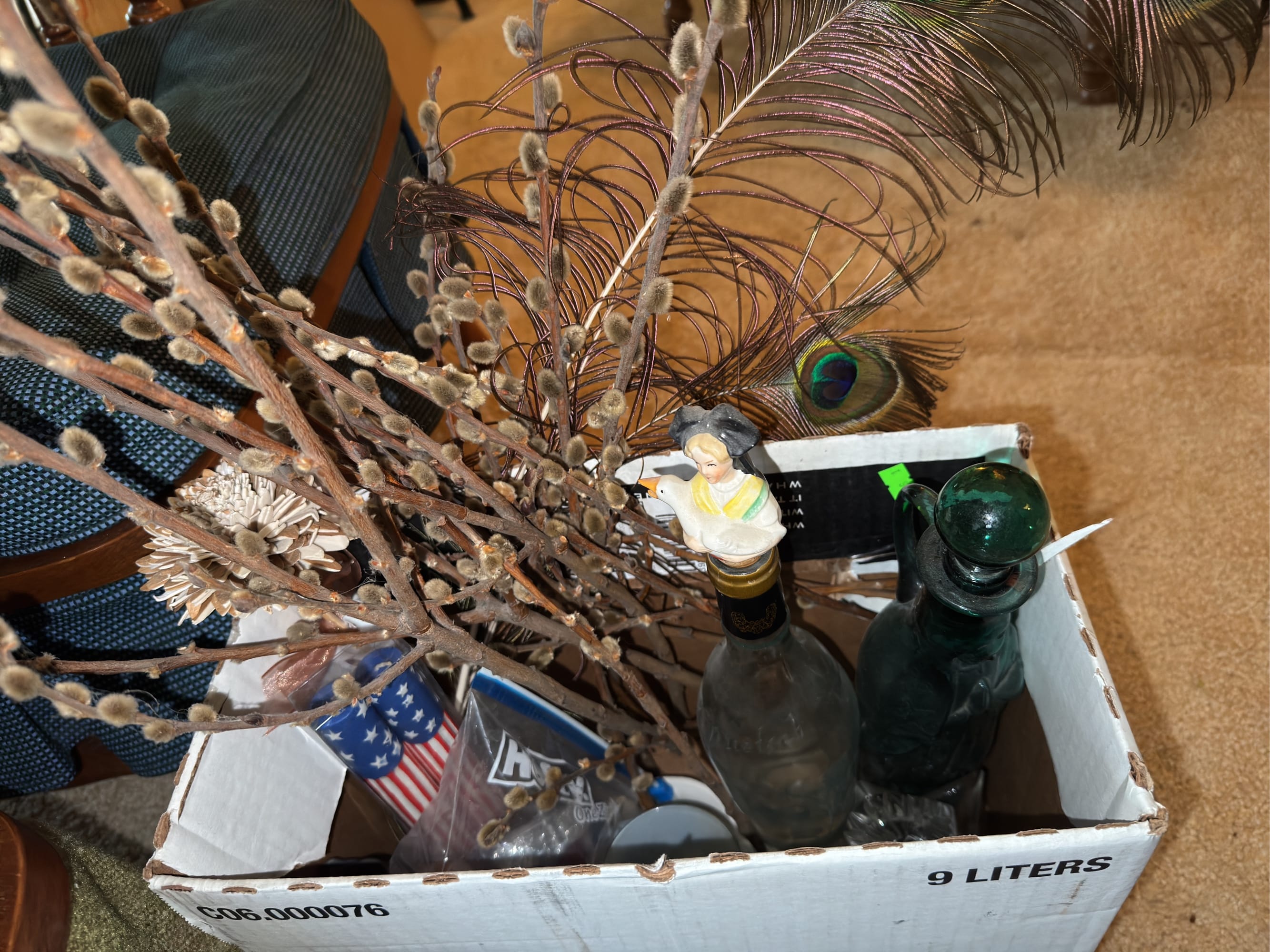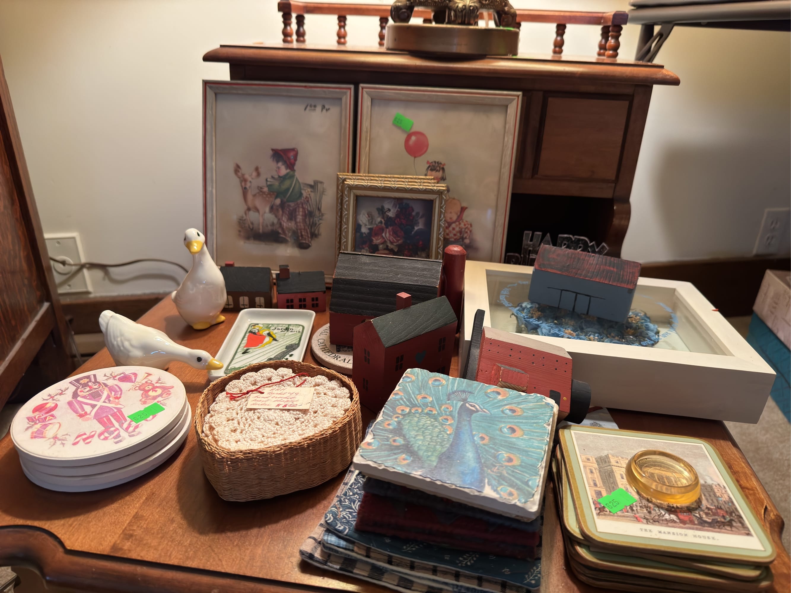 916 Glass bottles, wood bookends with wood inlay, metal picture holder tree