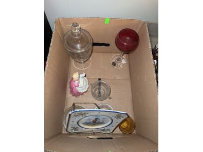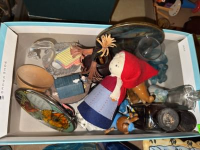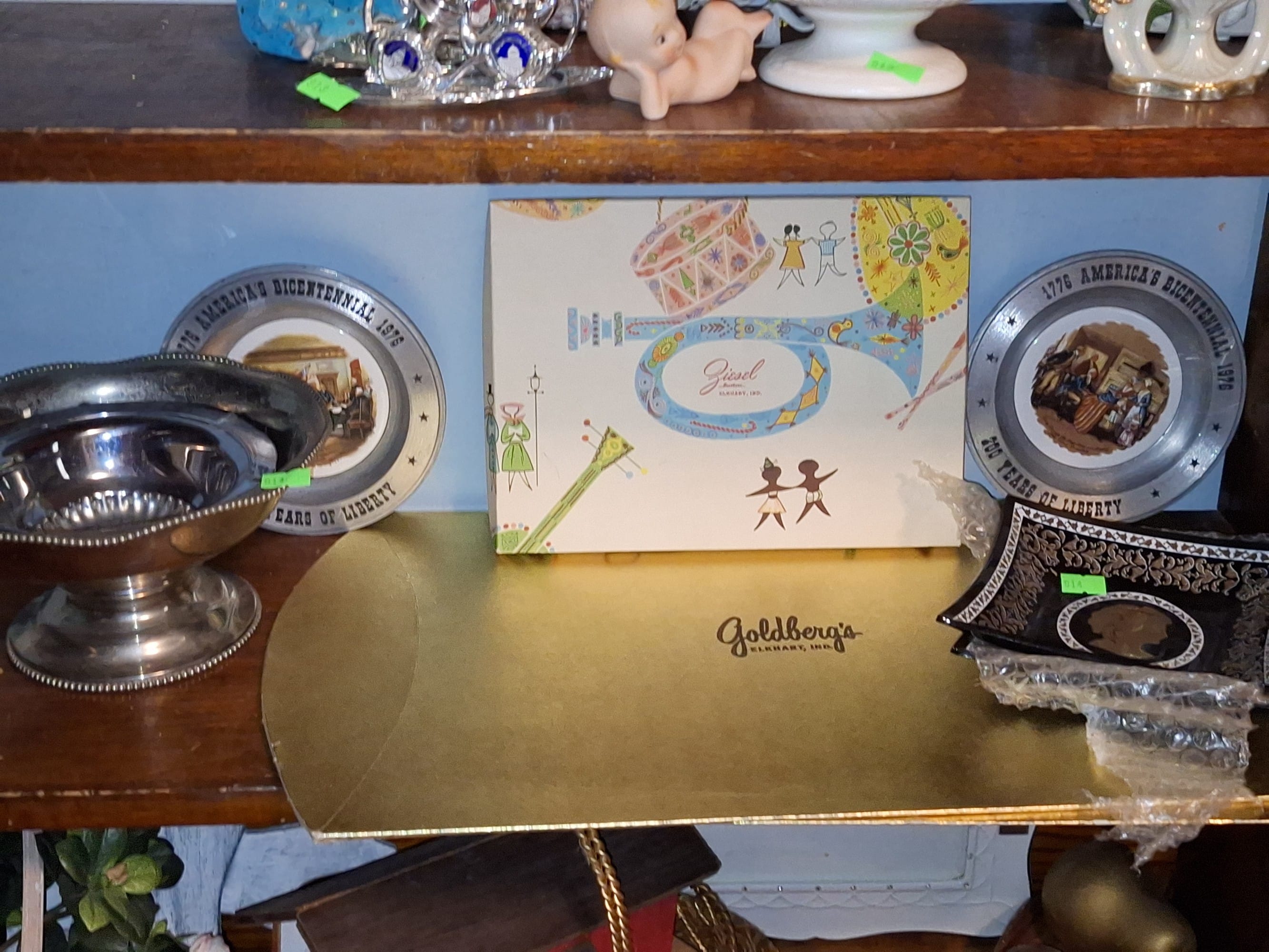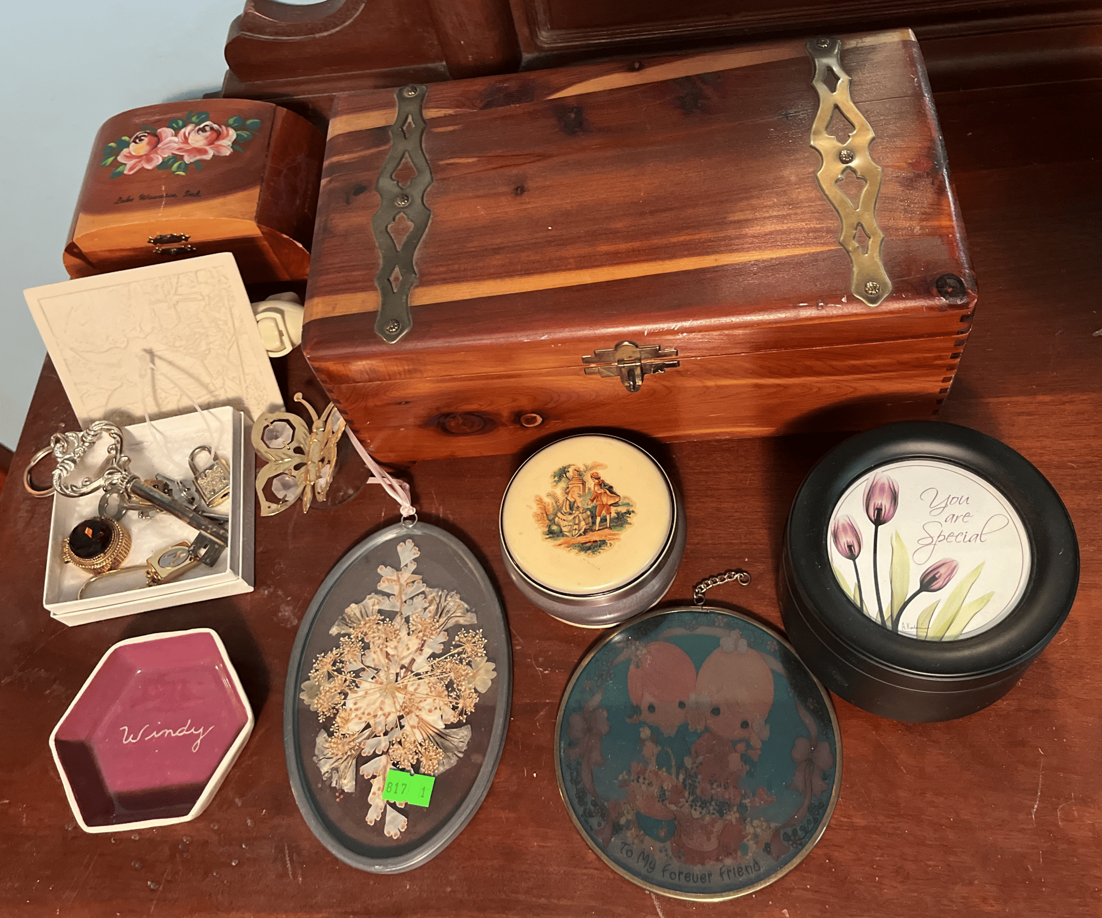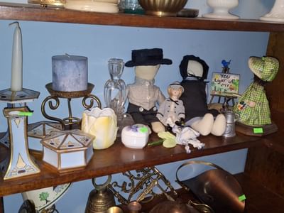 908 Germany trinket boxes and candle holders, glass candle holder, brass candle holder, Amish dolls, miscellaneous