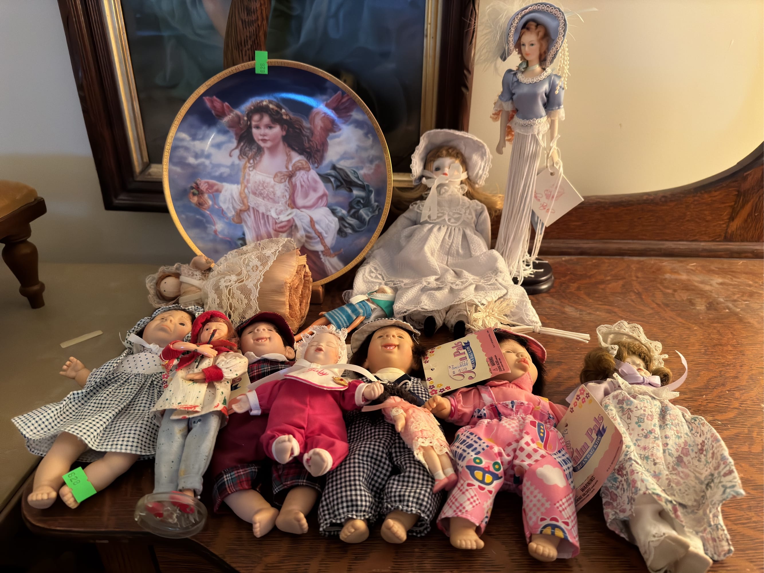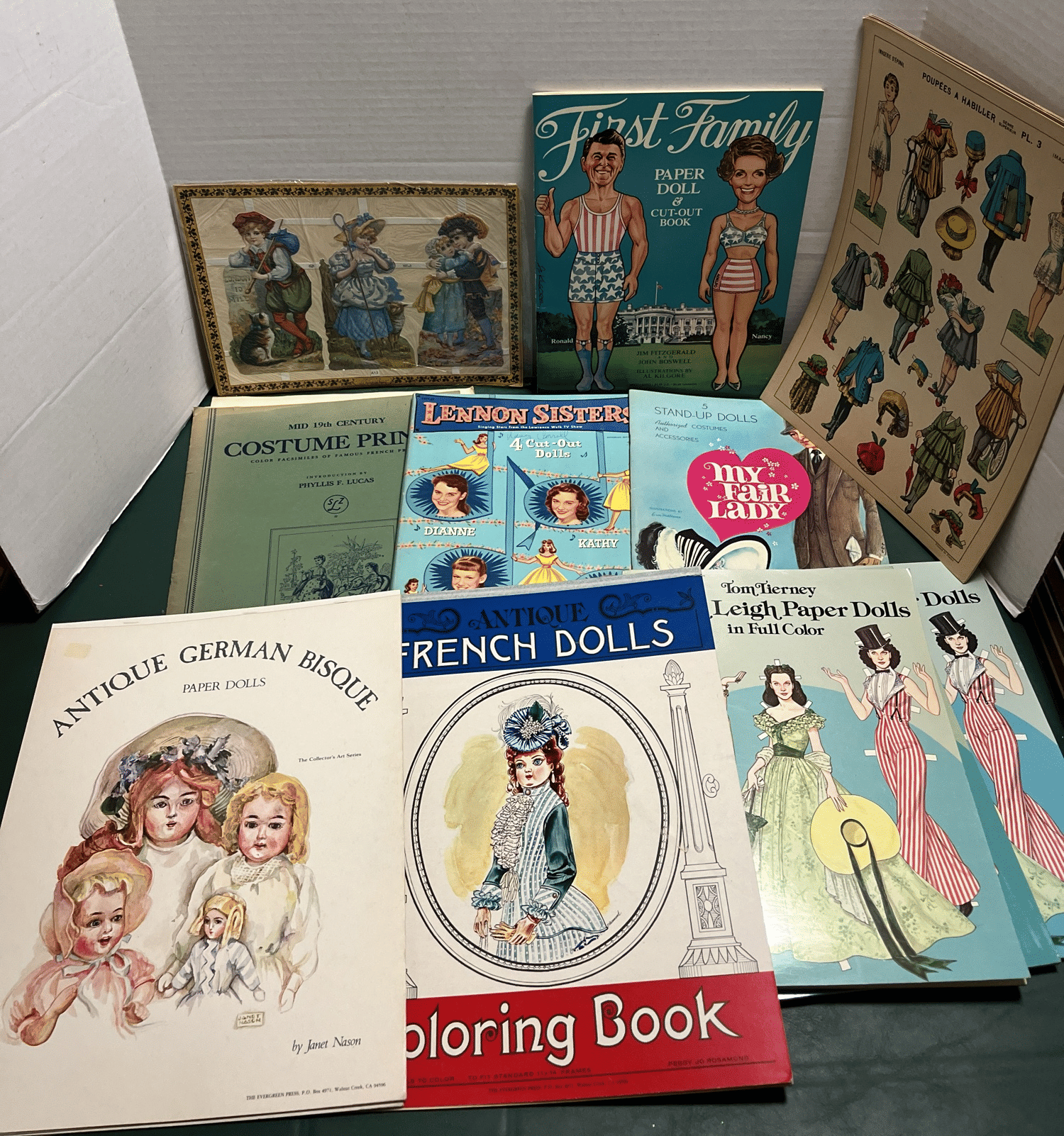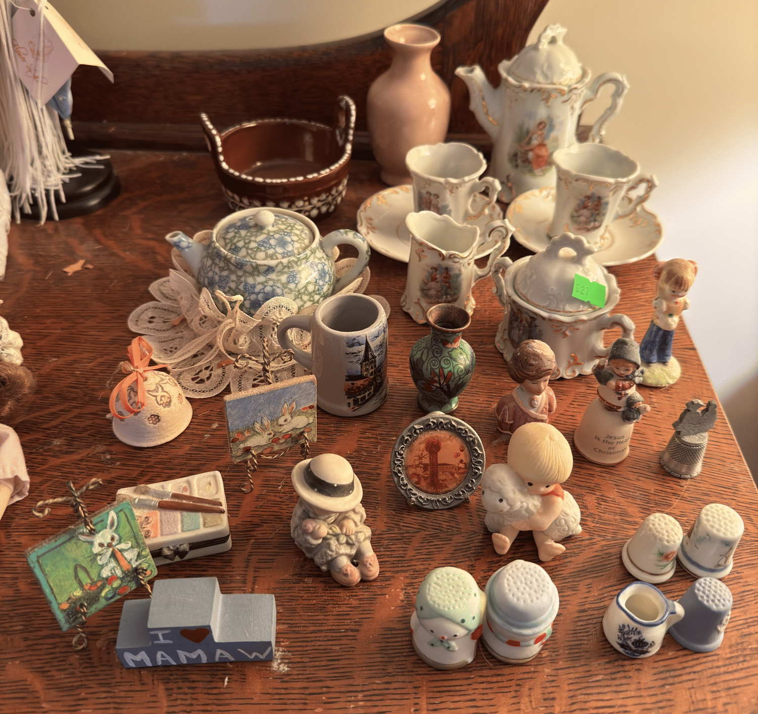 908 Germany trinket boxes and candle holders, glass candle holder, brass candle holder, Amish dolls, miscellaneous