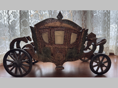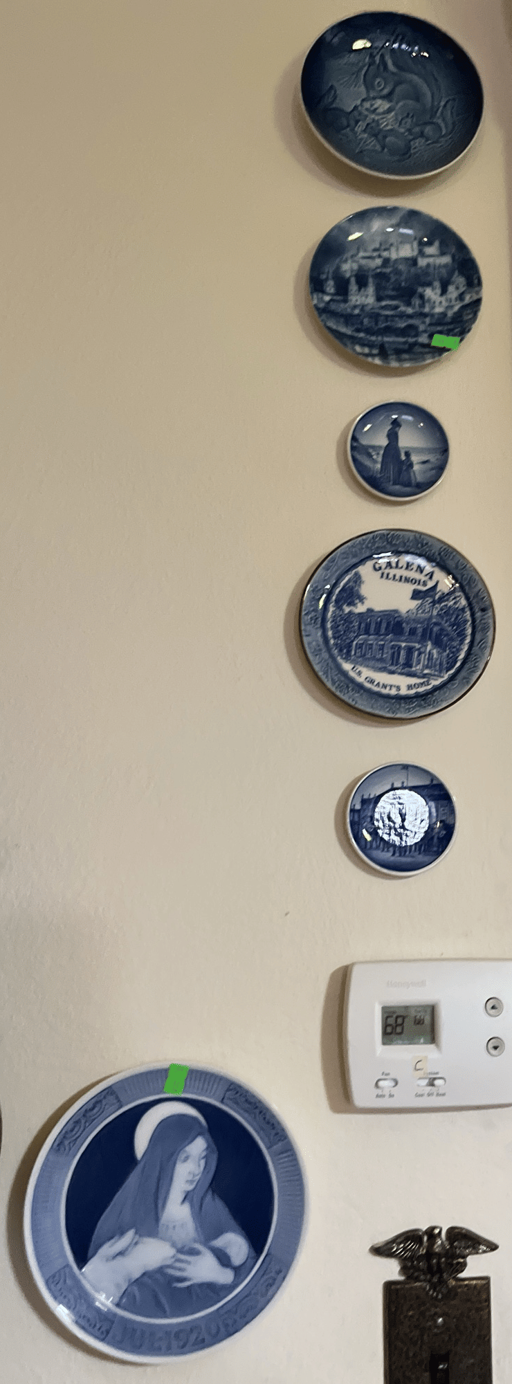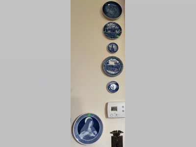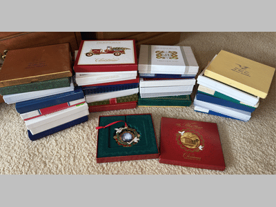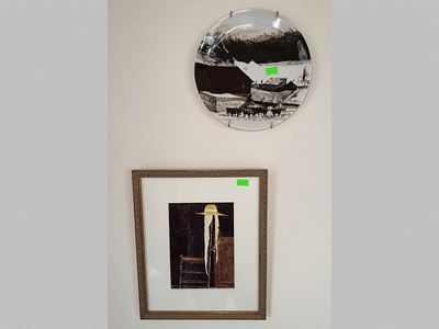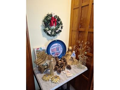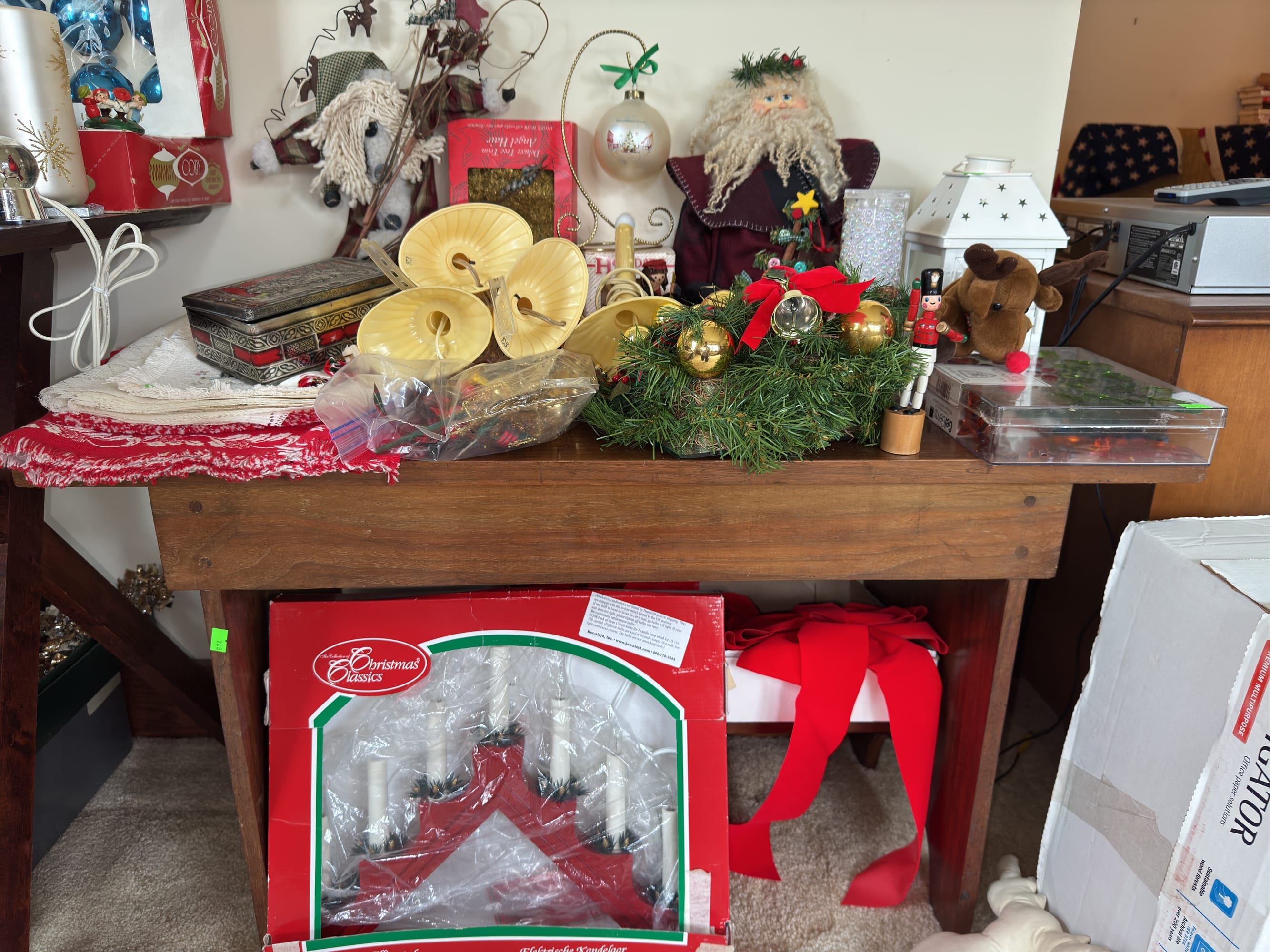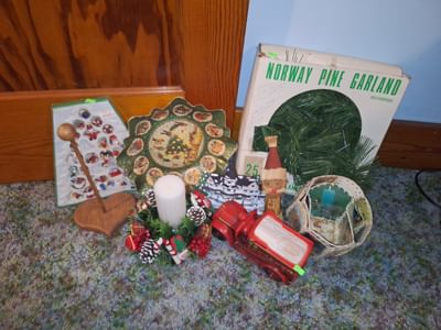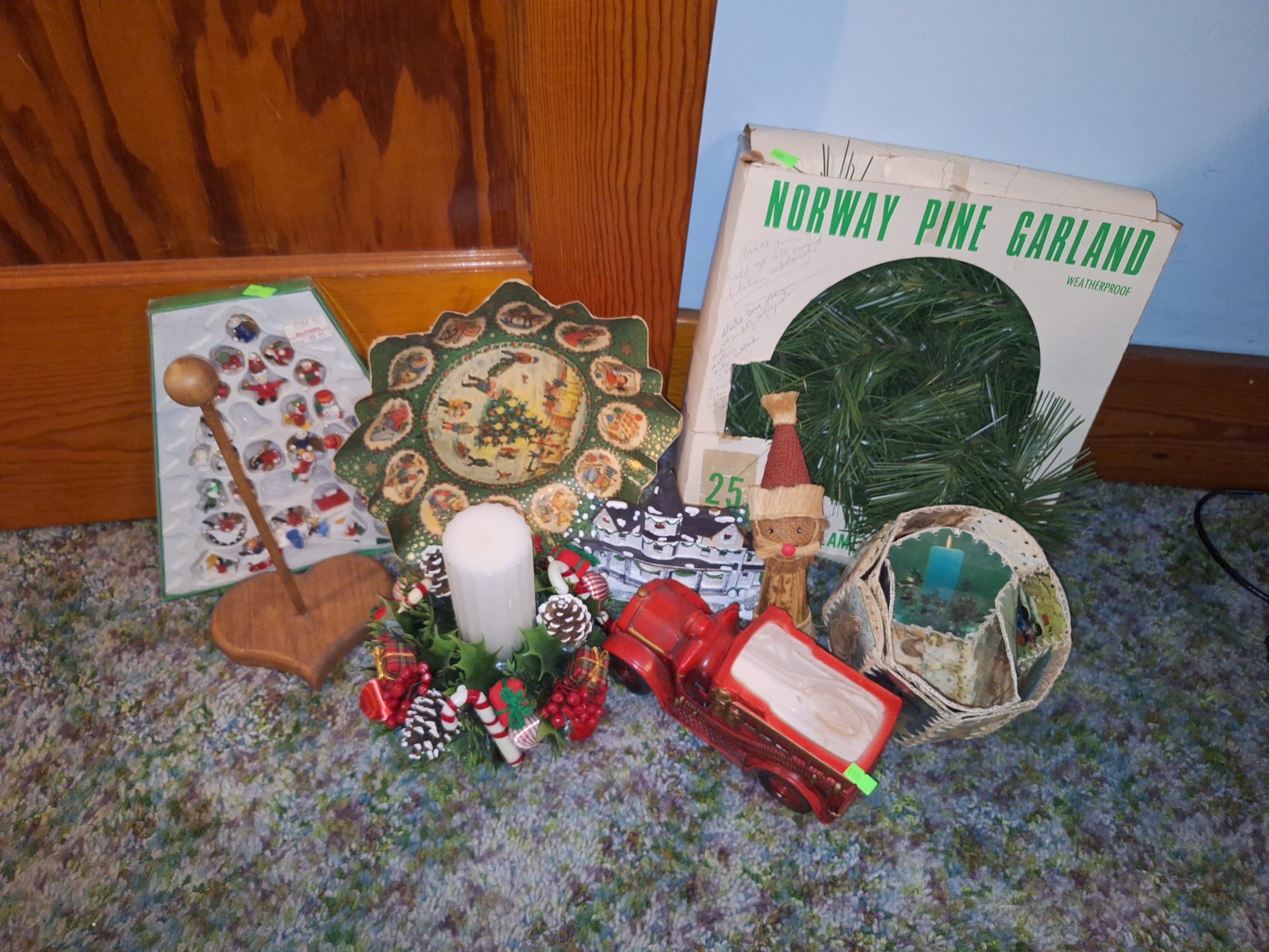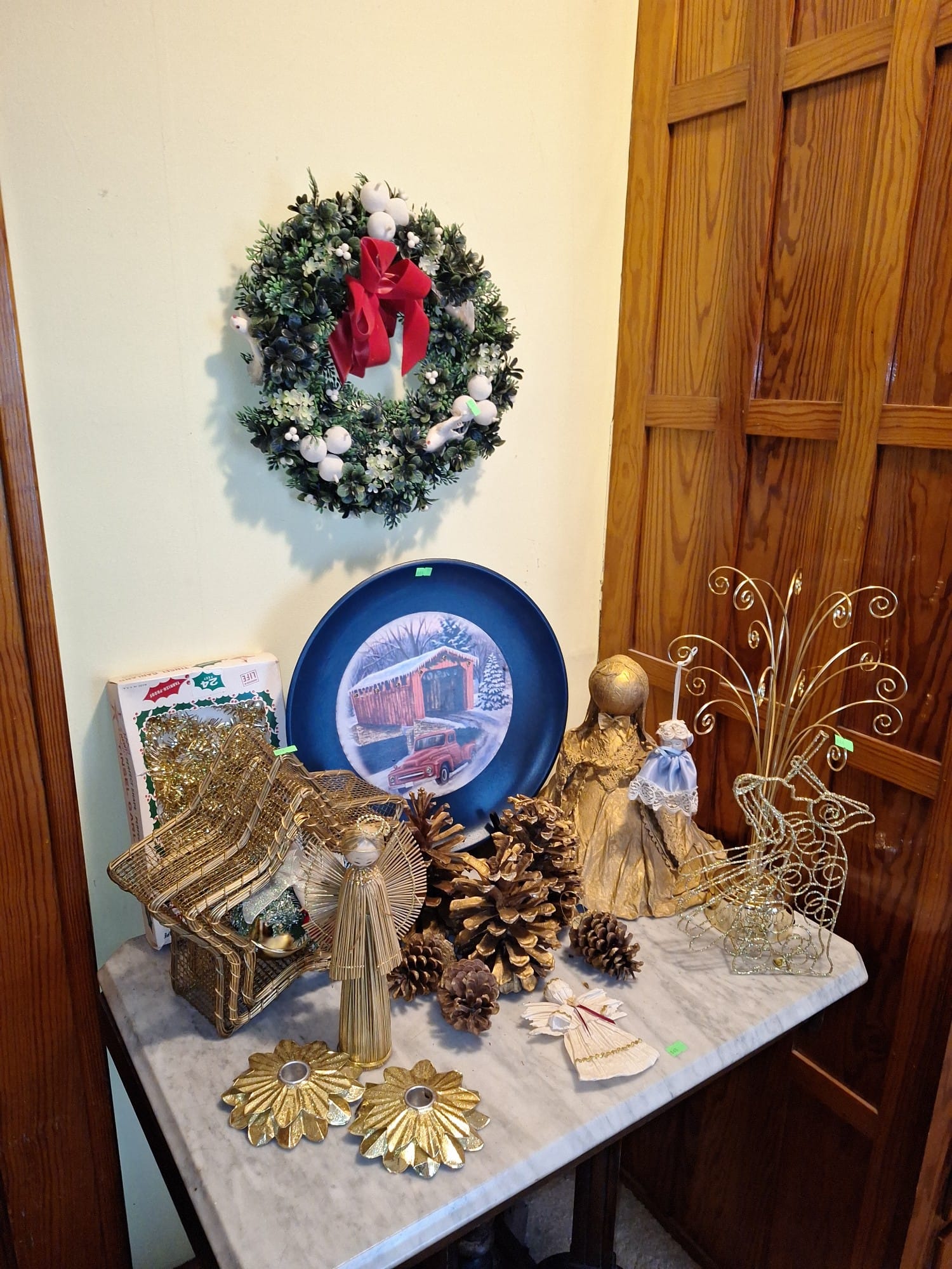 844 Gold color Christmas decorations, Vintage truck lighted plate, wreath