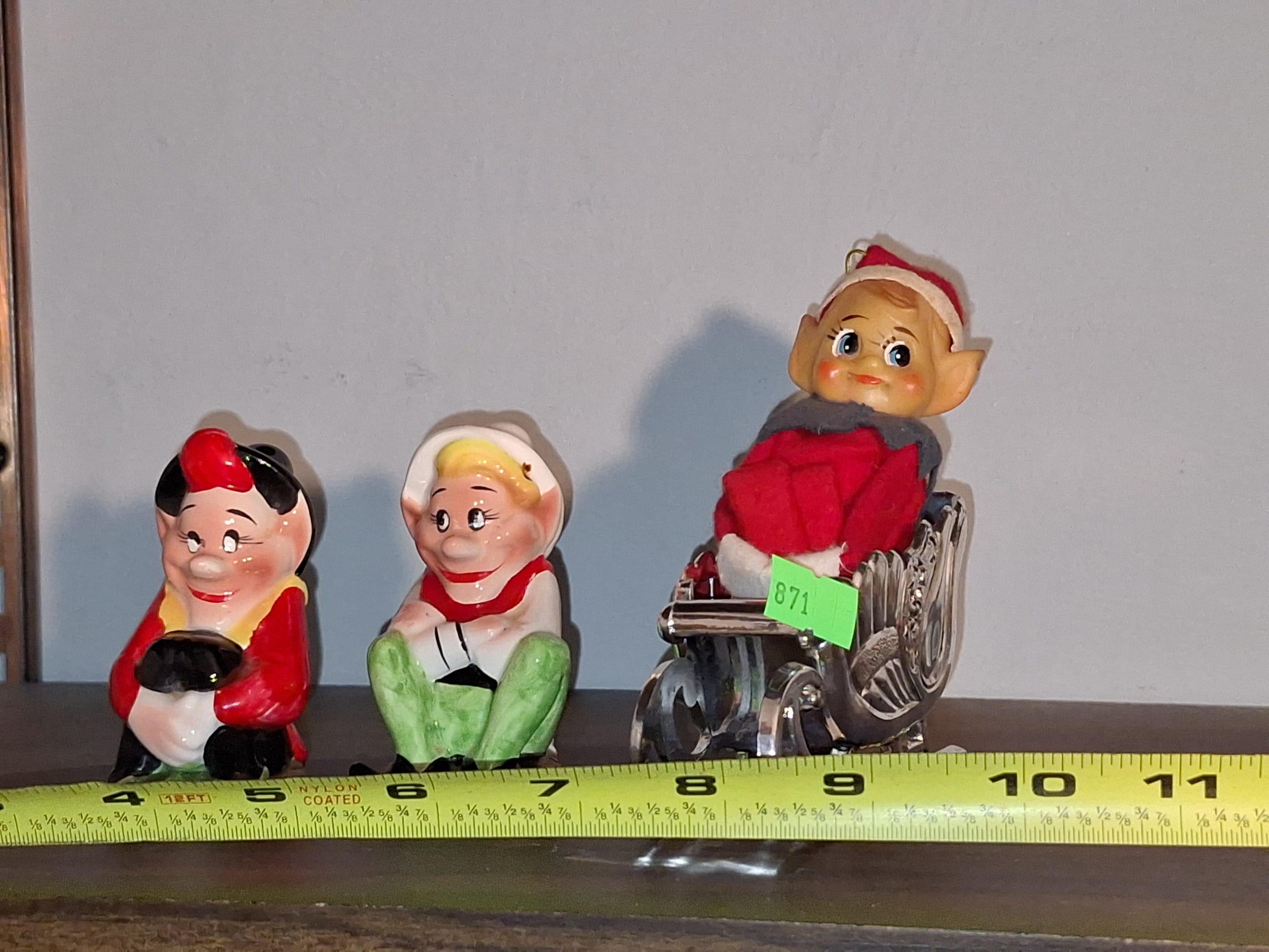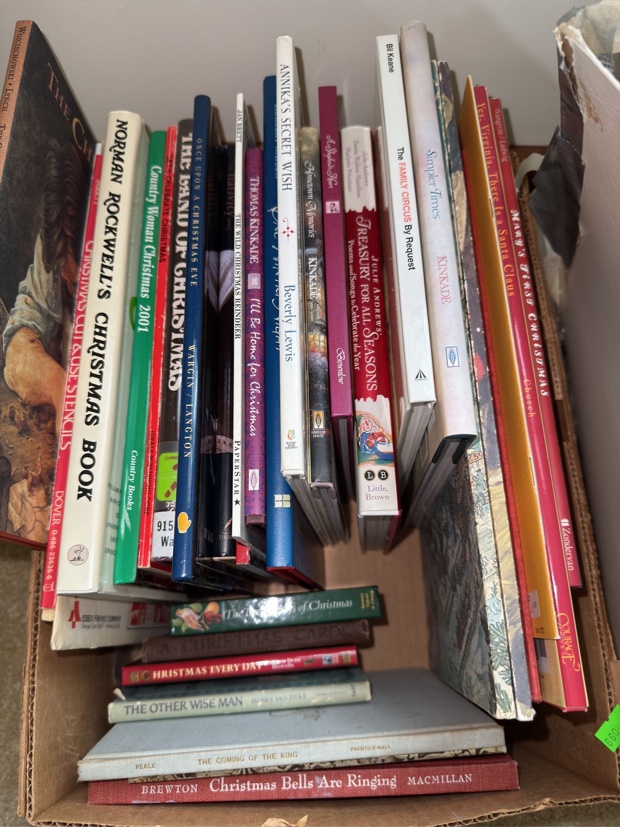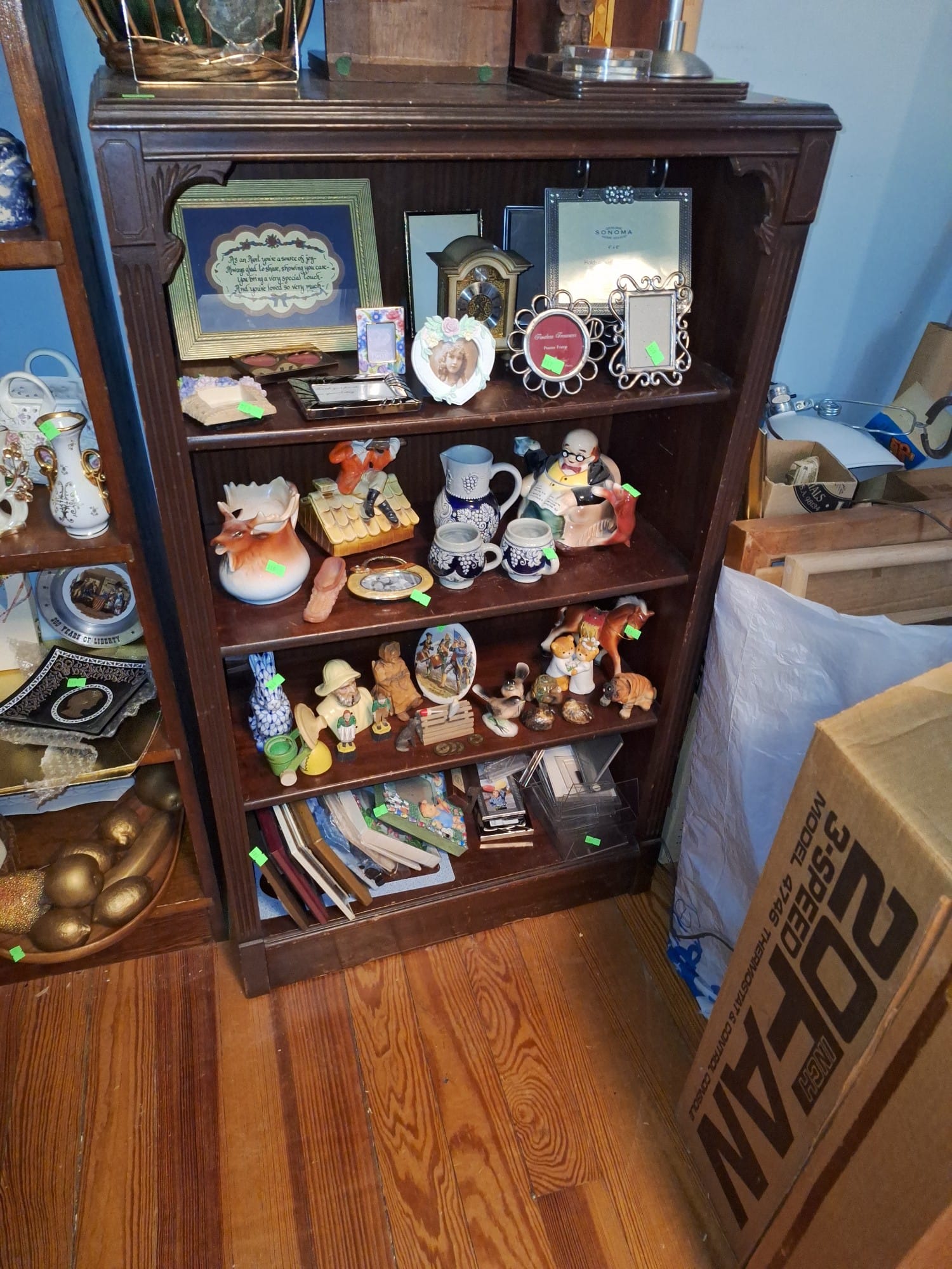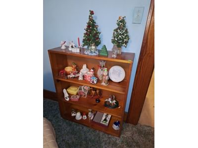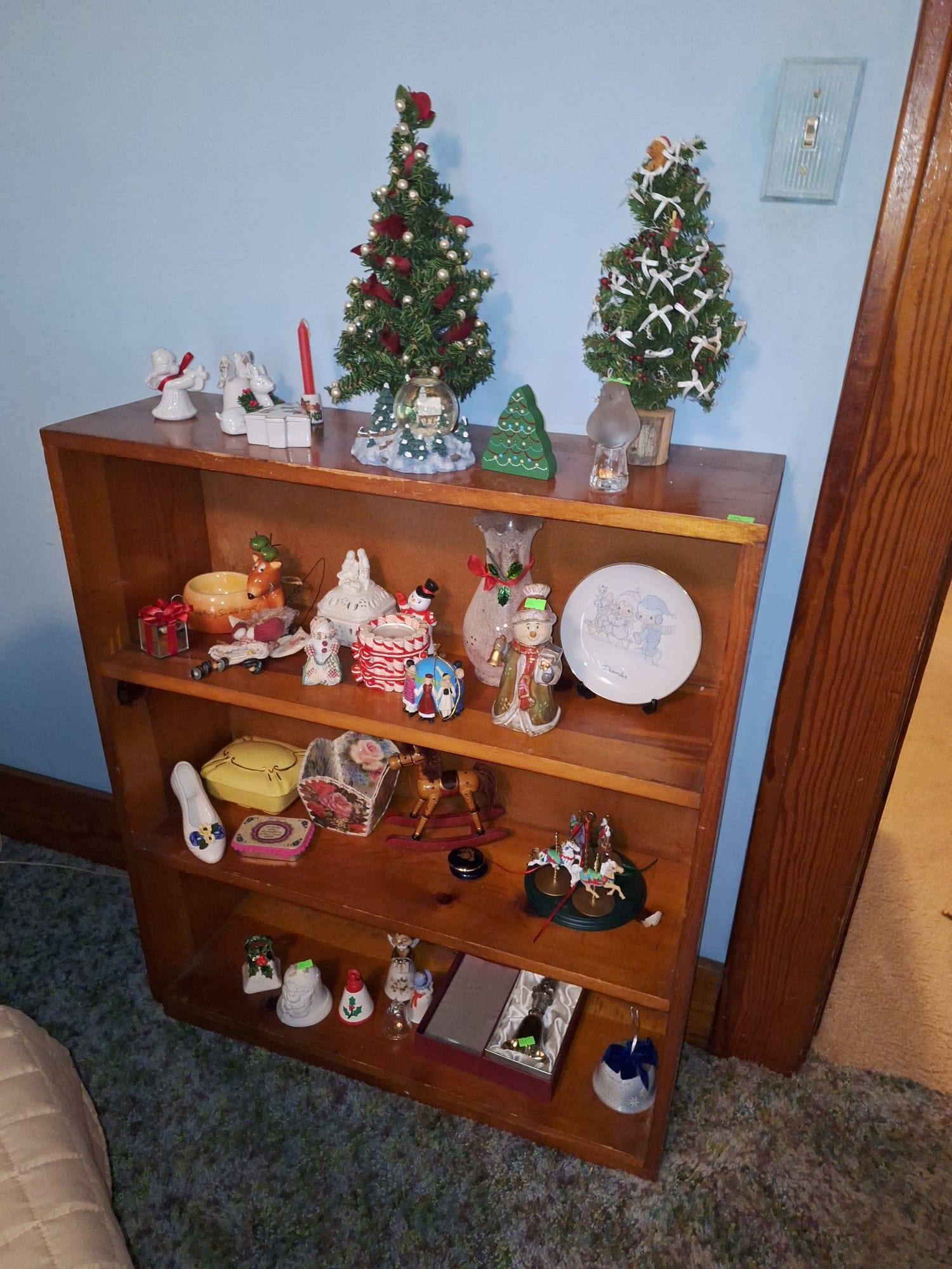 864 Christmas decorations, Seymour Mann porcelain shoe and box and wood bookcase 30x9 1/2x36
