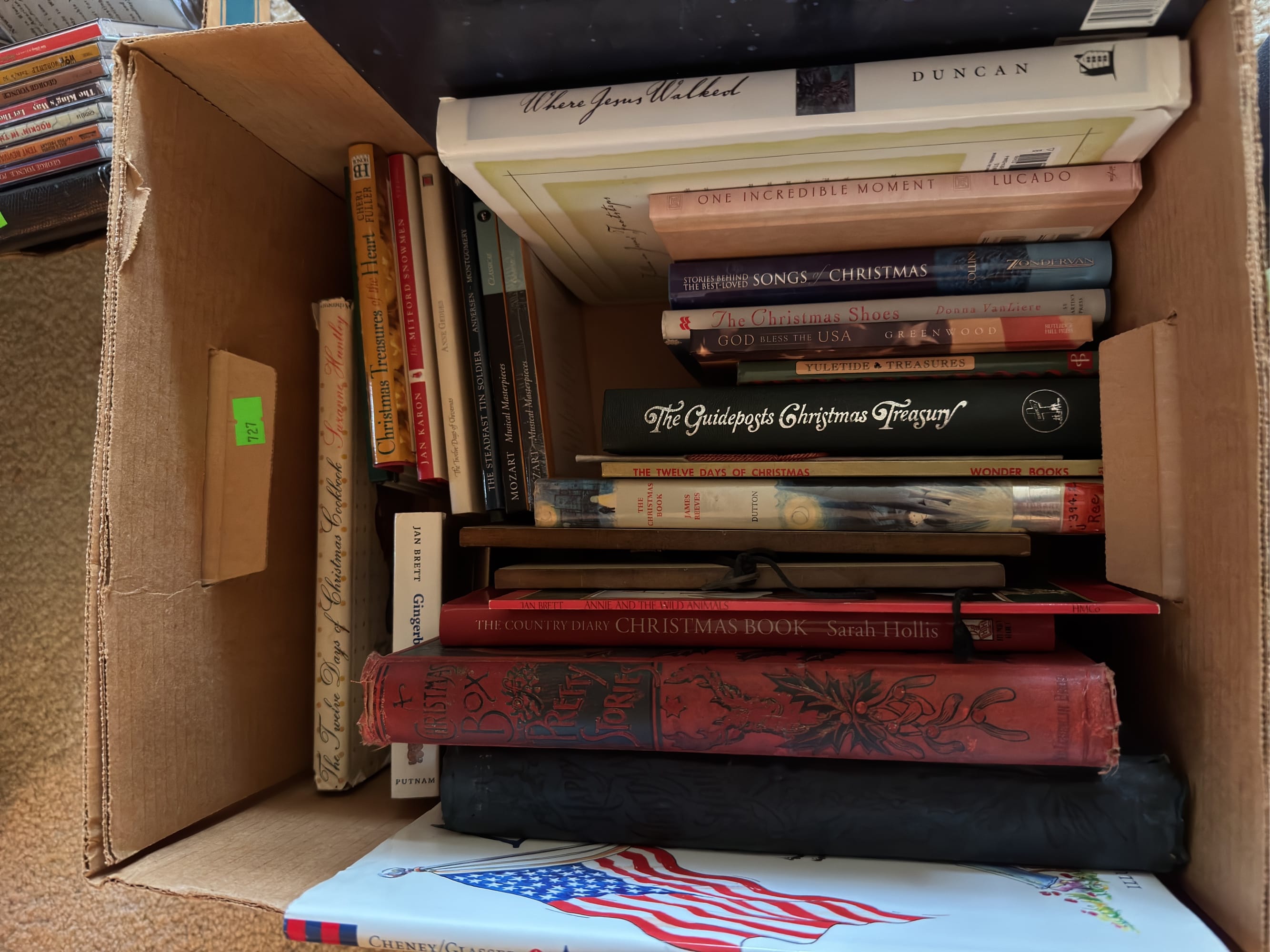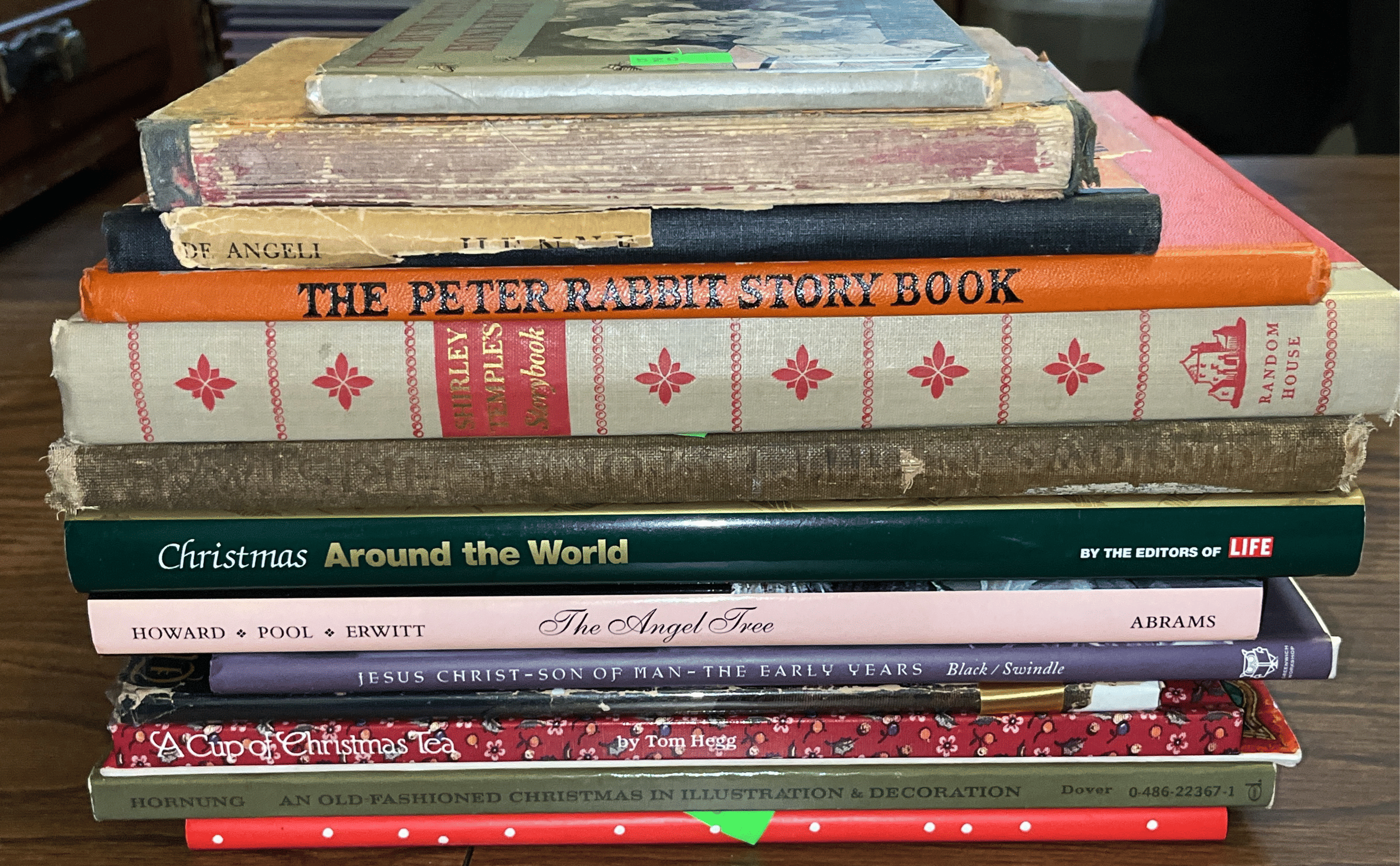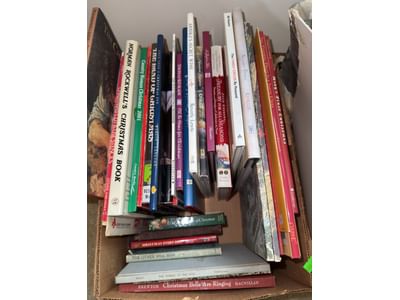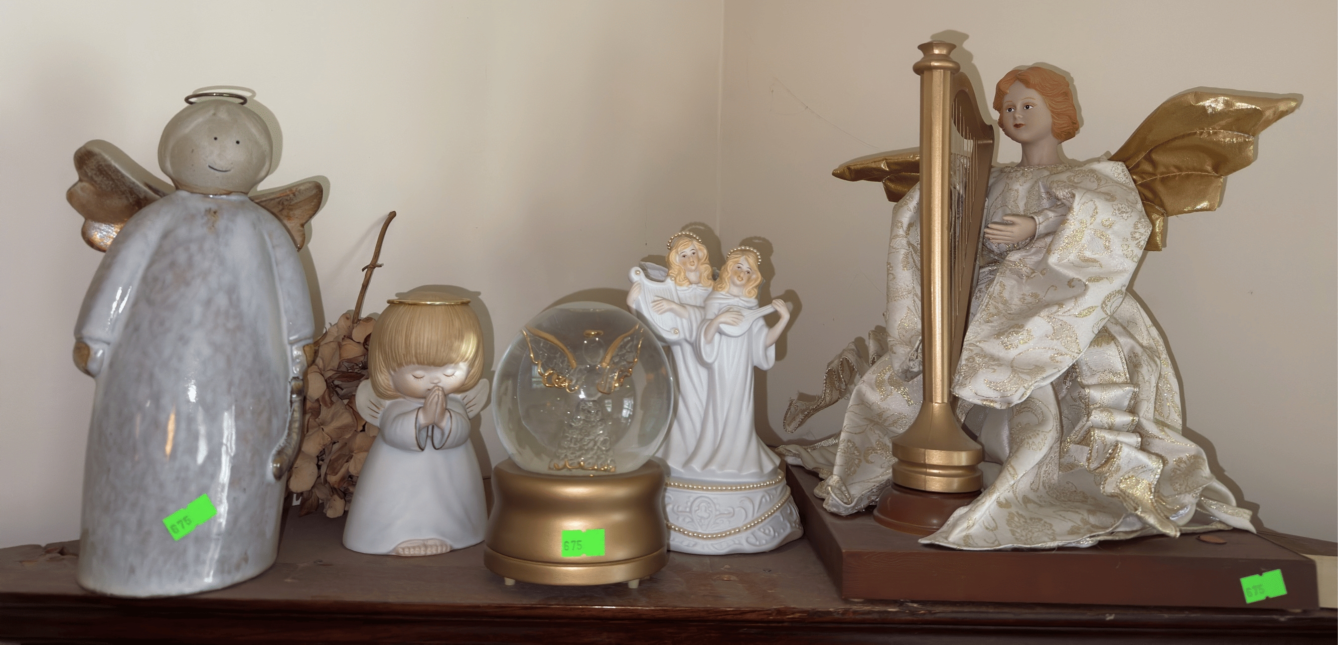 864 Christmas decorations, Seymour Mann porcelain shoe and box and wood bookcase 30x9 1/2x36