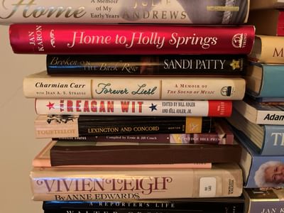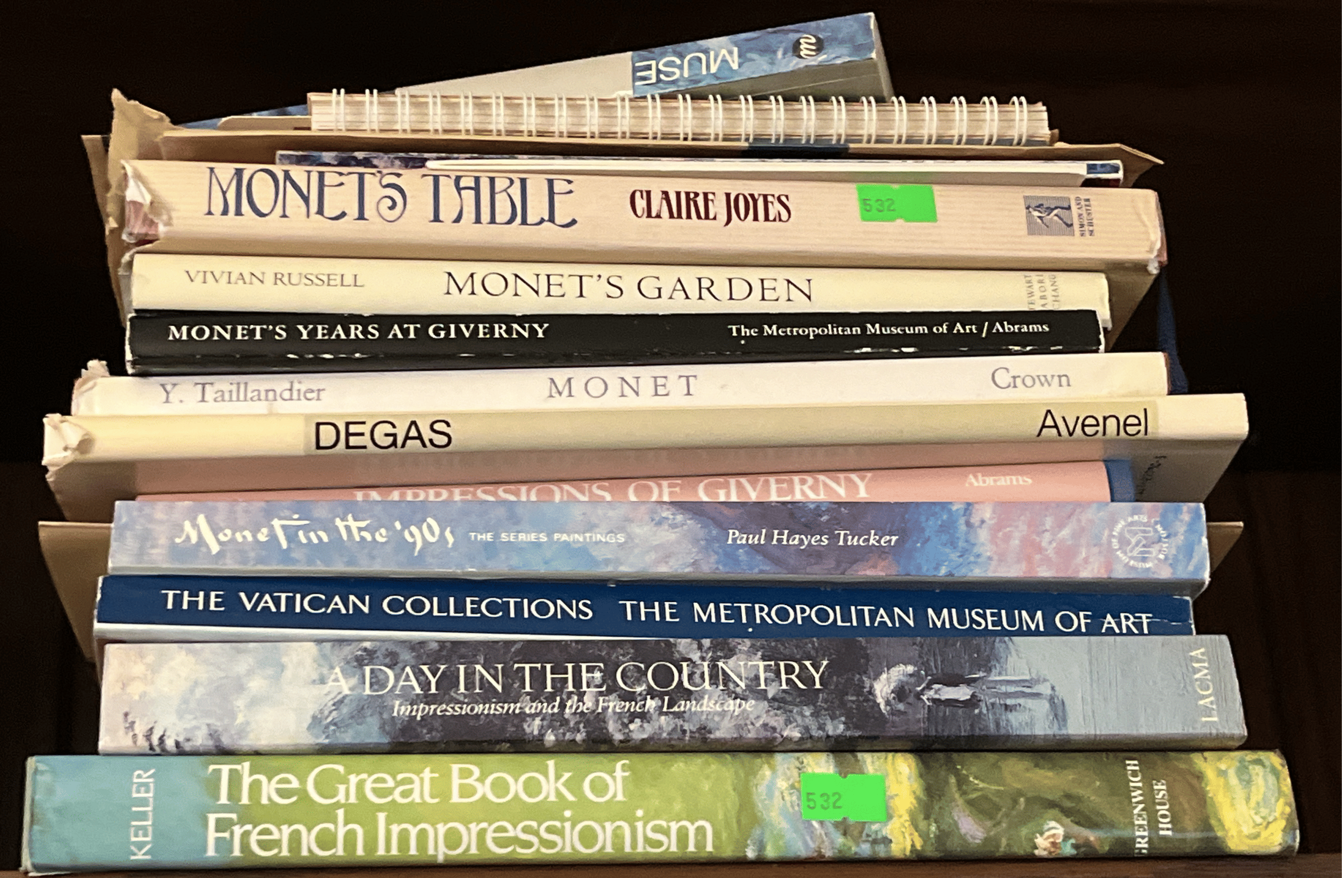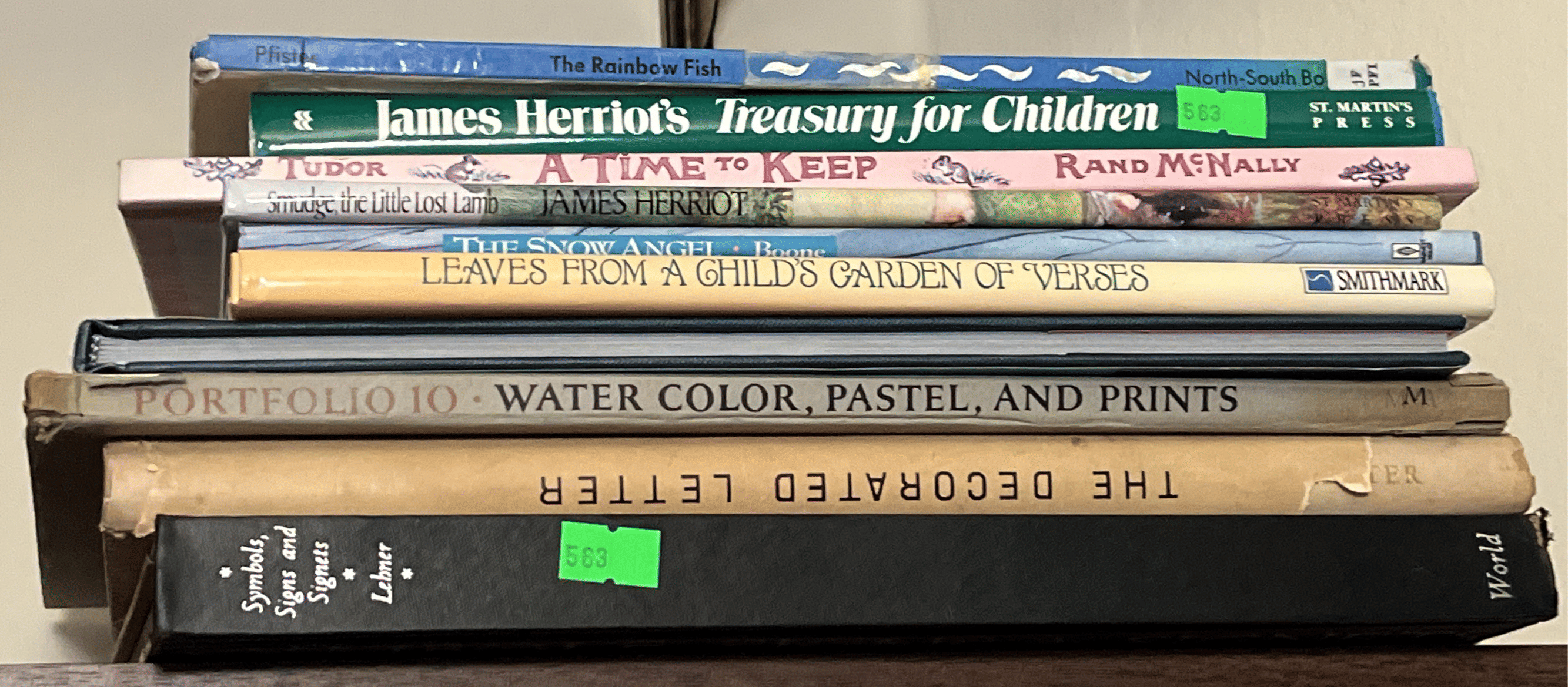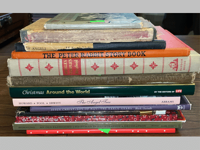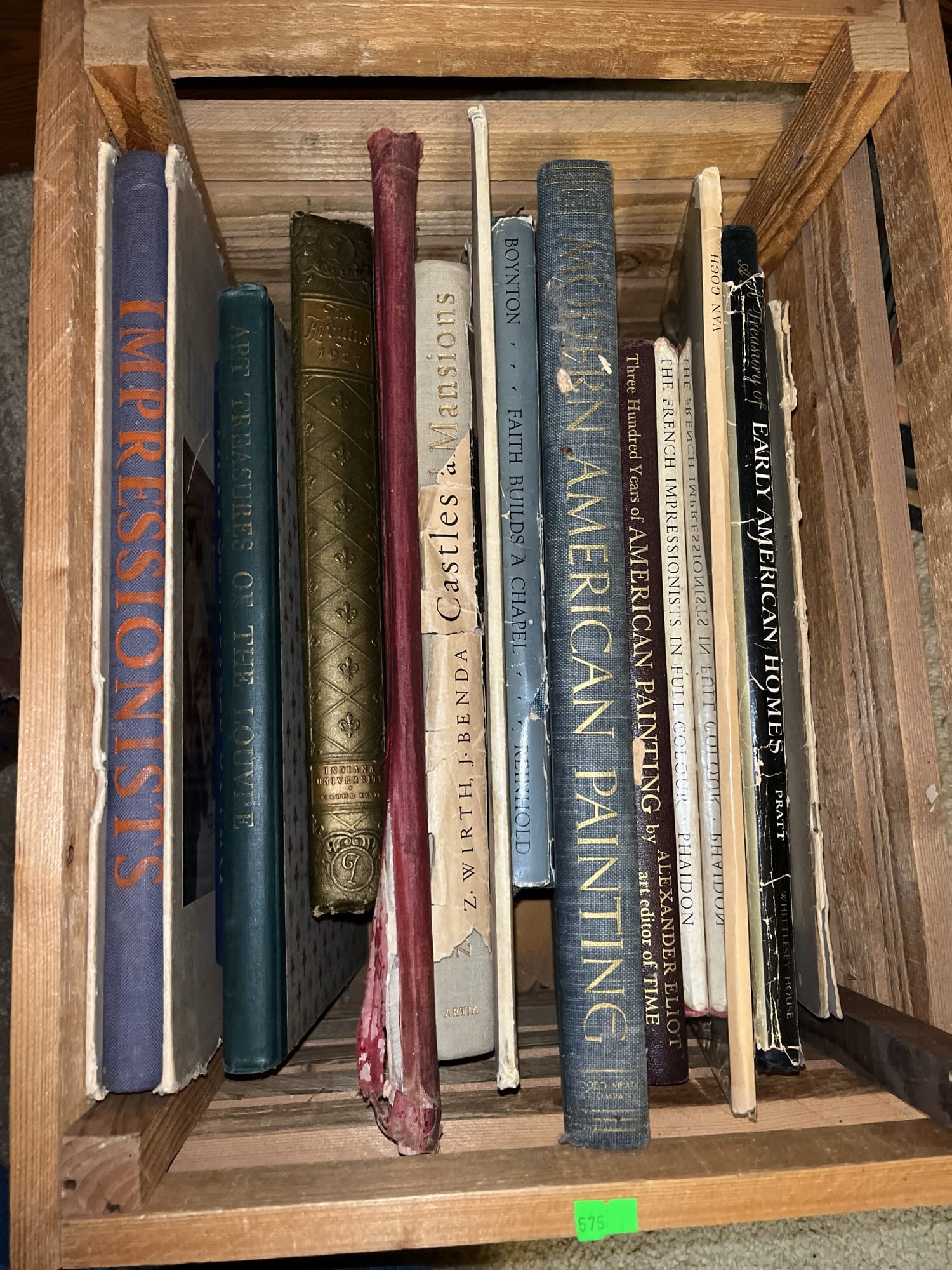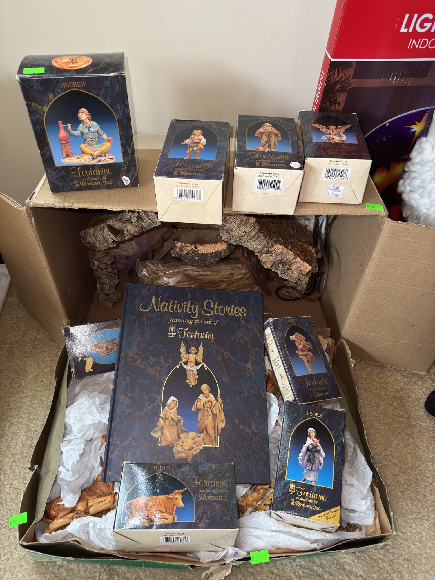 864 Christmas decorations, Seymour Mann porcelain shoe and box and wood bookcase 30x9 1/2x36