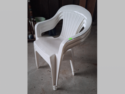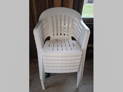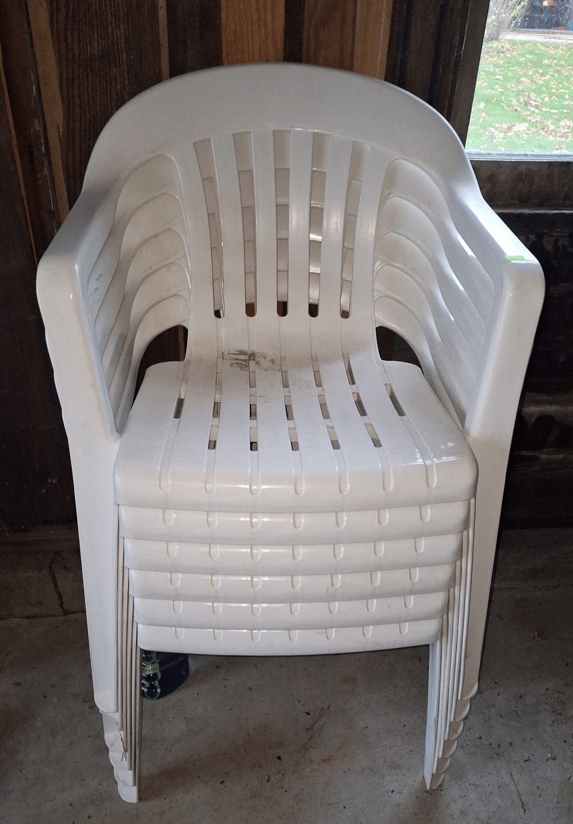 1012 6 Plastic stackable chairs, round patio table and 7 1/2 ft umbrella