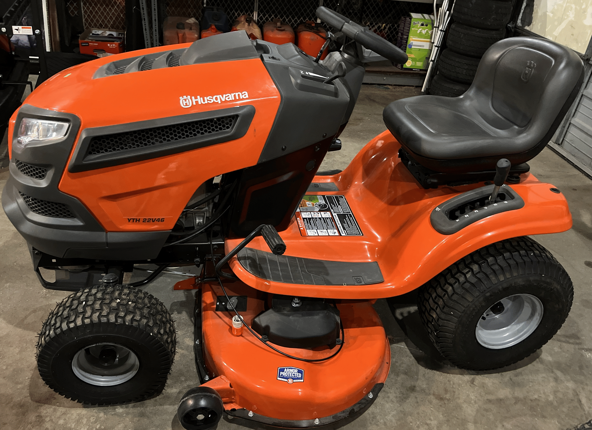 11 Husqvarna YTH 22V46 Riding Lawnmower, 0.2 Hours , 46" Deck (Has Crack on Rear End, Still Operates)