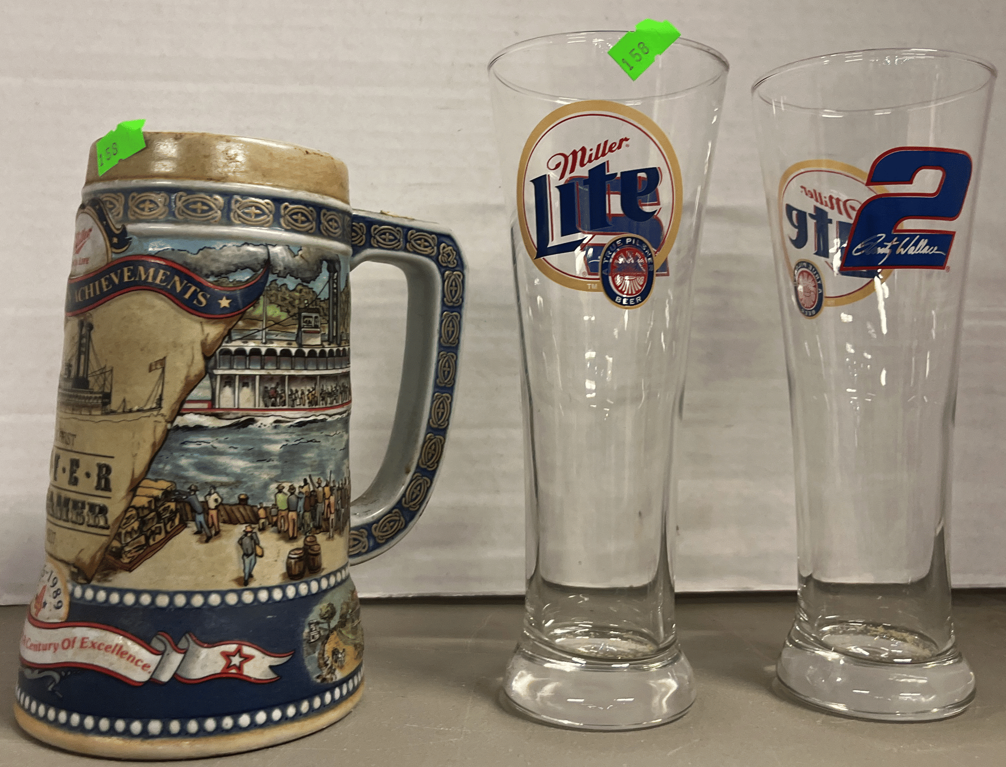 158 Miller High Life River Steamer Stein, (2) Miller Beer Glasses
