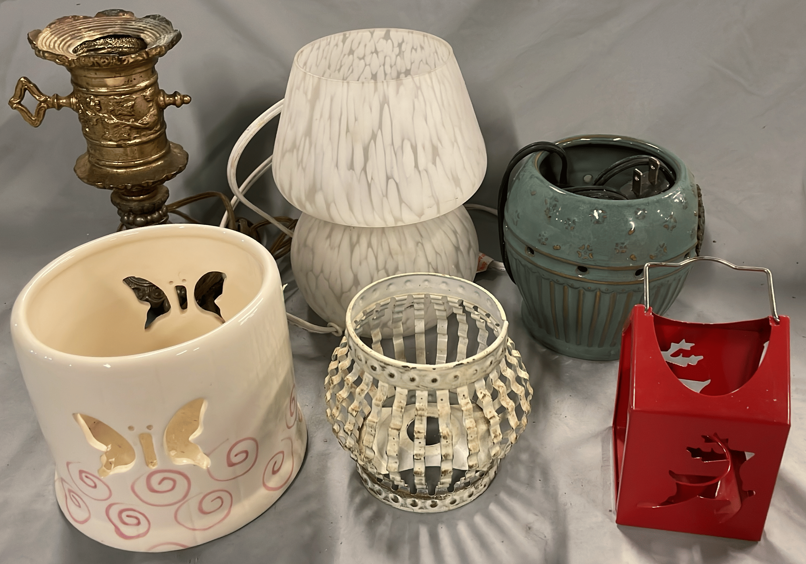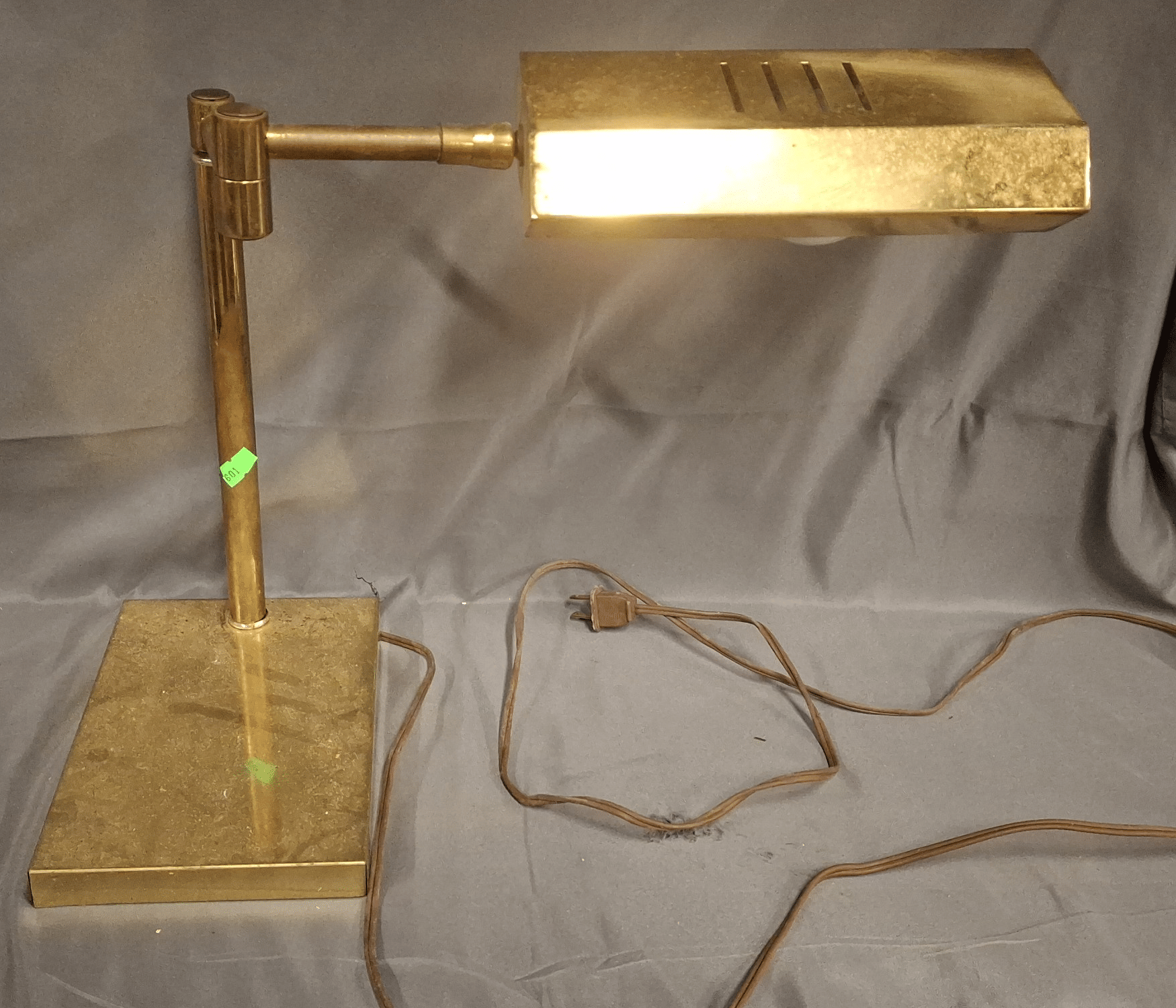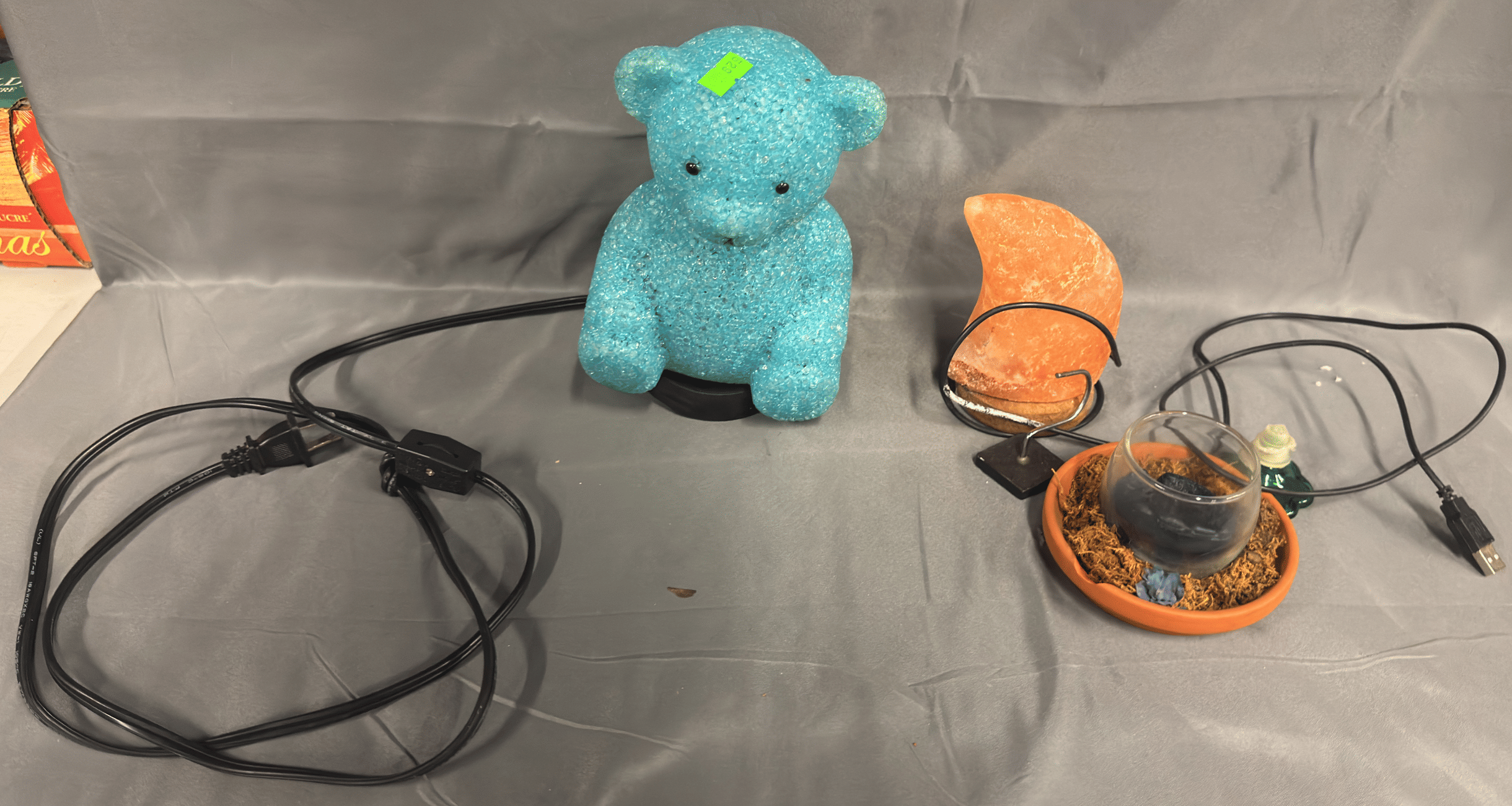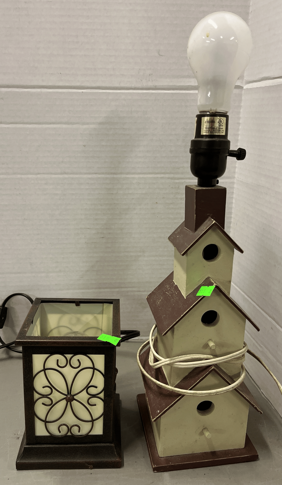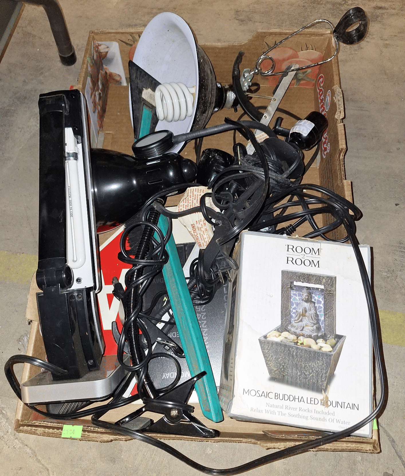 1164 Desk lamp assortment, mosaic Buddha fountain, shop light, snow scrapper