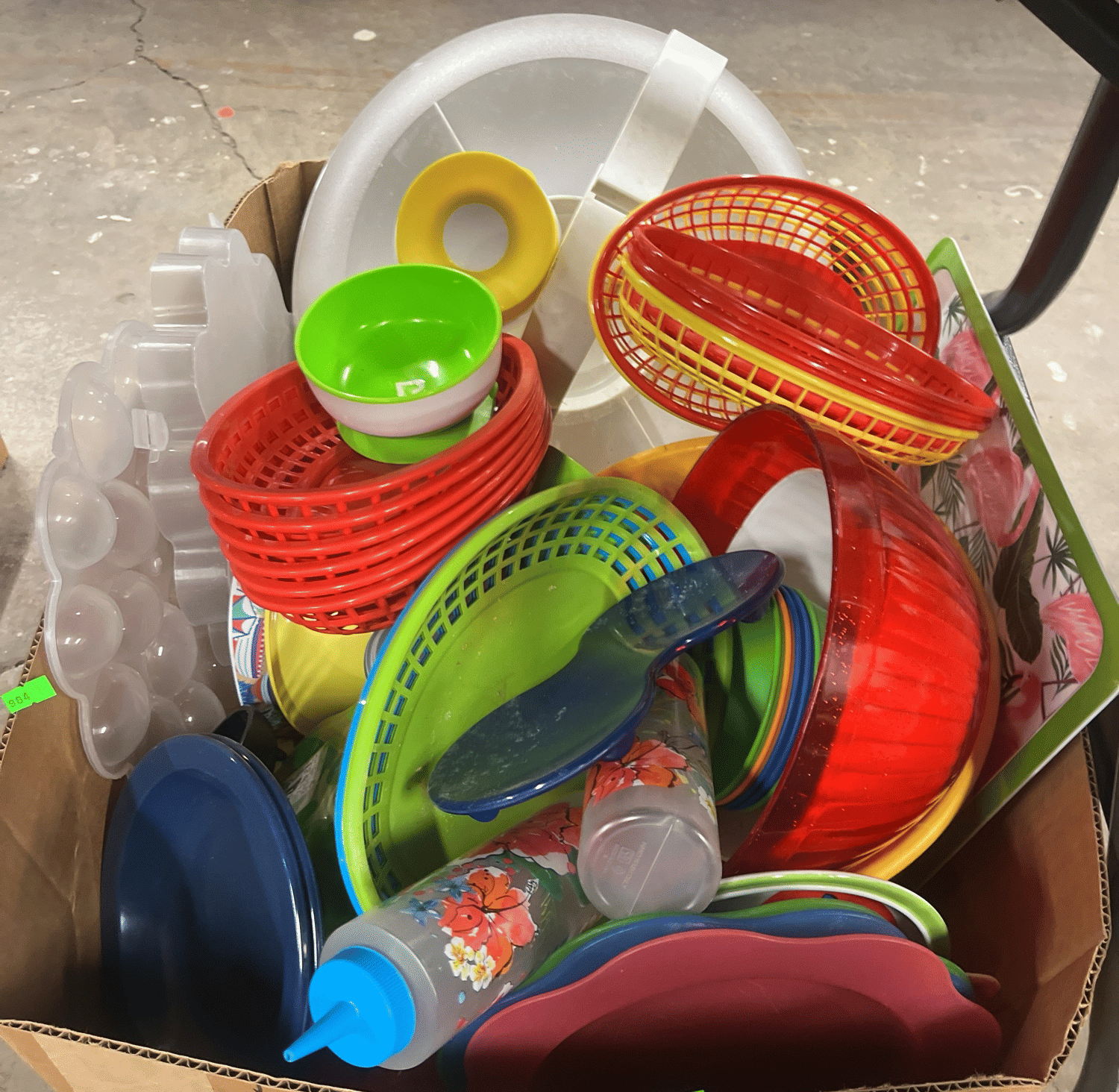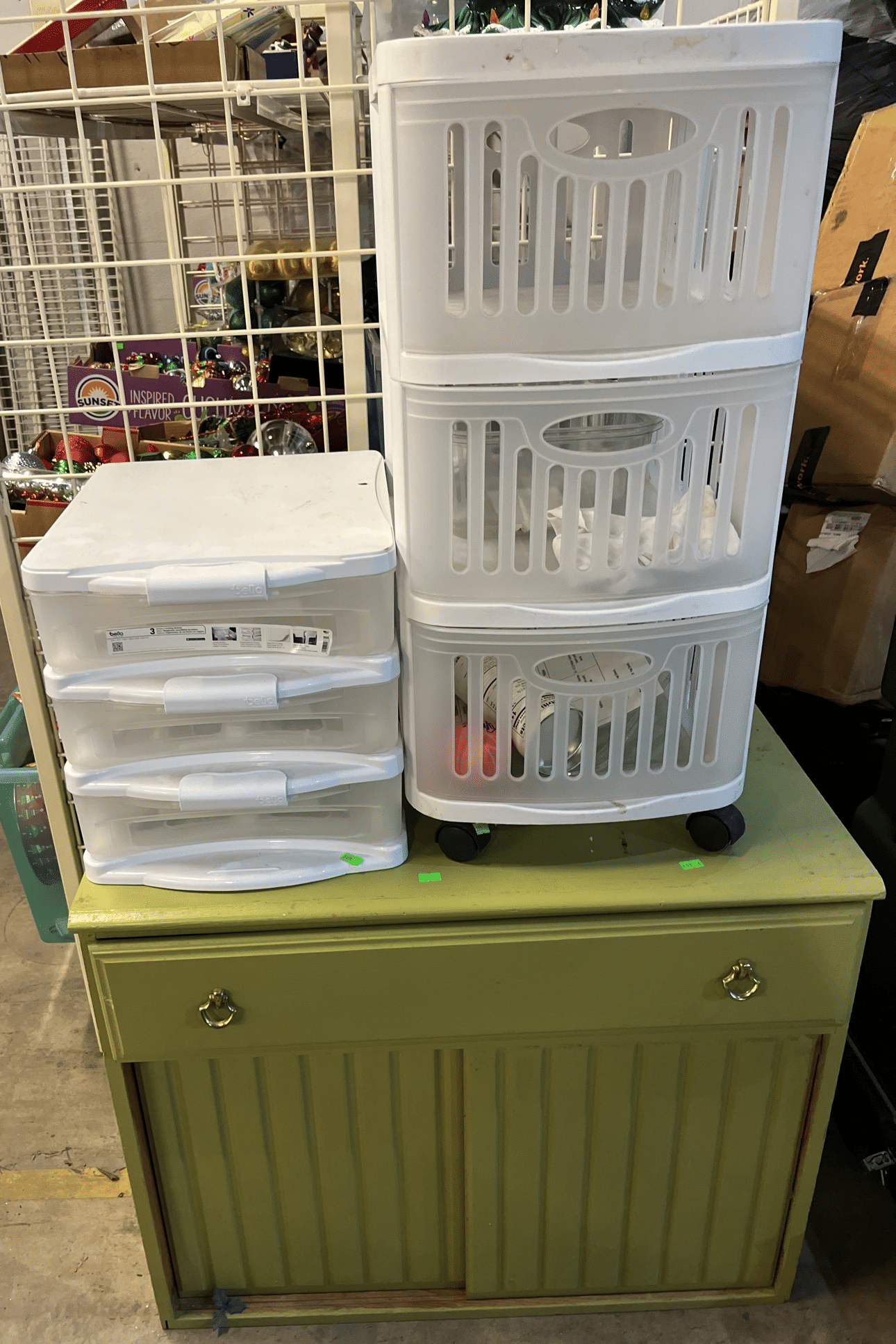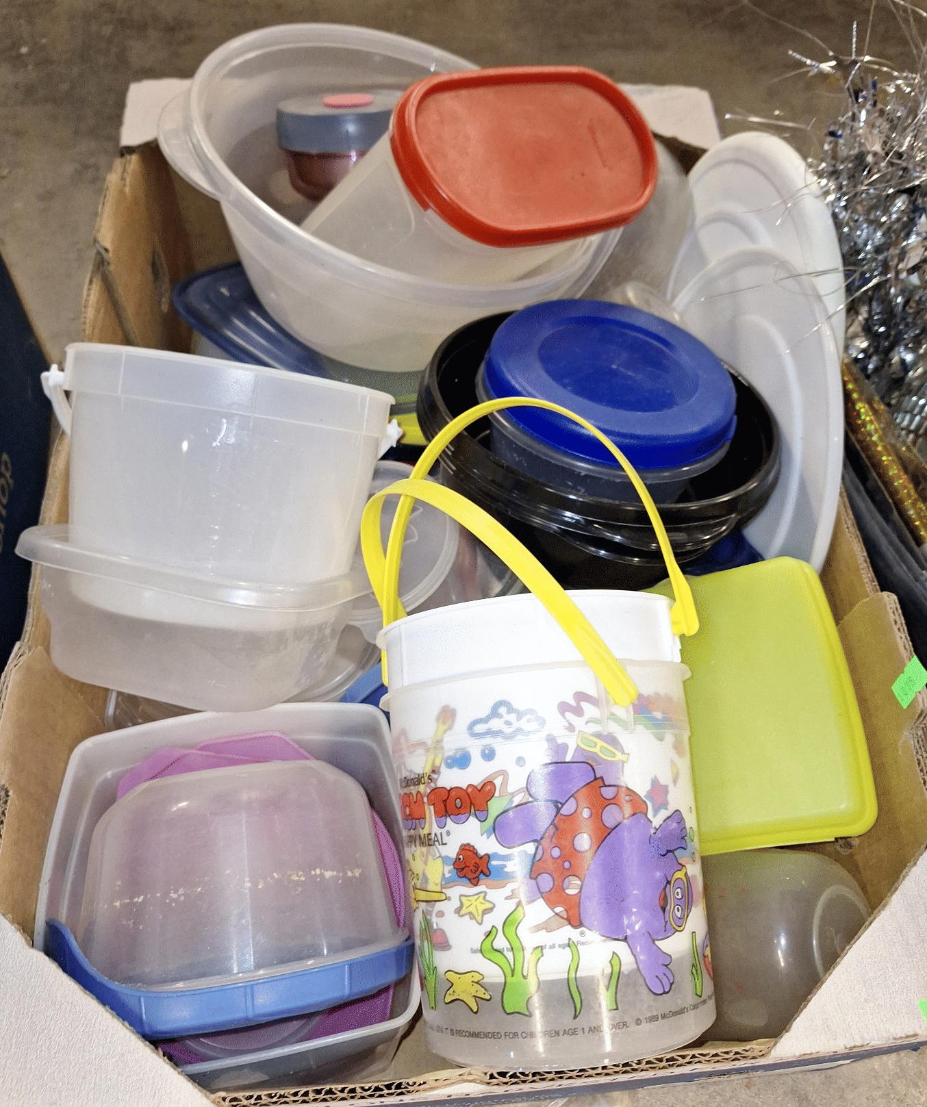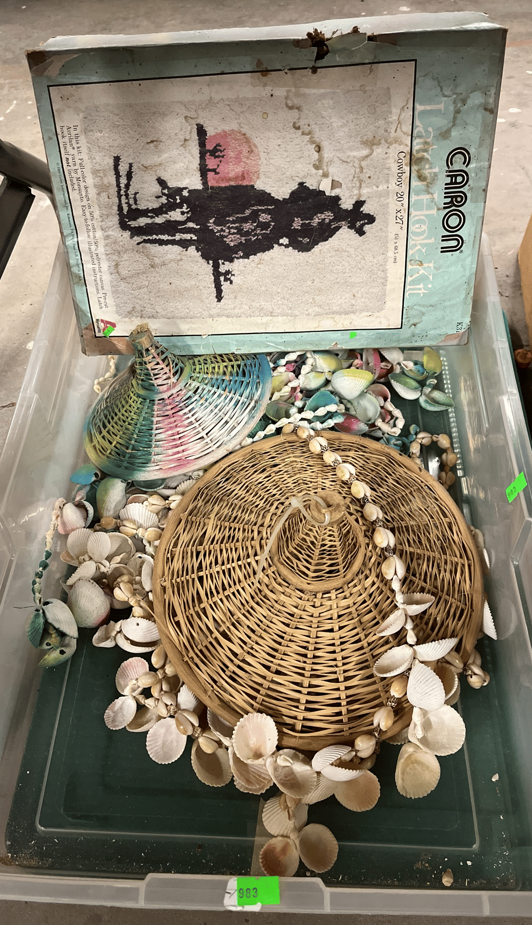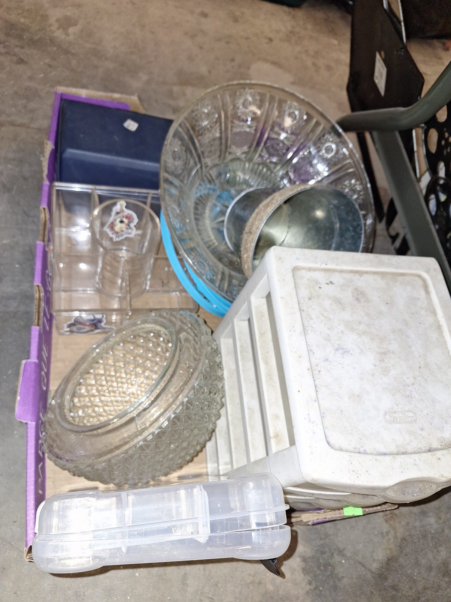 1158 Plastic organizers, hoops, bowl, glass light globe