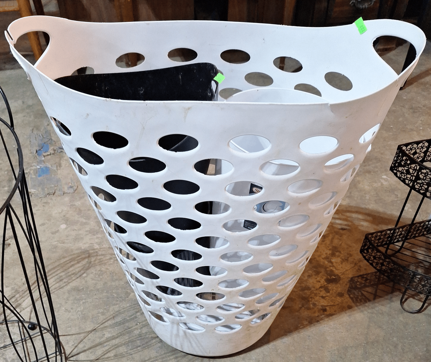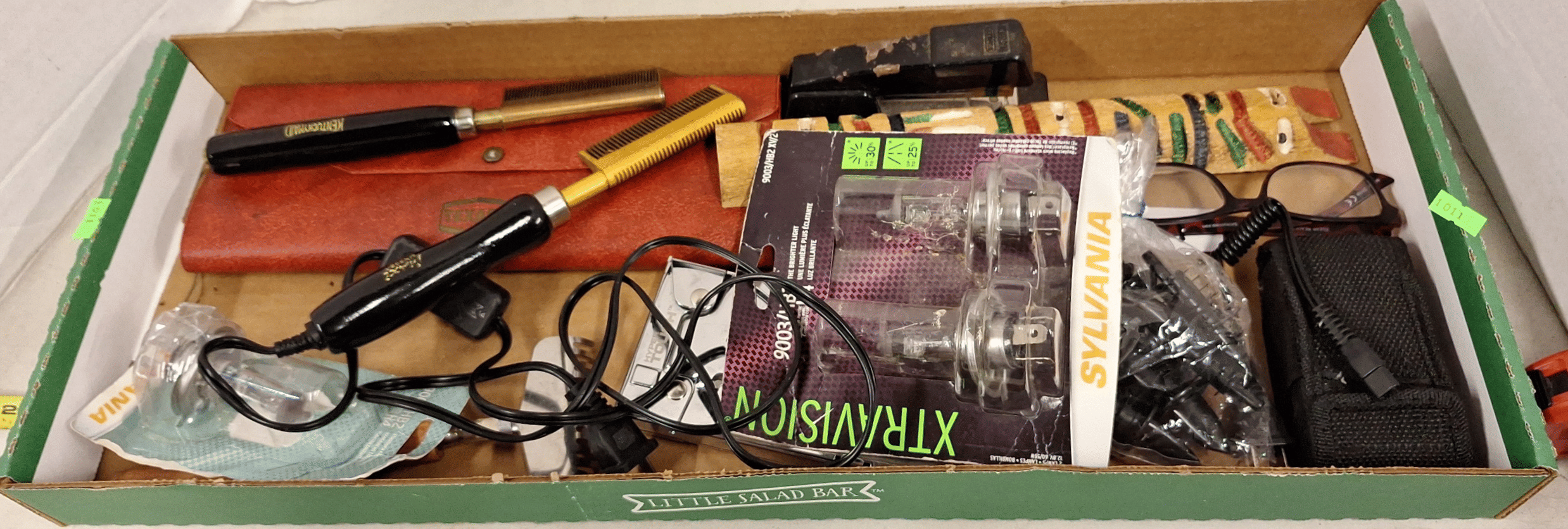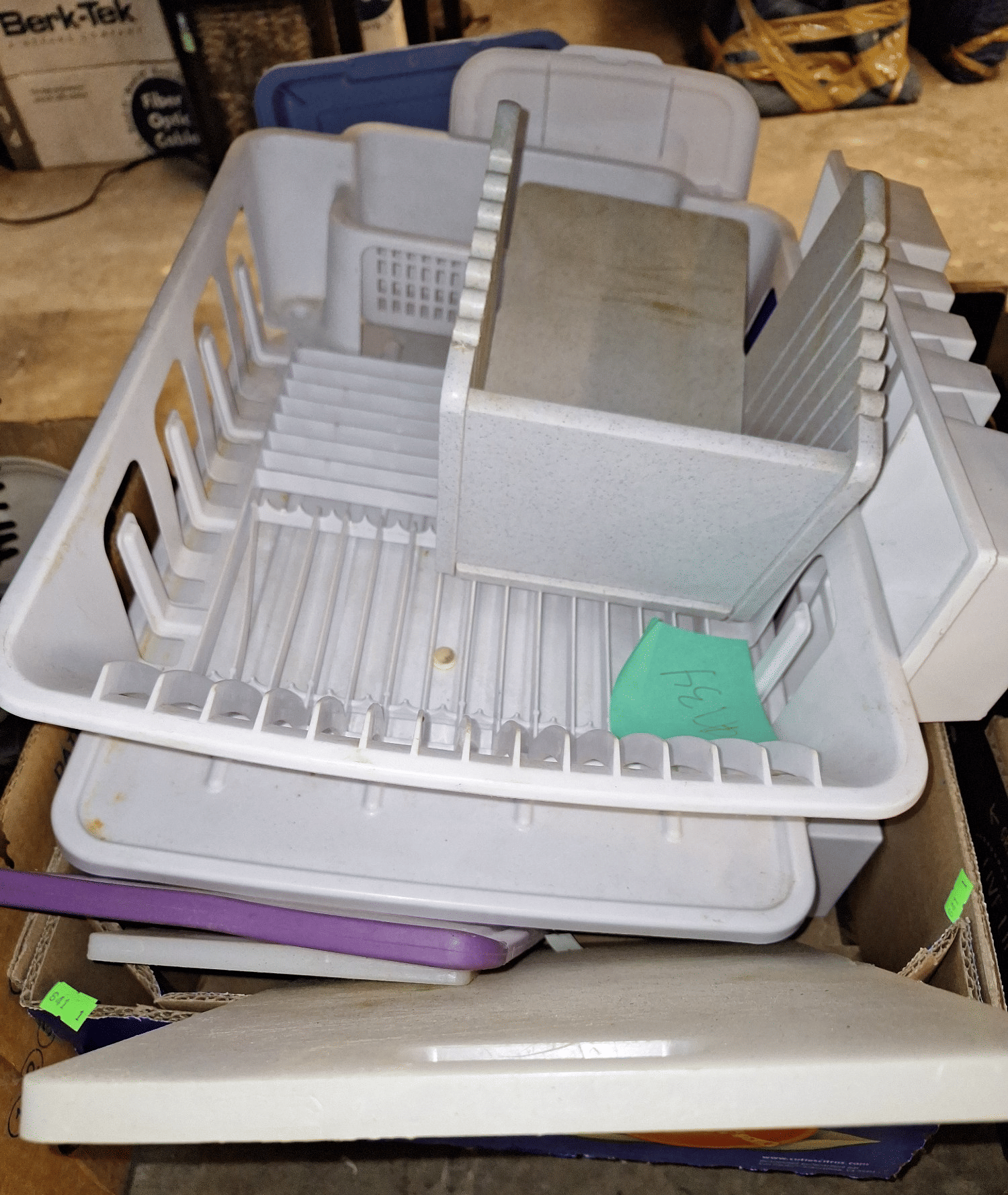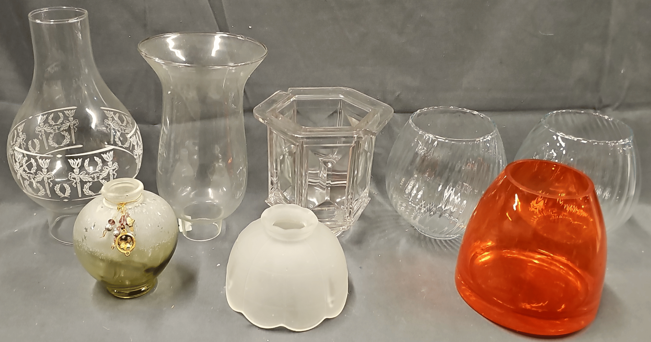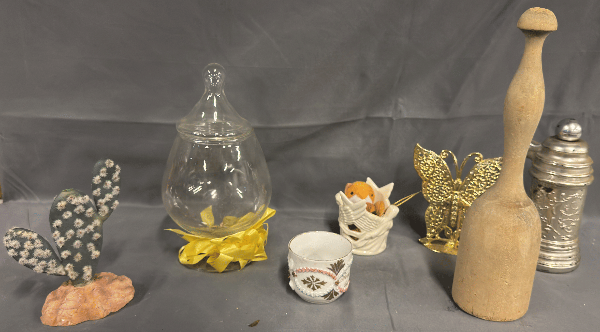 1158 Plastic organizers, hoops, bowl, glass light globe