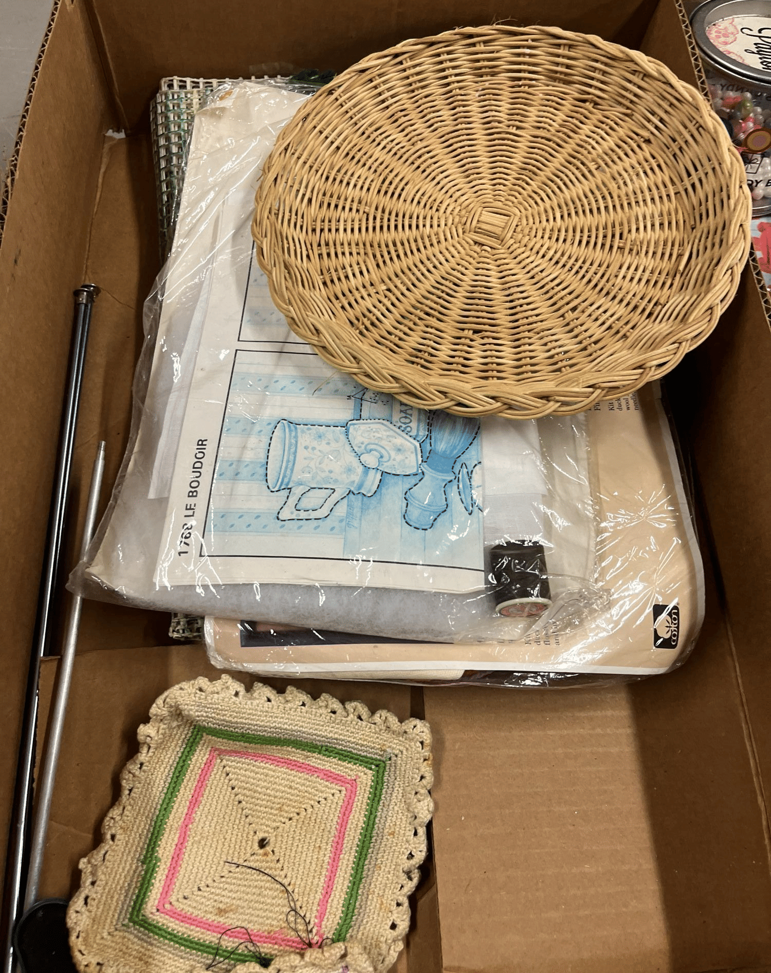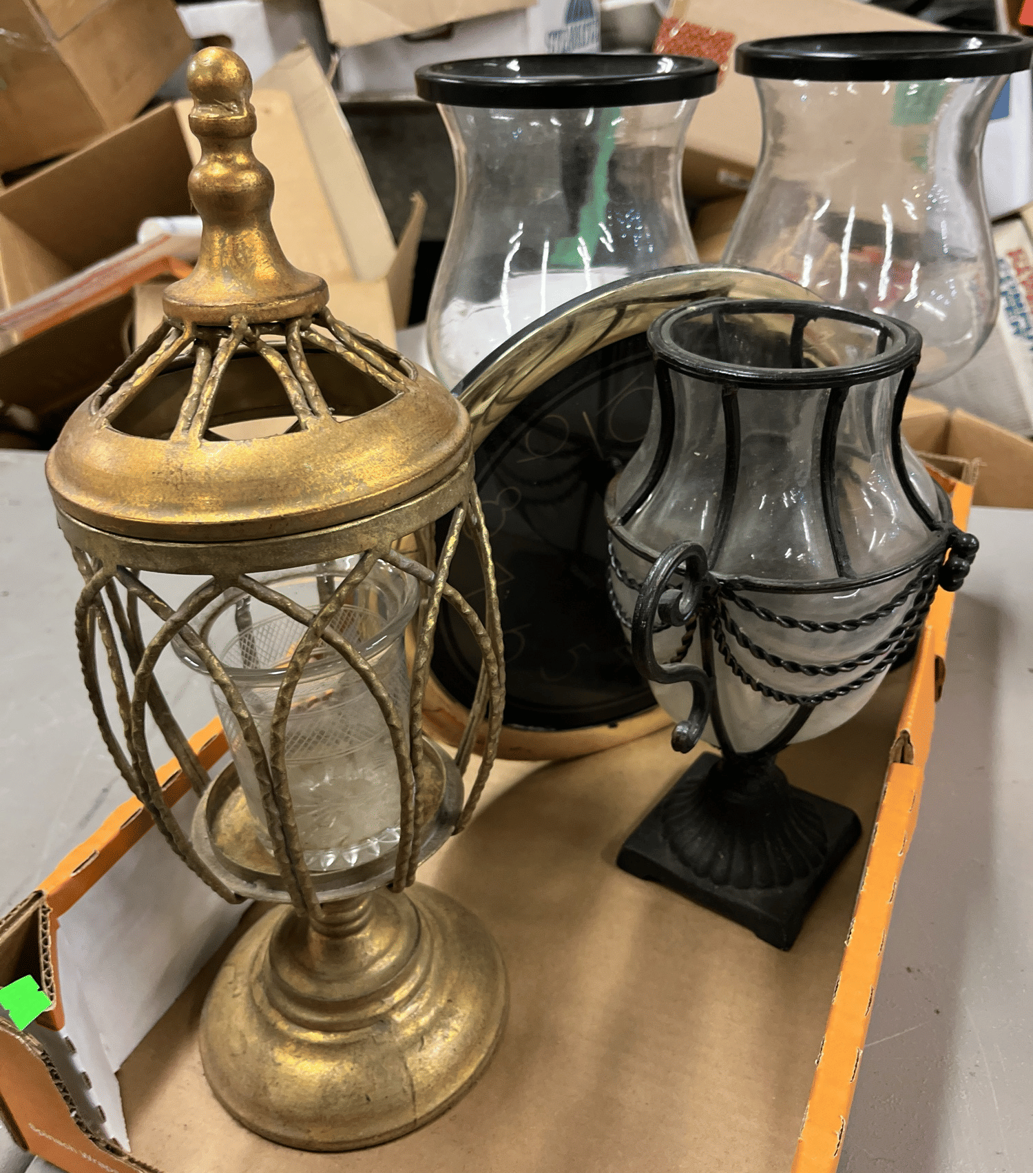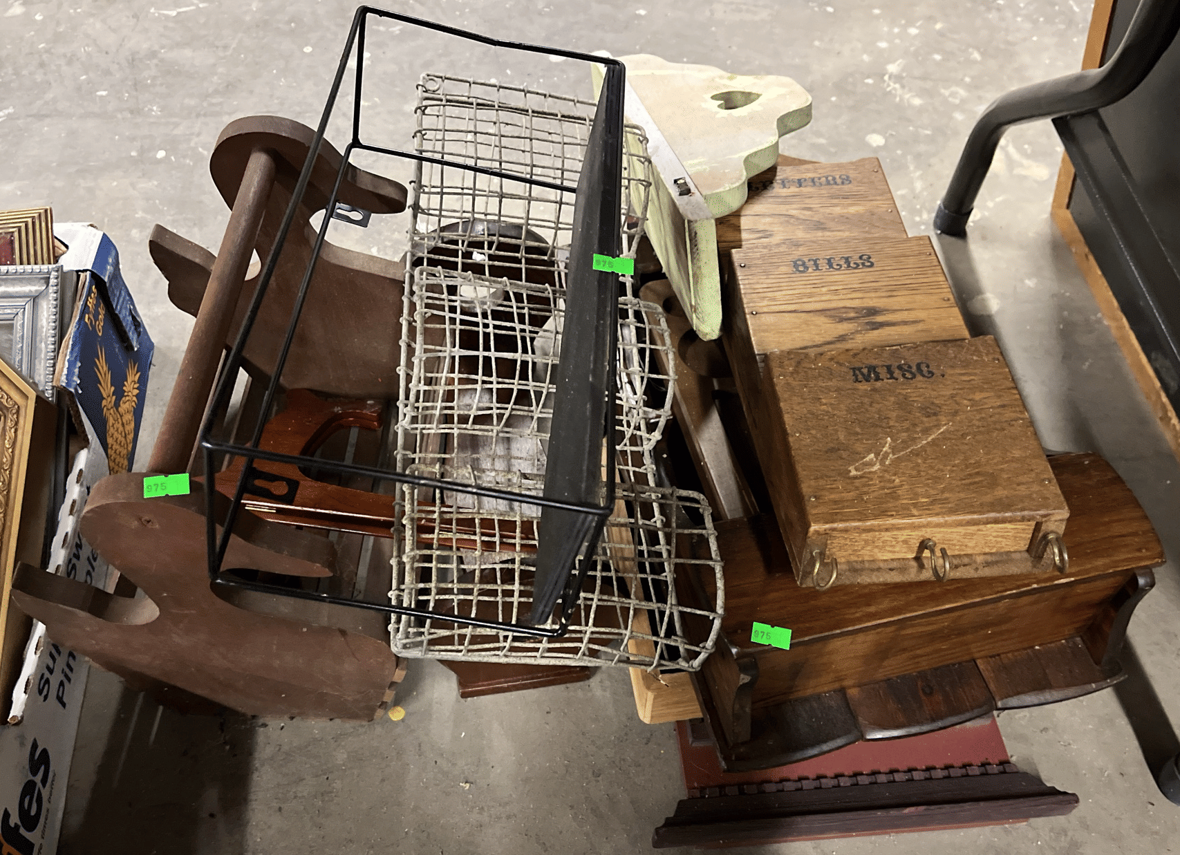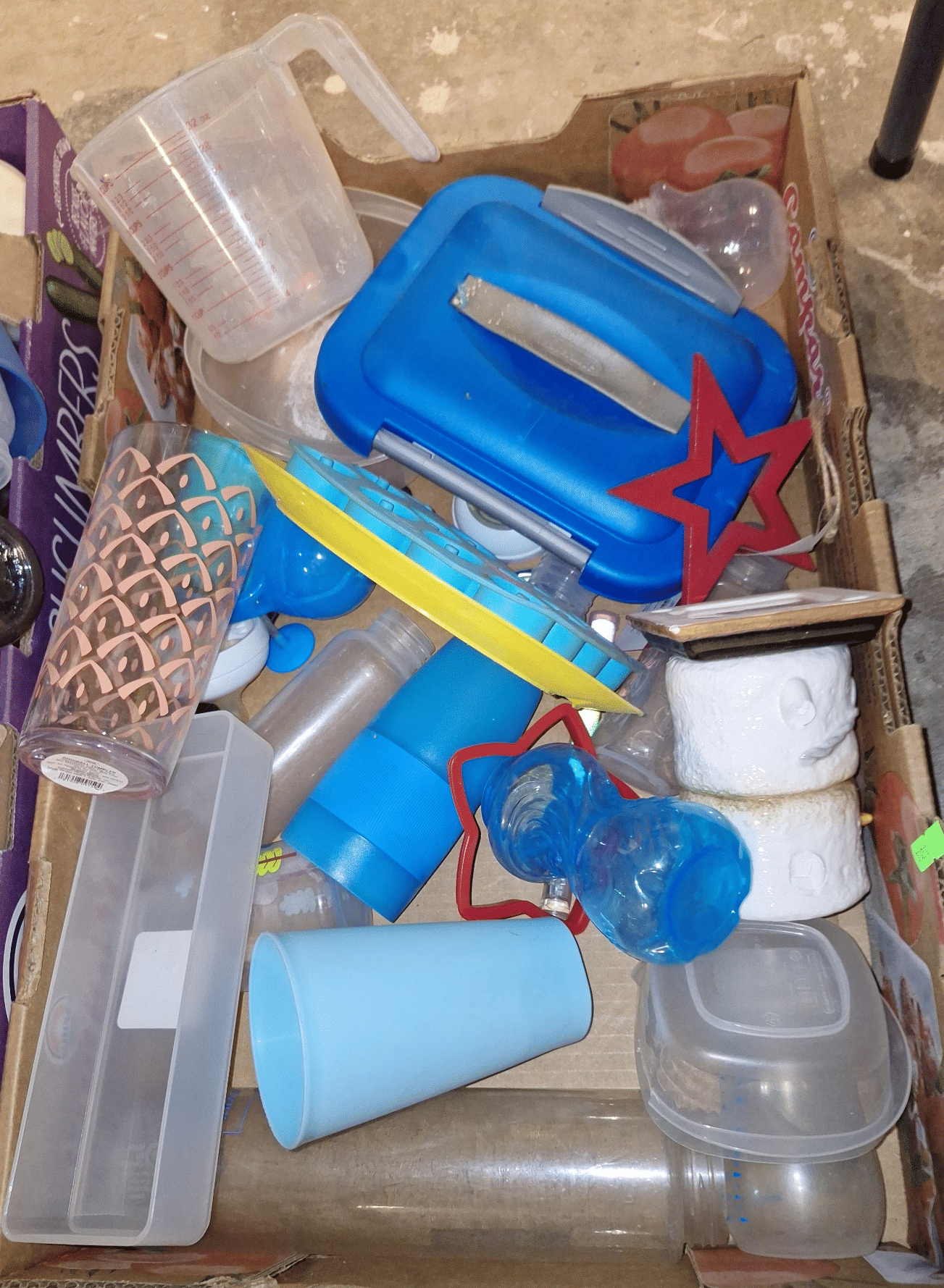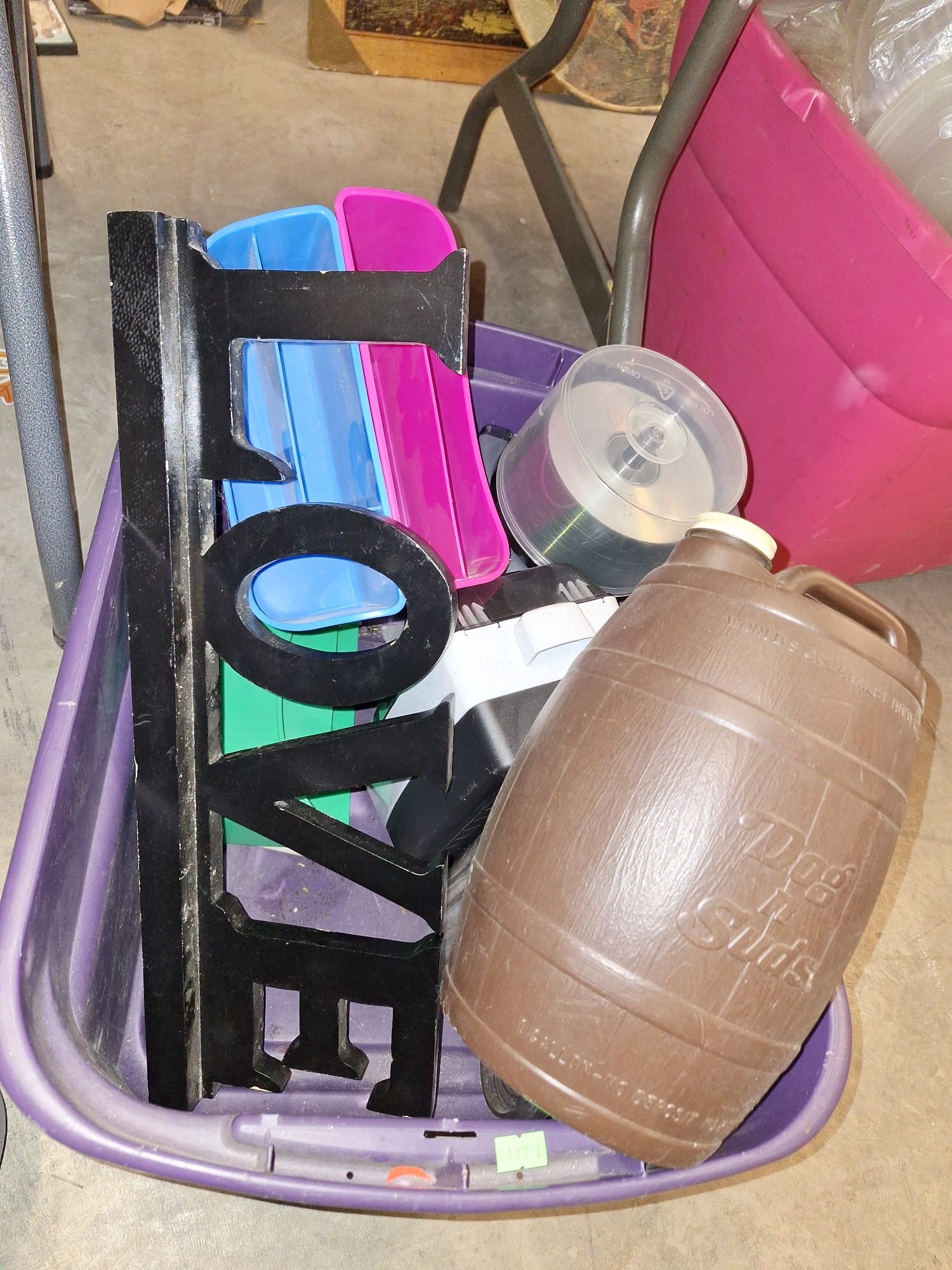 1158 Plastic organizers, hoops, bowl, glass light globe
