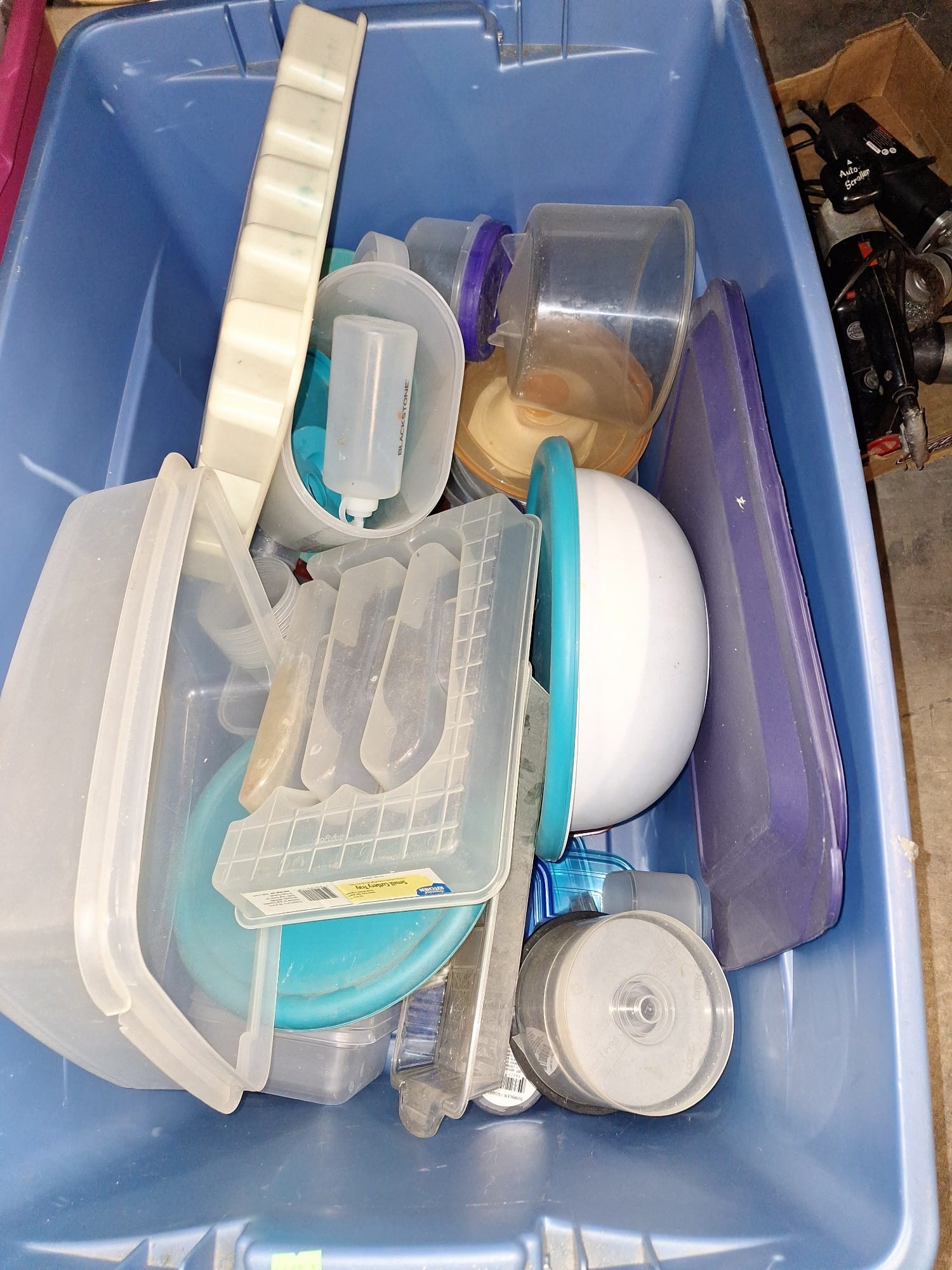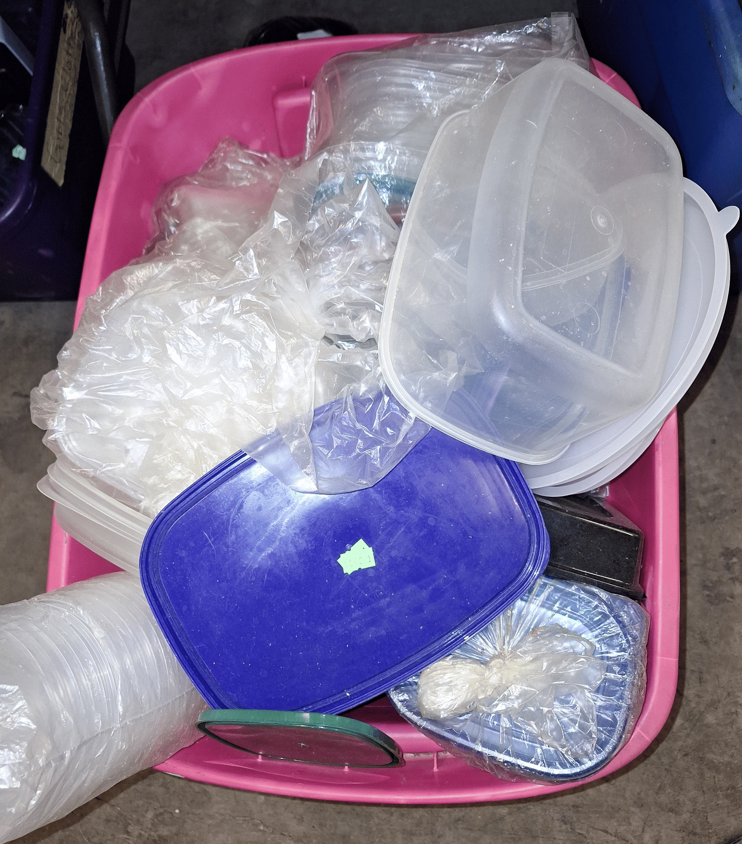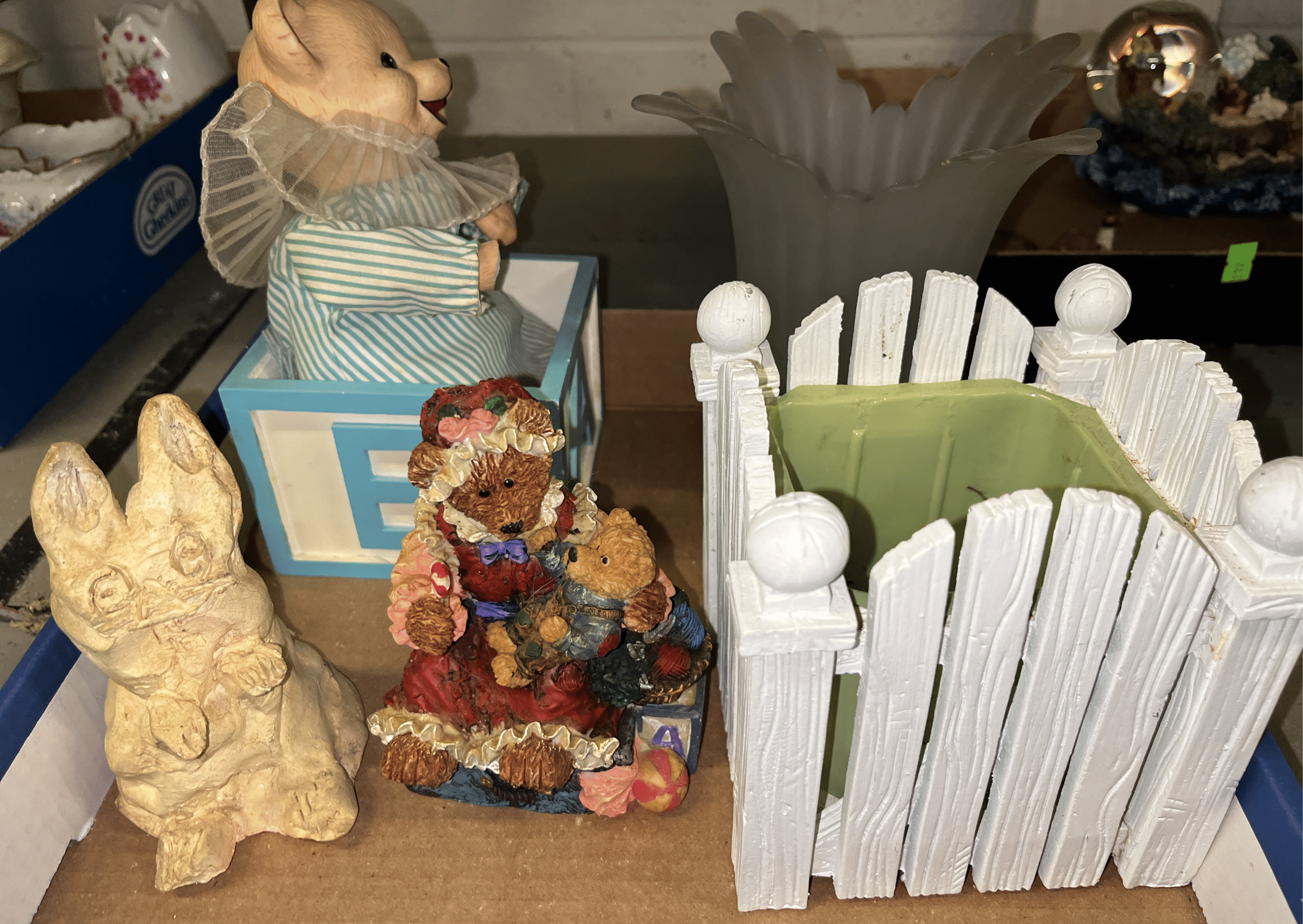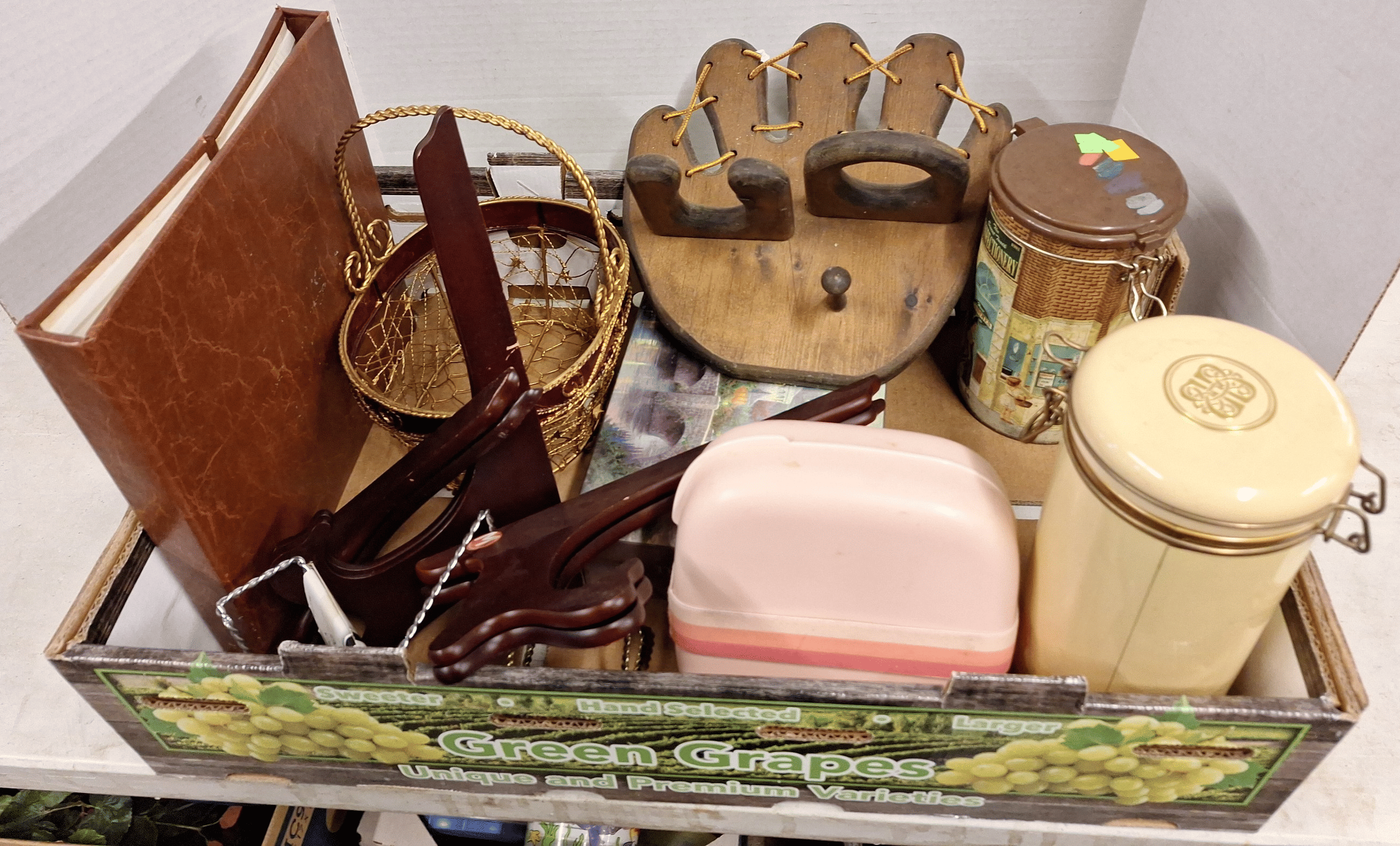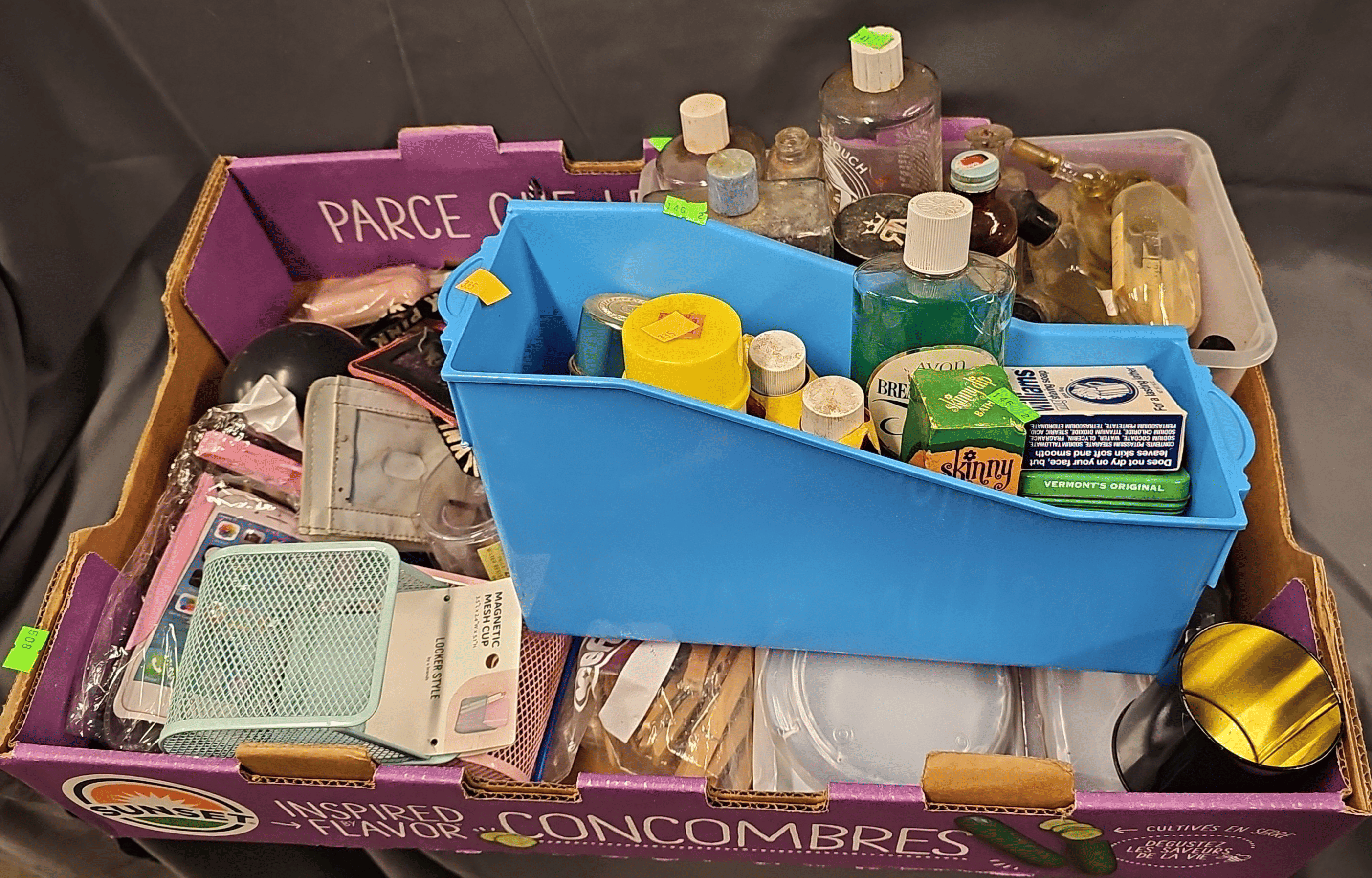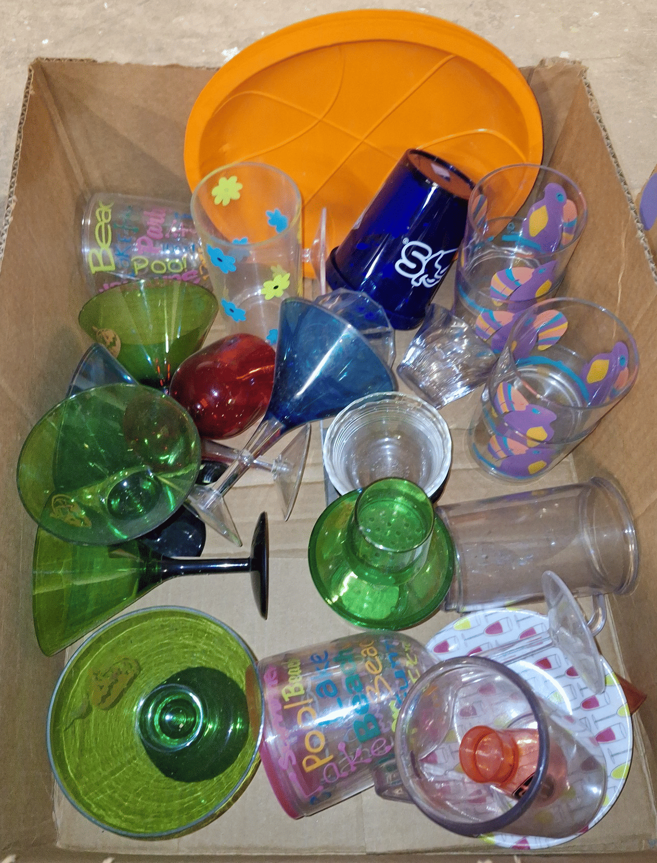 1158 Plastic organizers, hoops, bowl, glass light globe