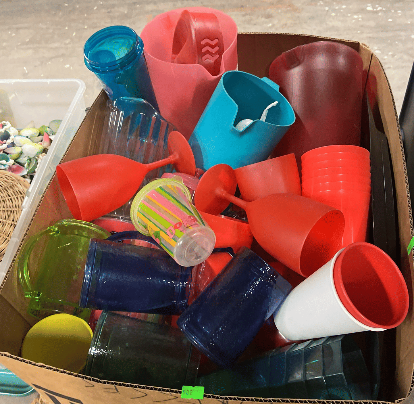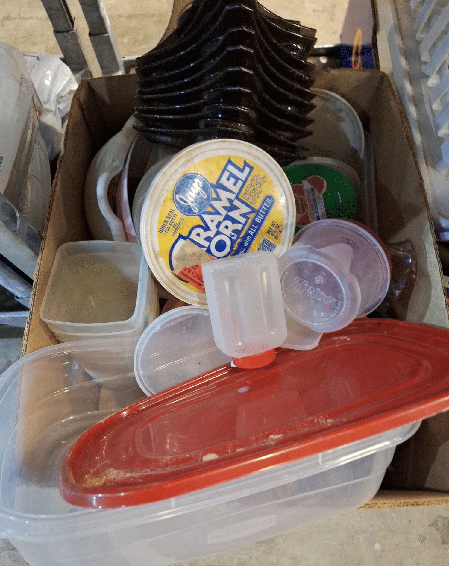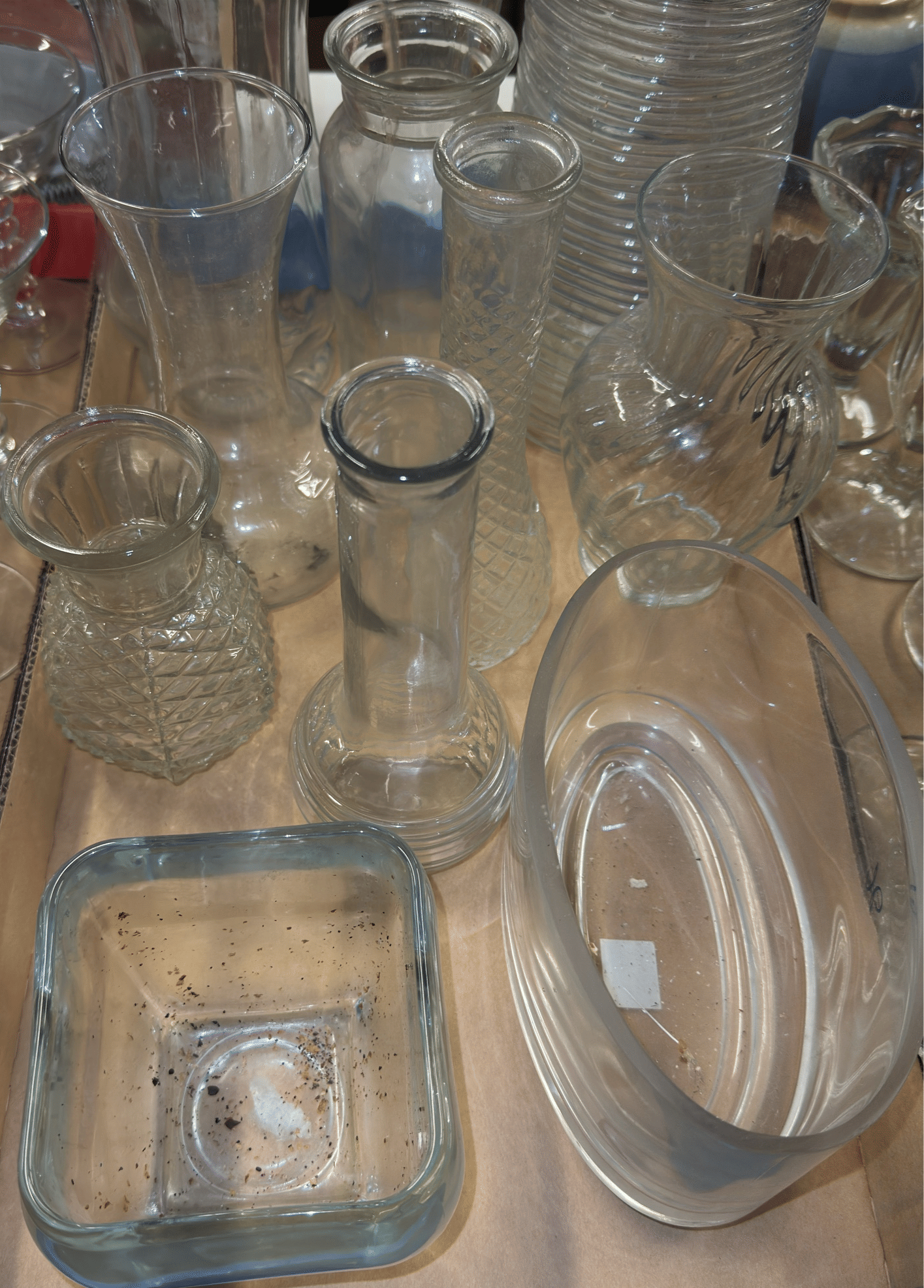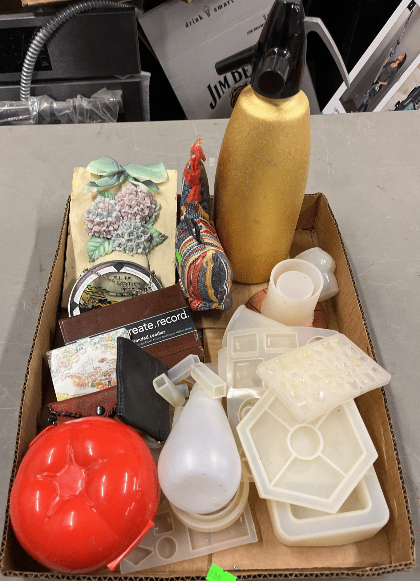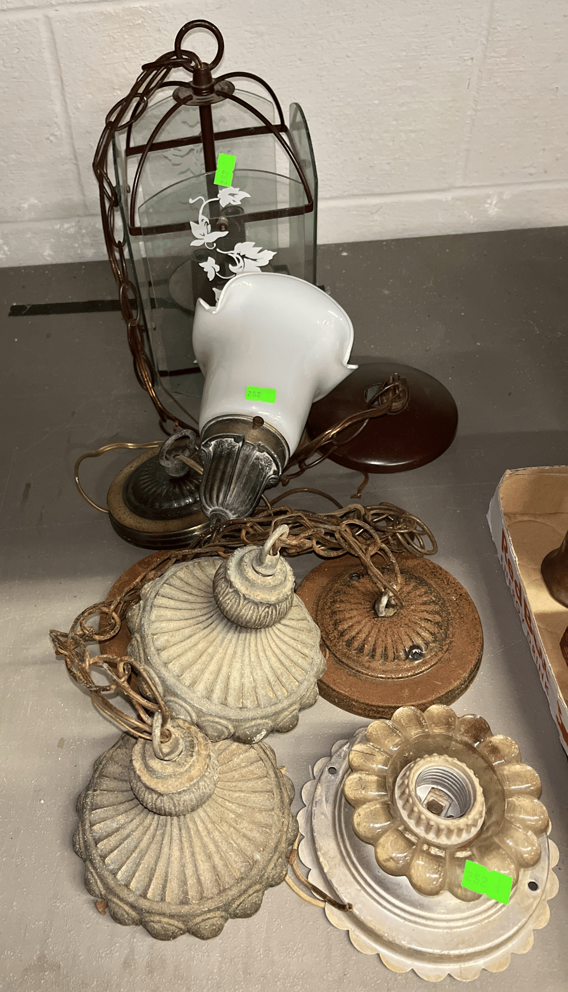 1158 Plastic organizers, hoops, bowl, glass light globe