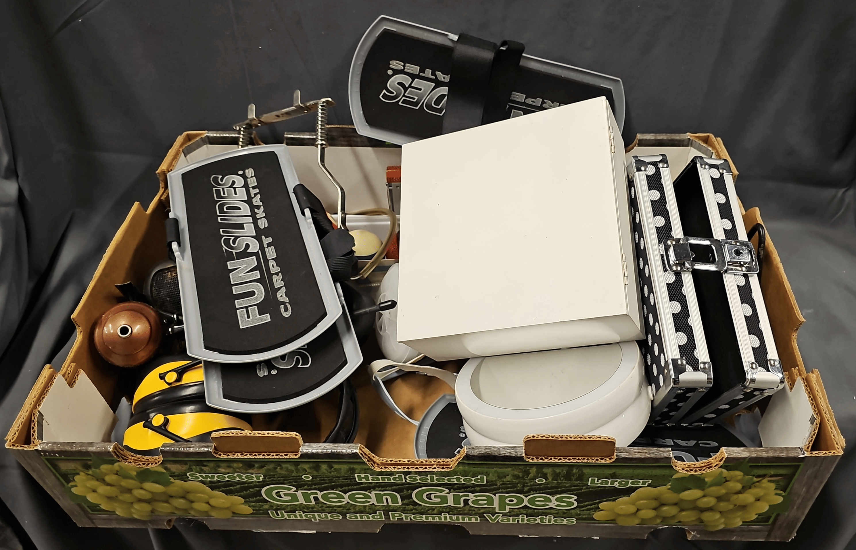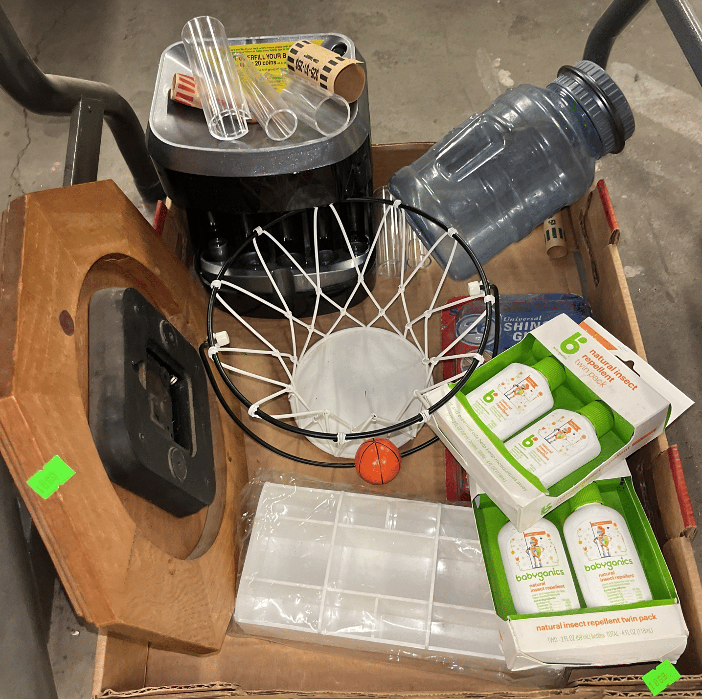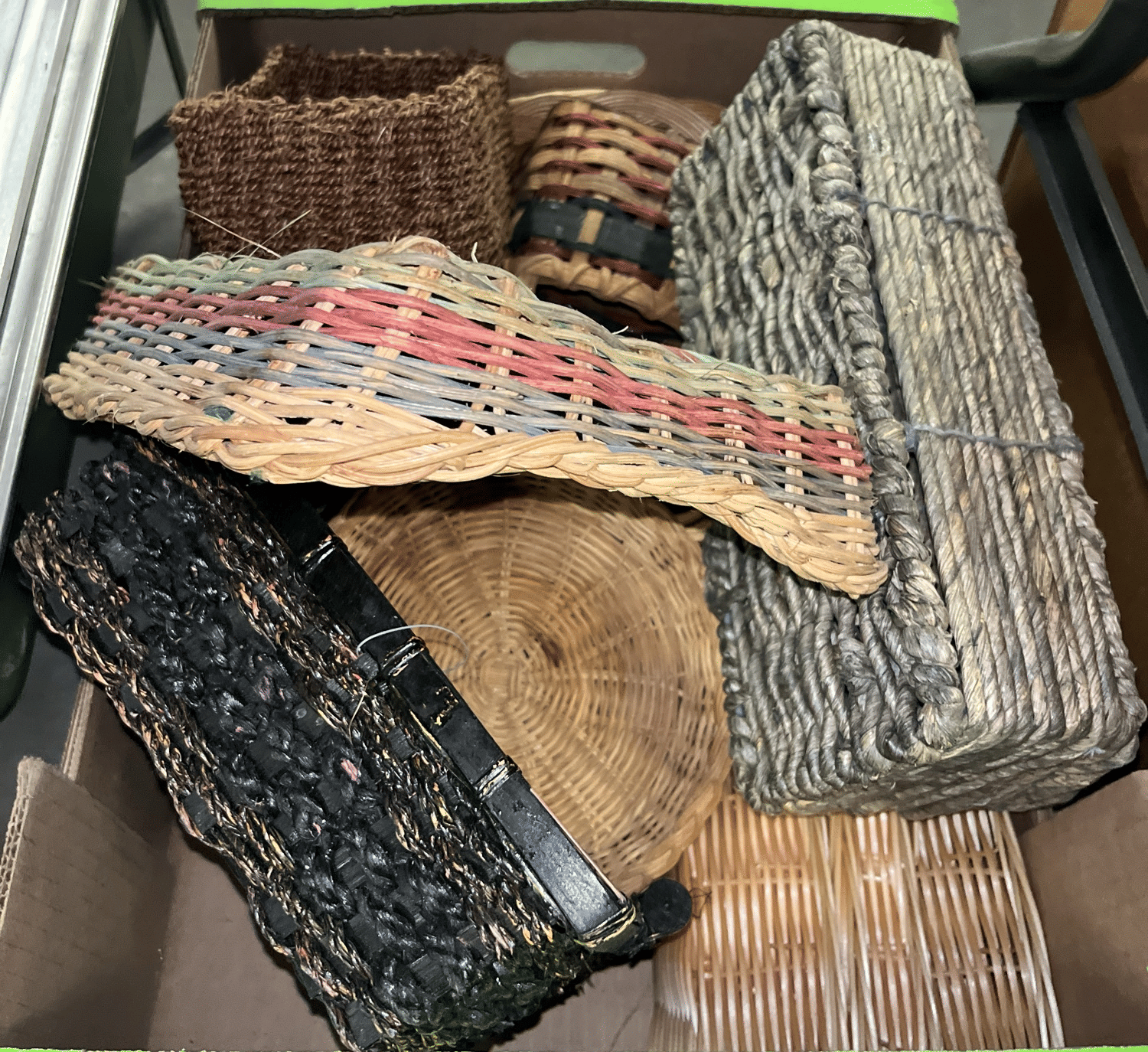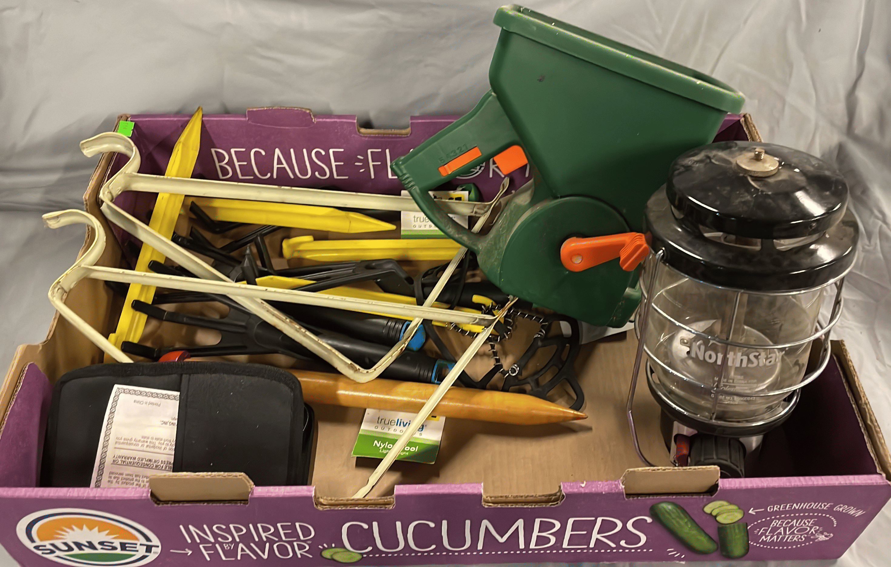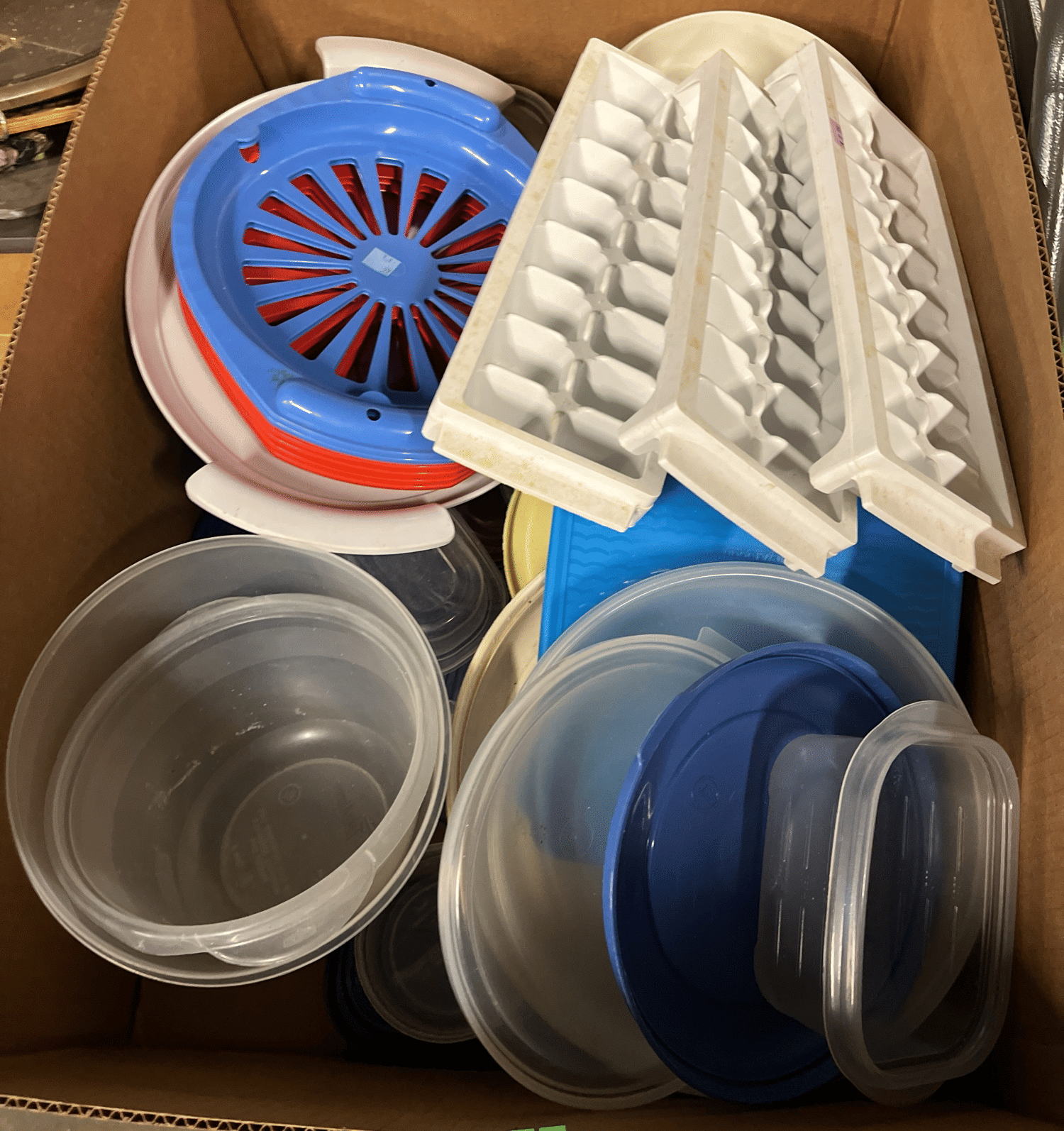 1158 Plastic organizers, hoops, bowl, glass light globe