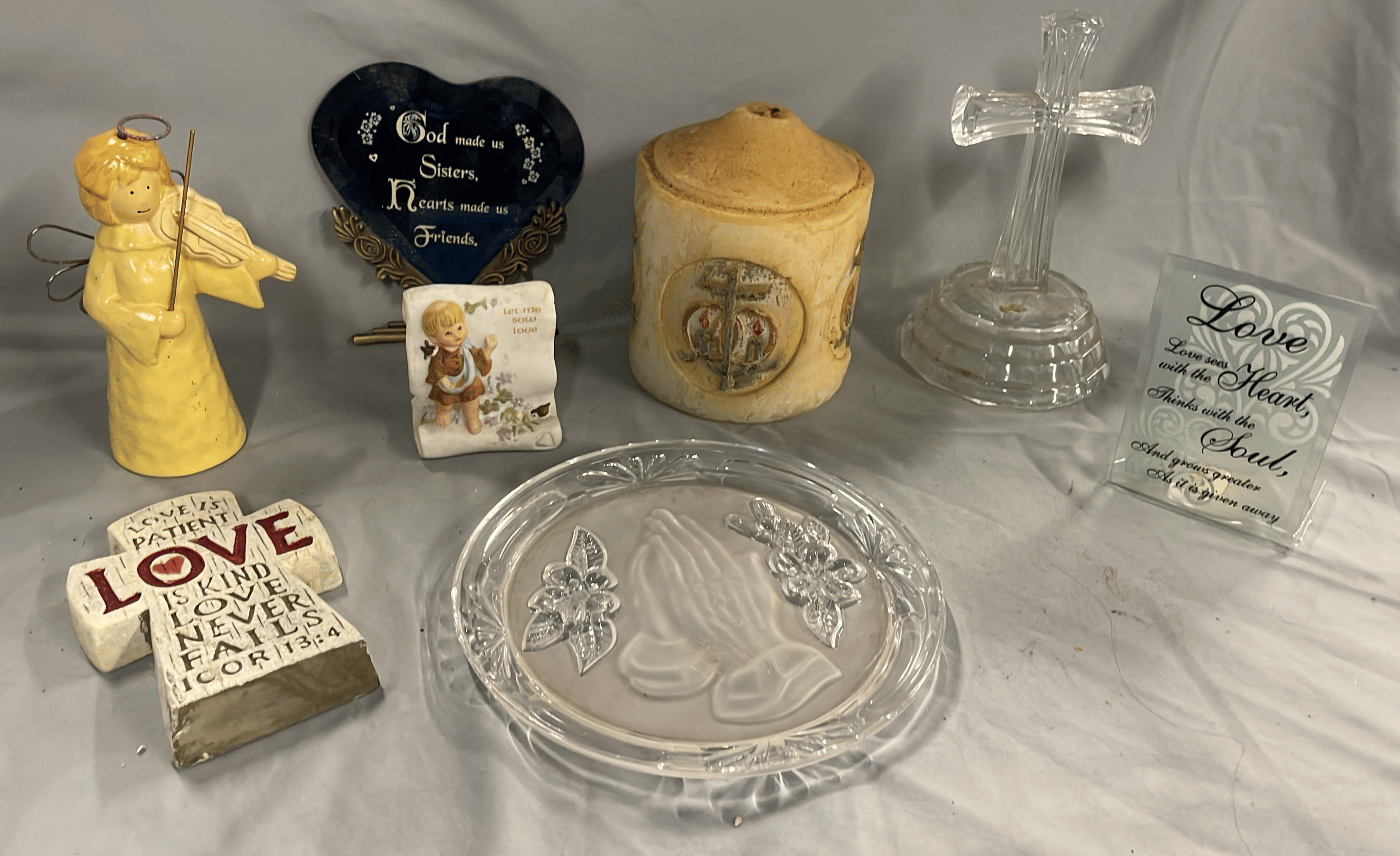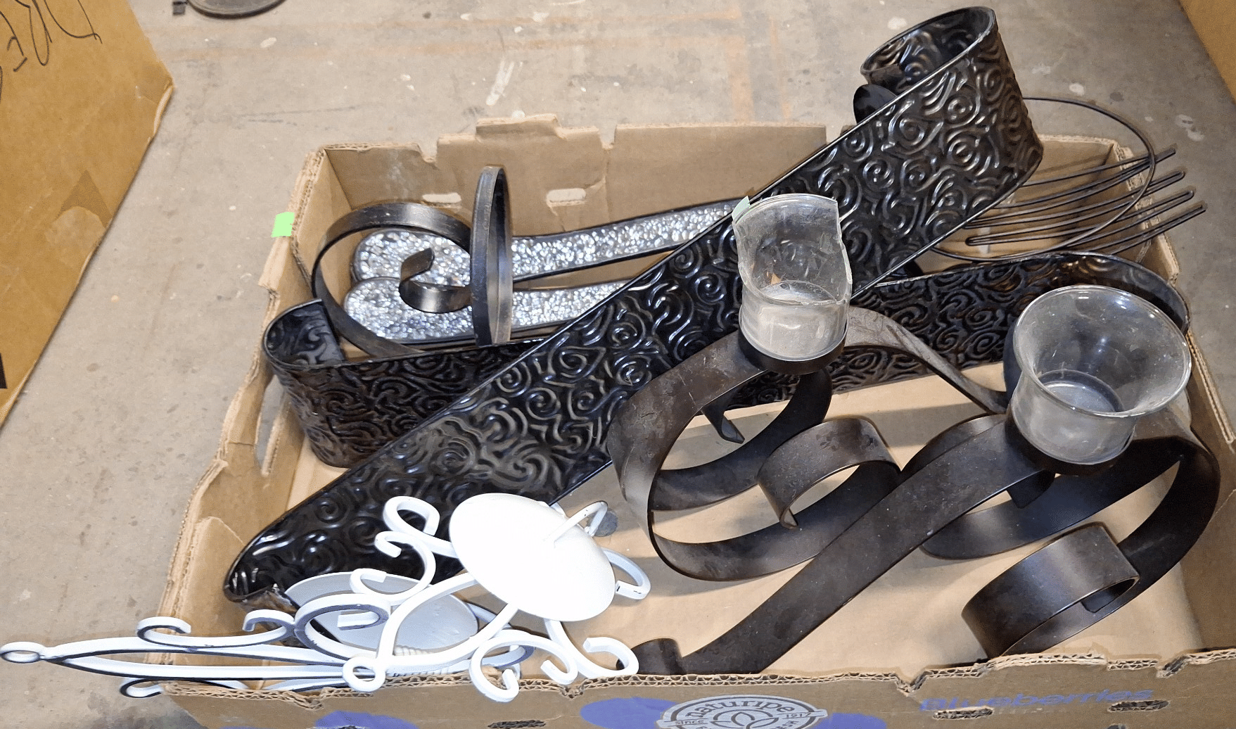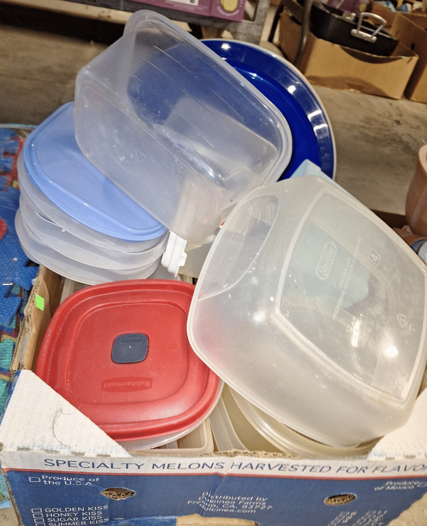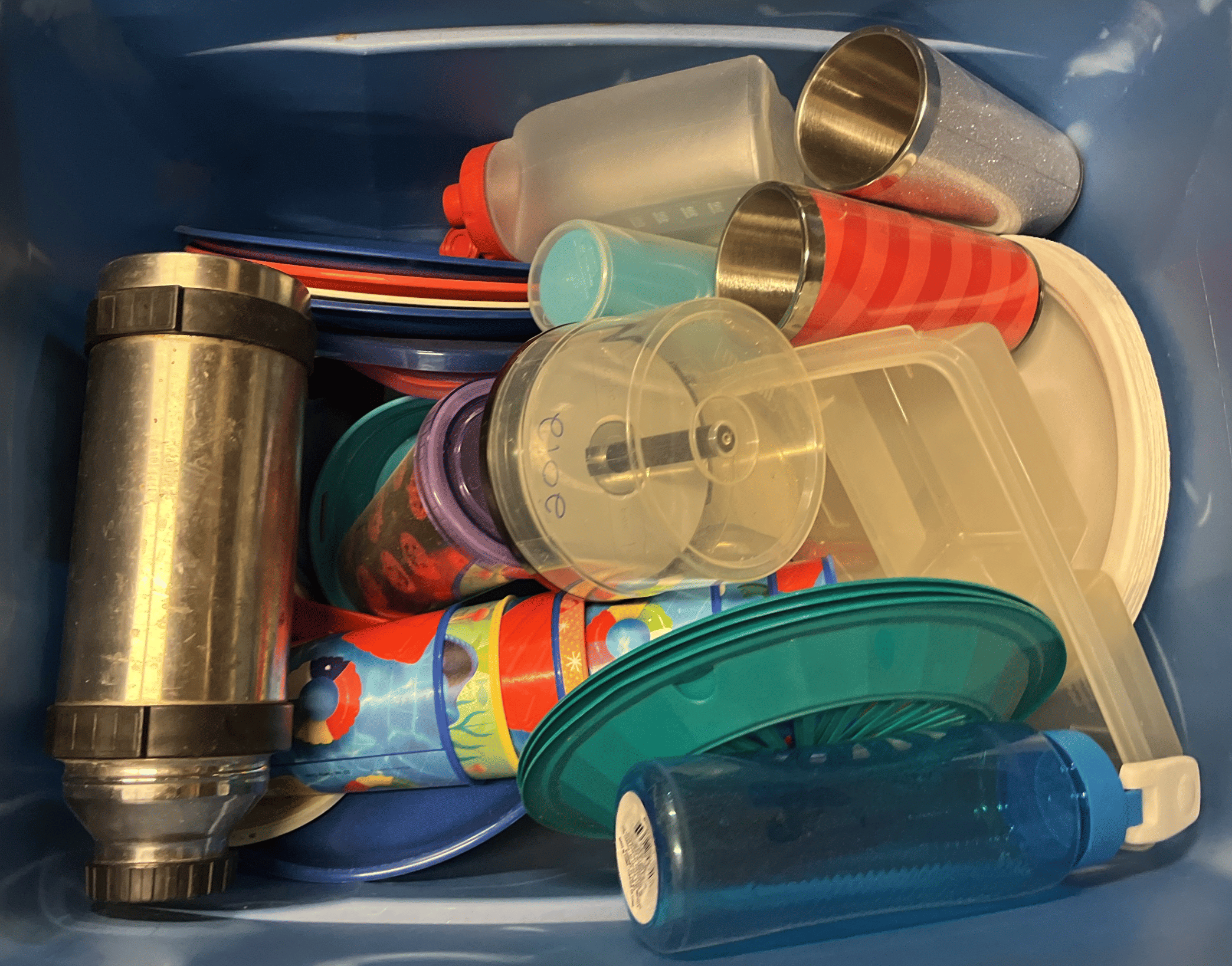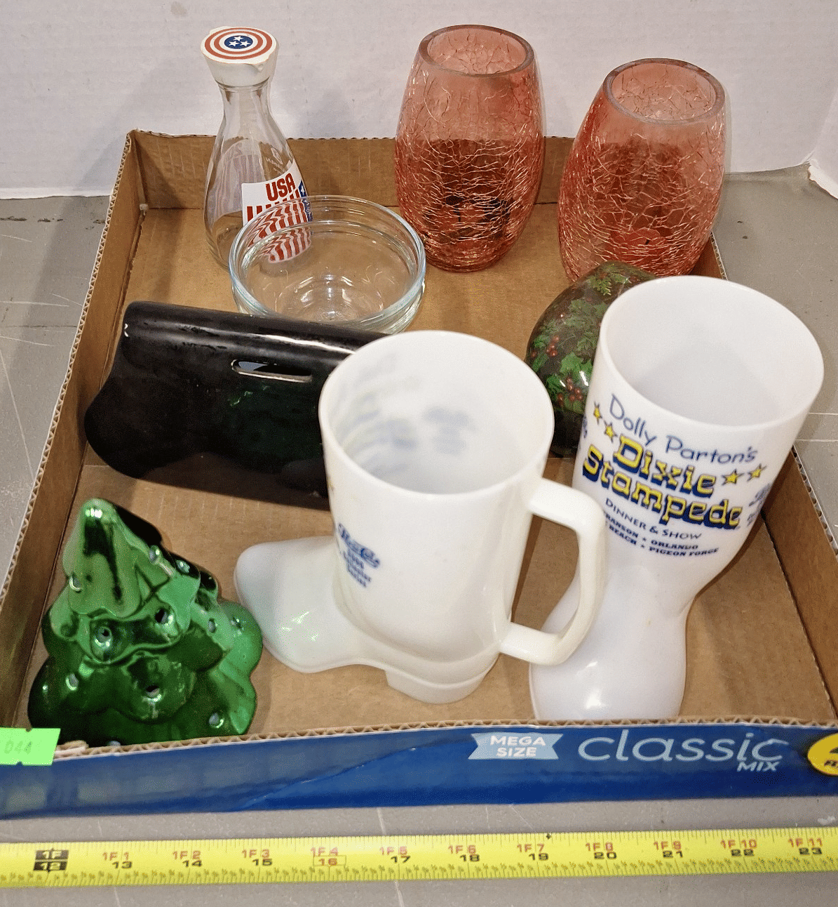 1158 Plastic organizers, hoops, bowl, glass light globe