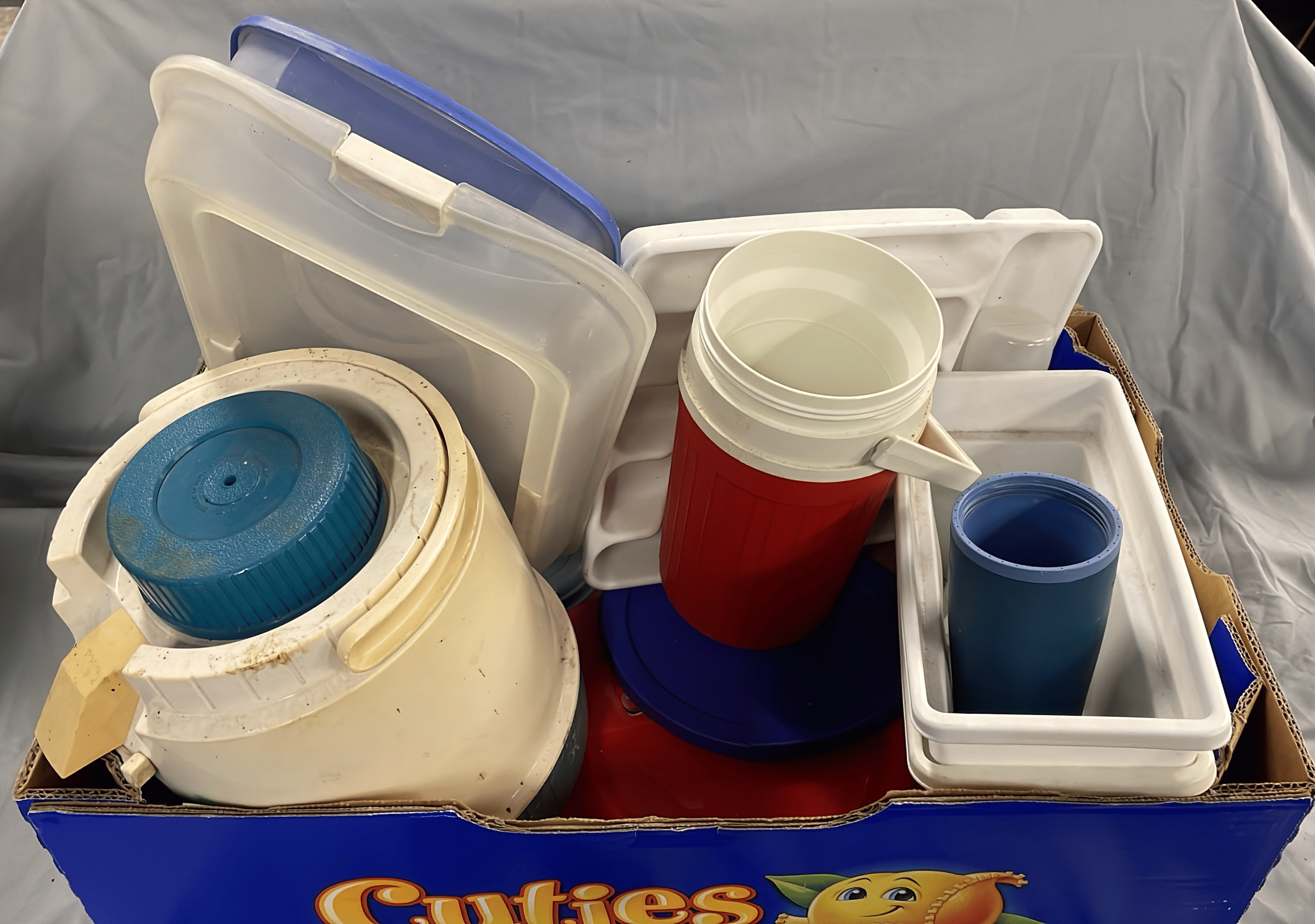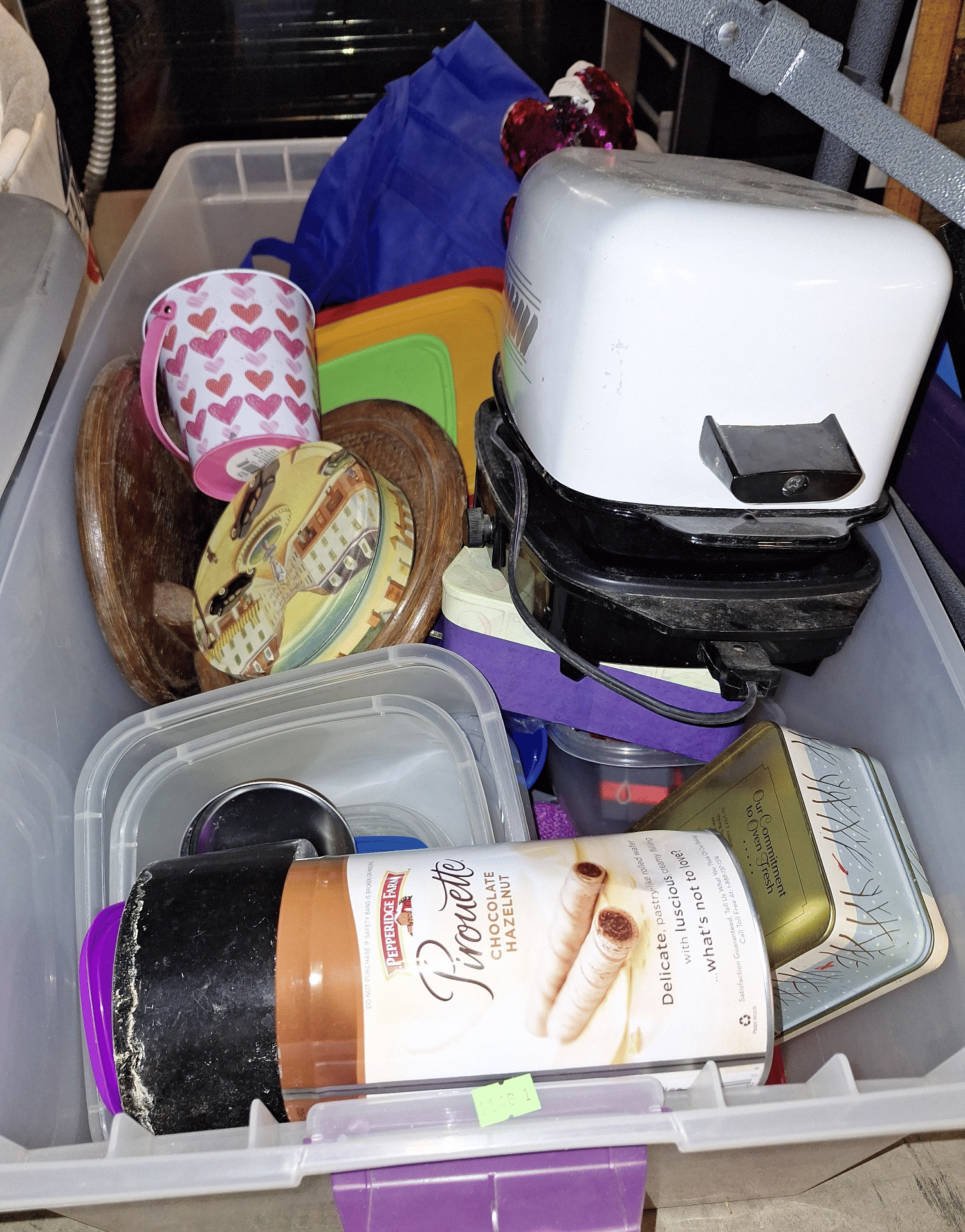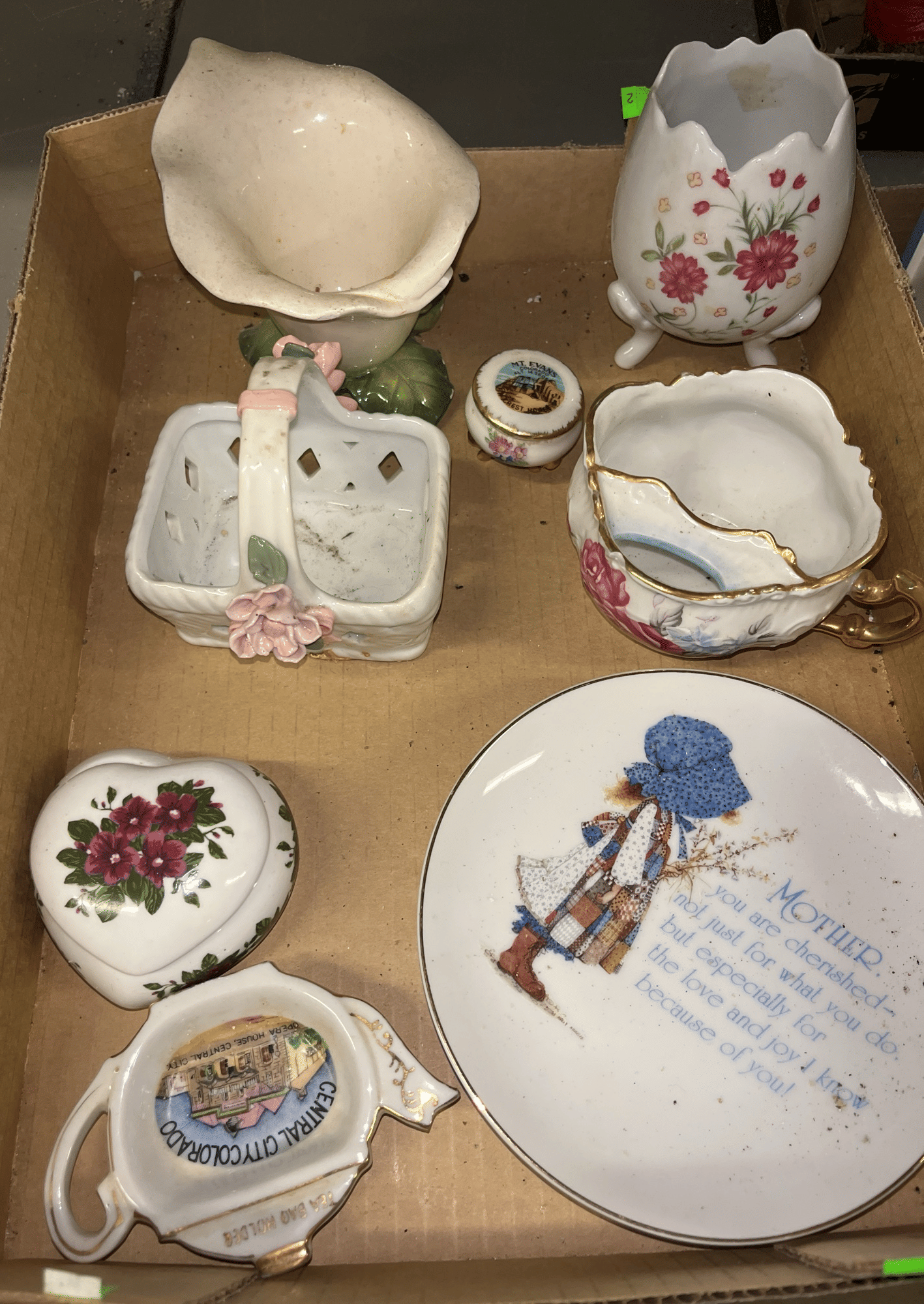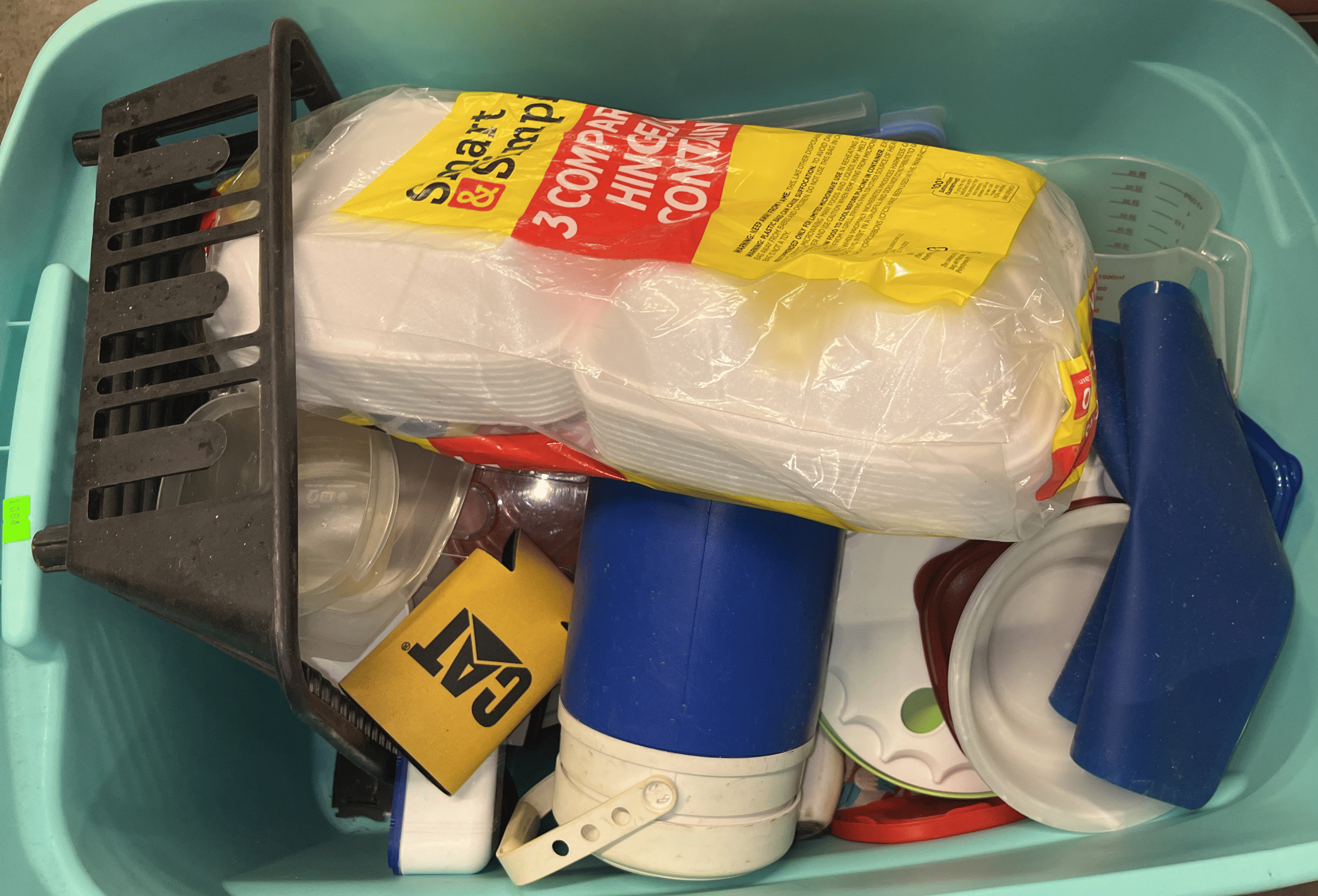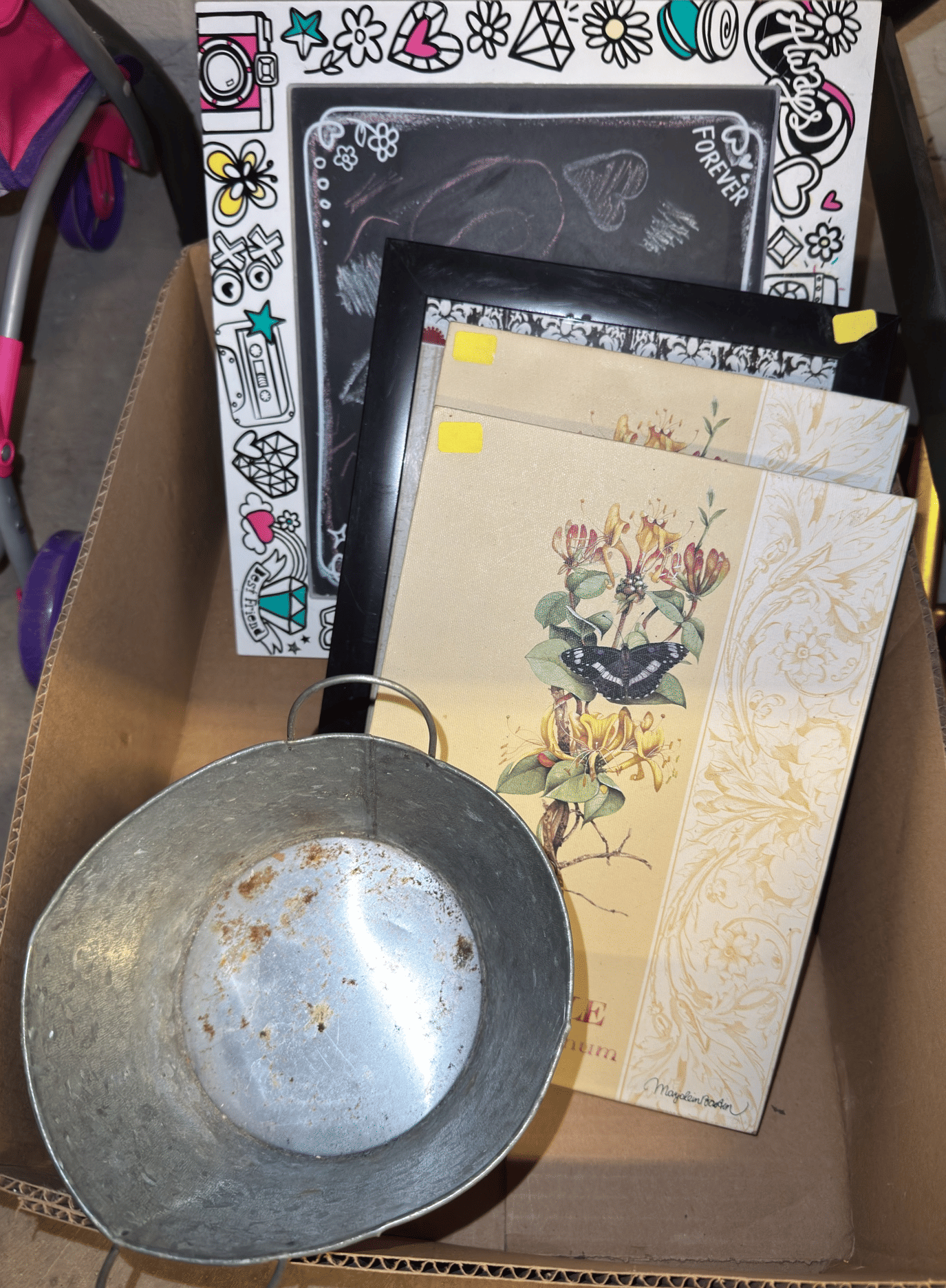 1158 Plastic organizers, hoops, bowl, glass light globe