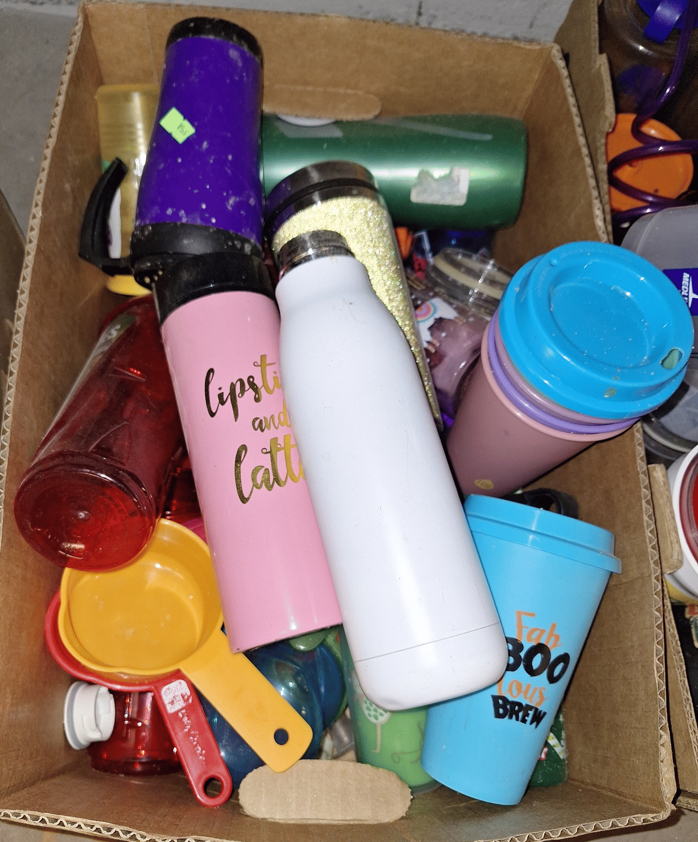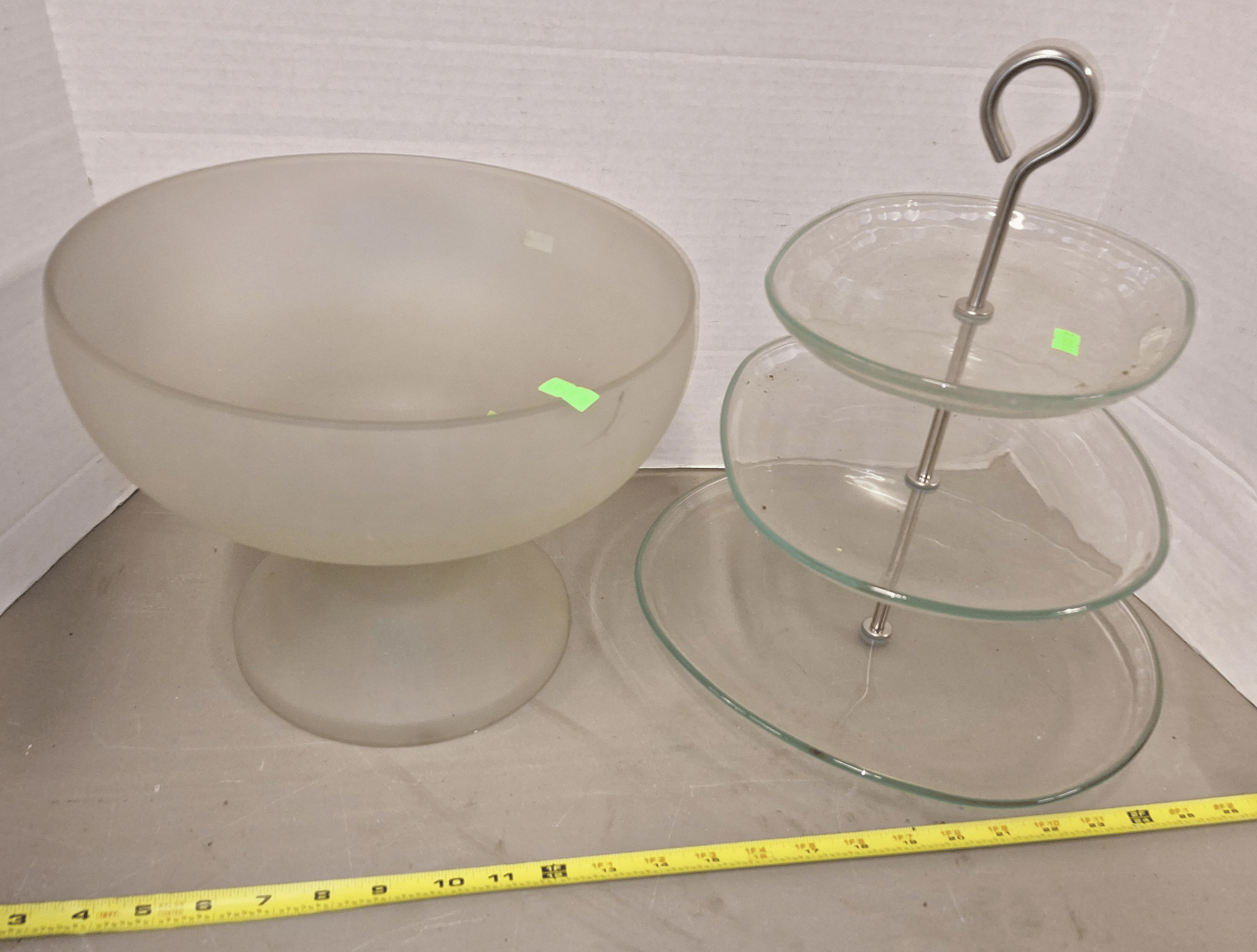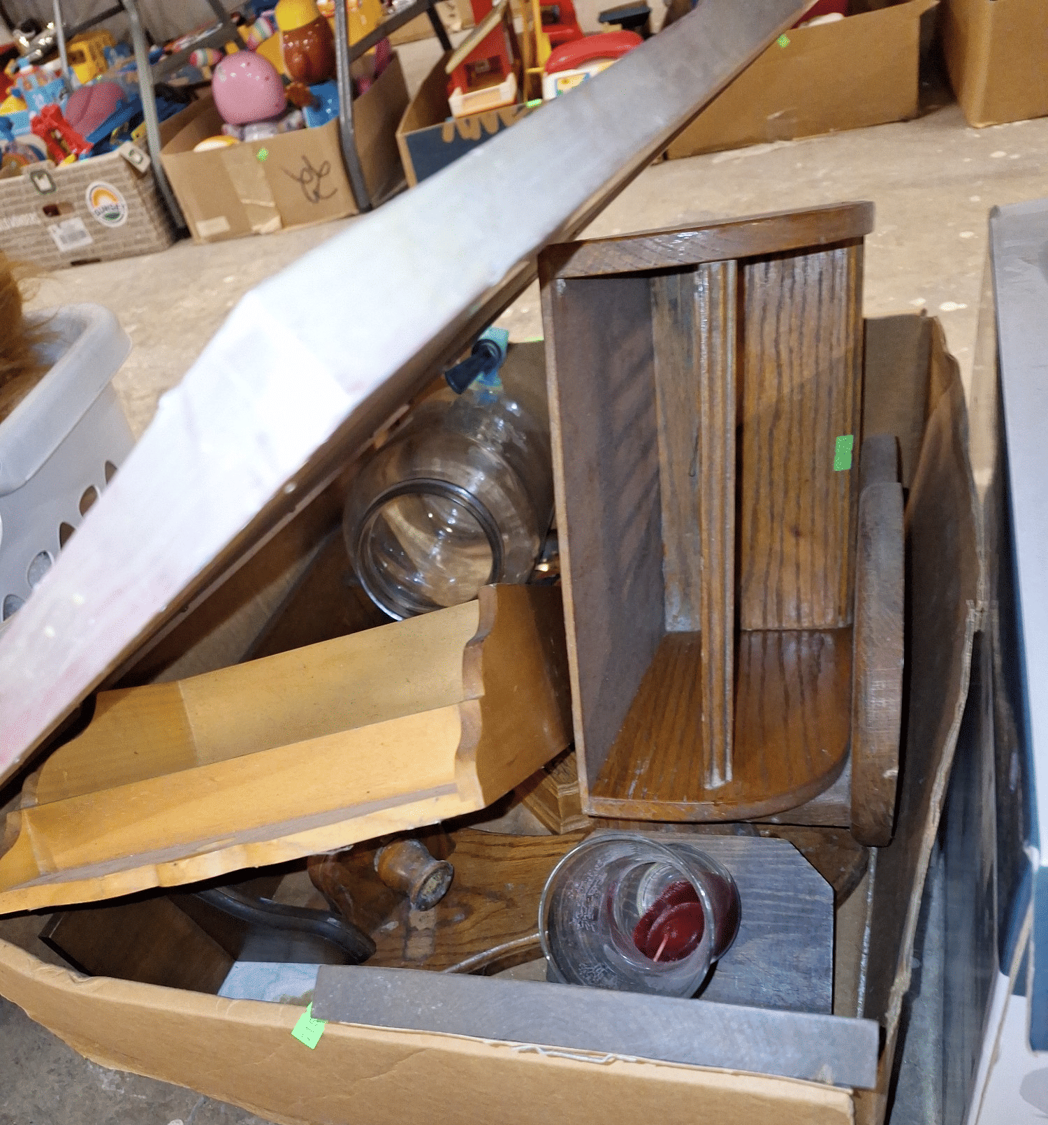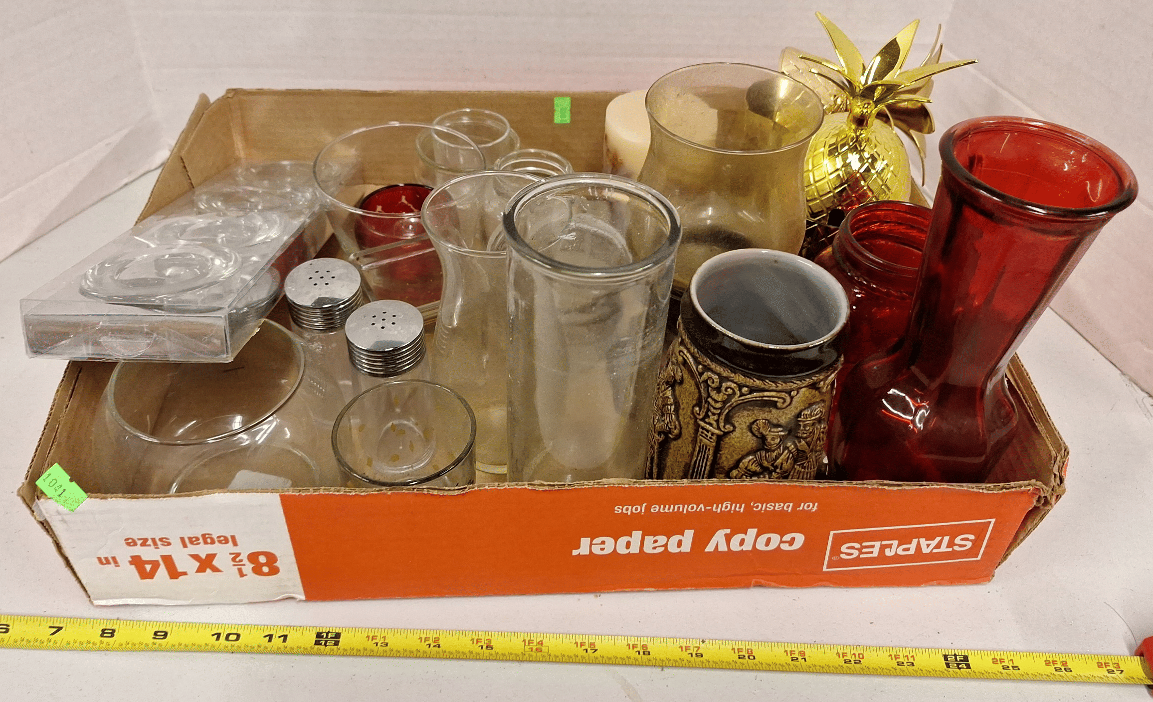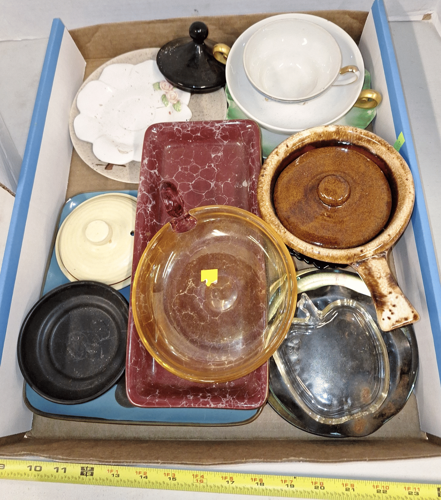 1158 Plastic organizers, hoops, bowl, glass light globe