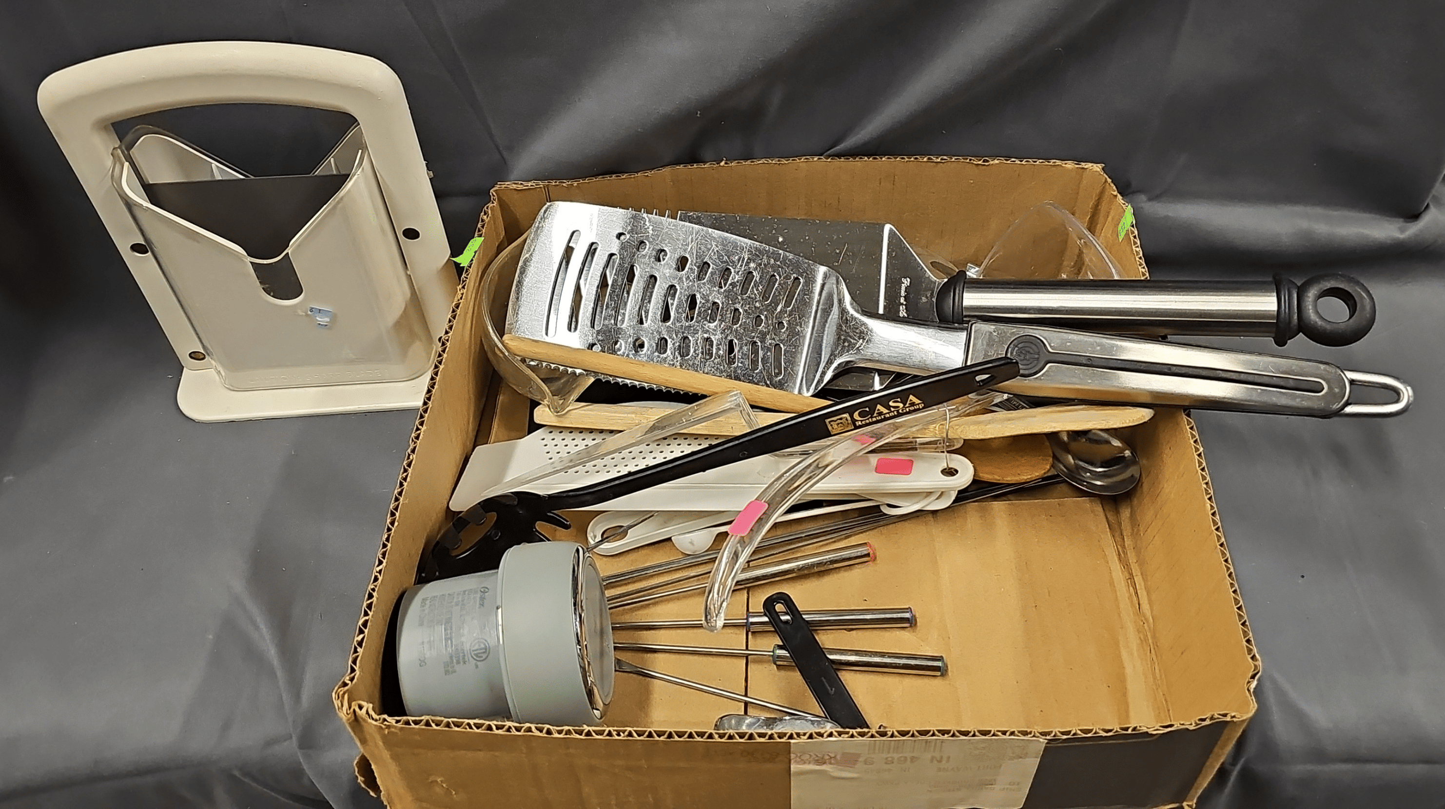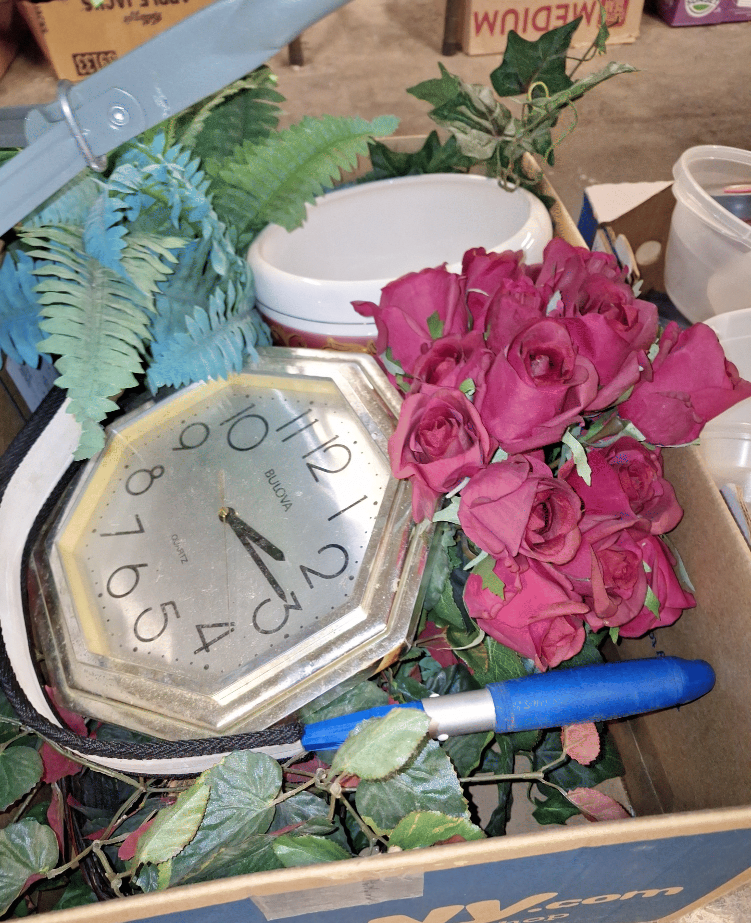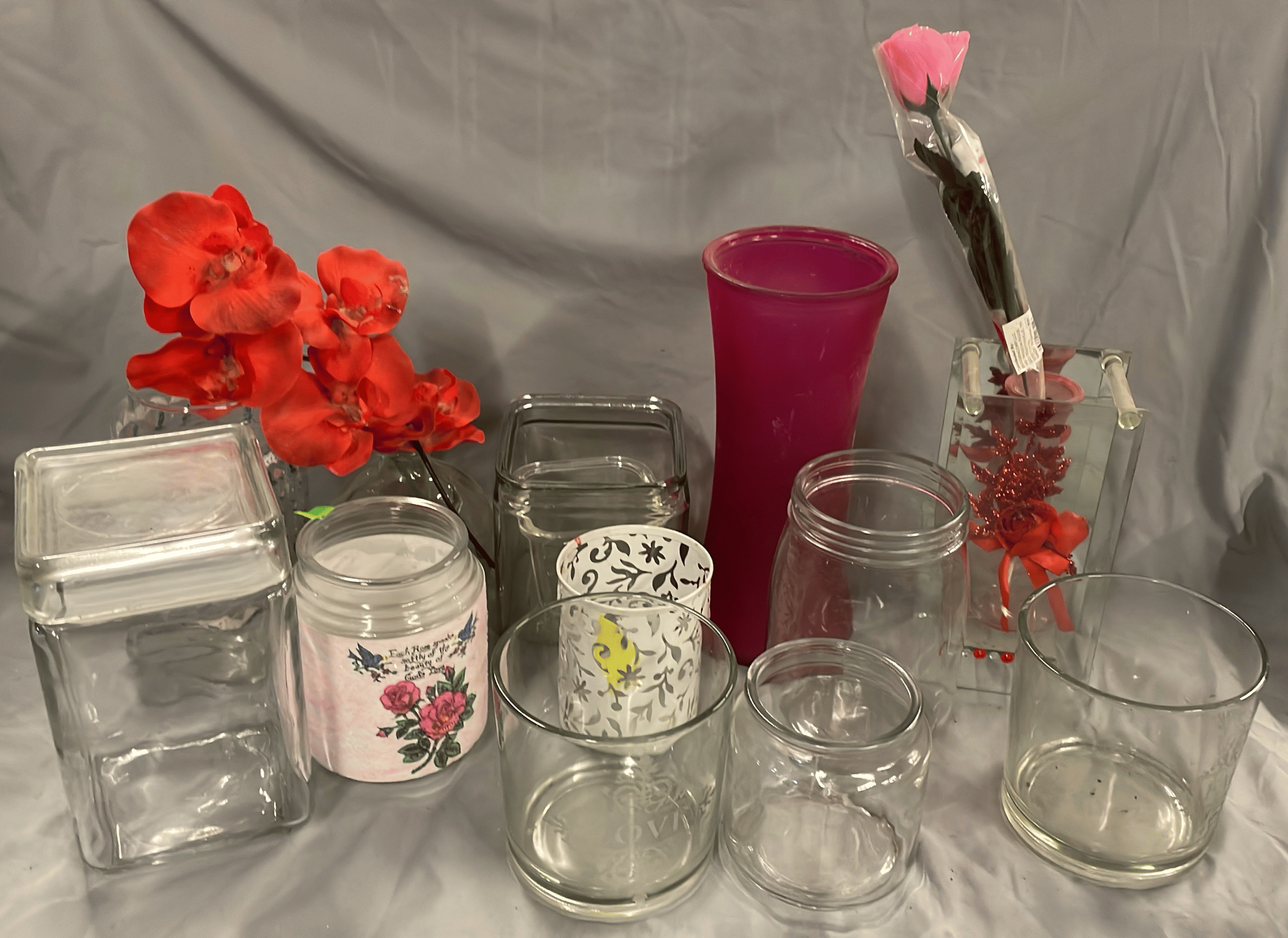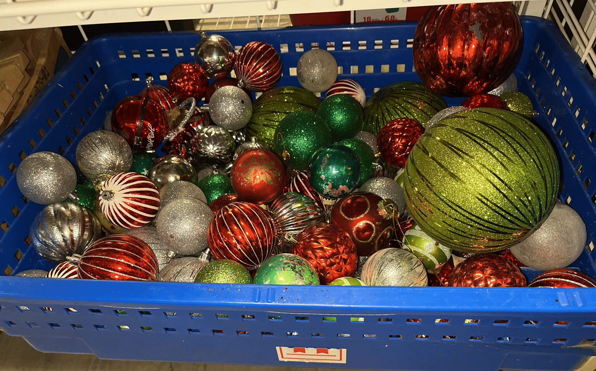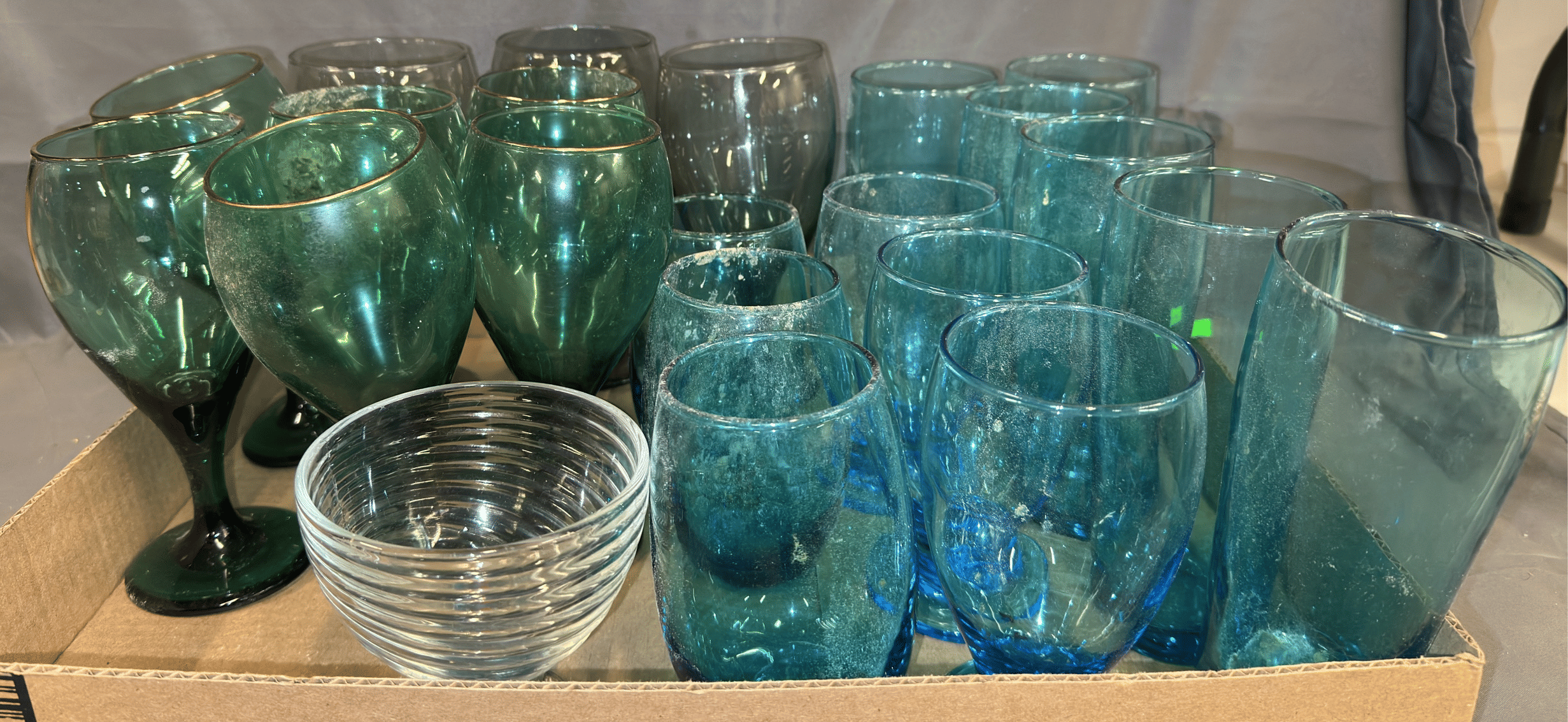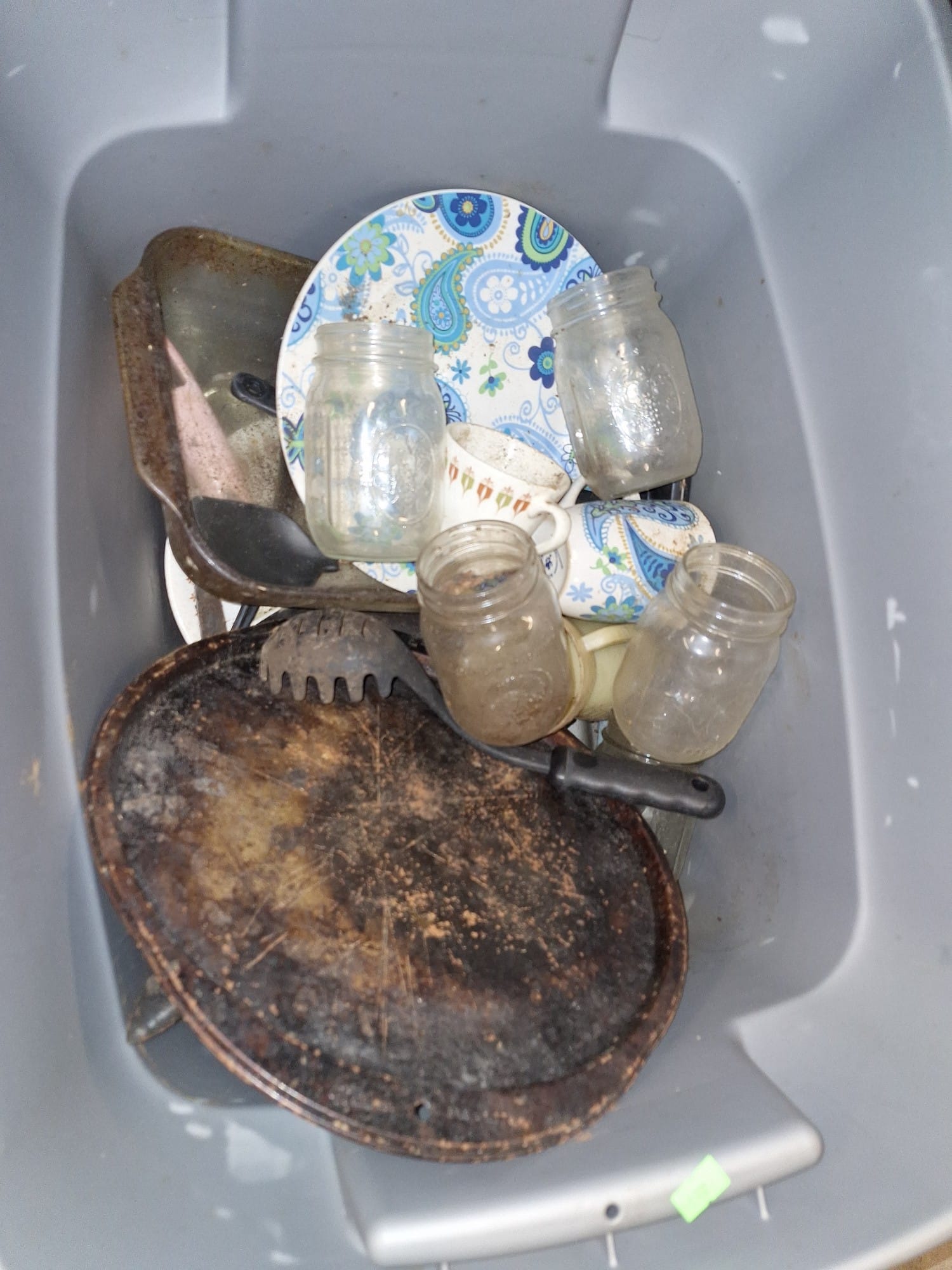 1158 Plastic organizers, hoops, bowl, glass light globe