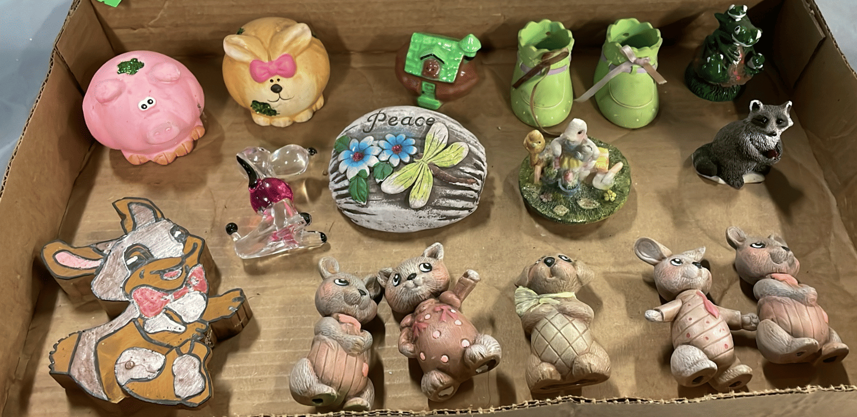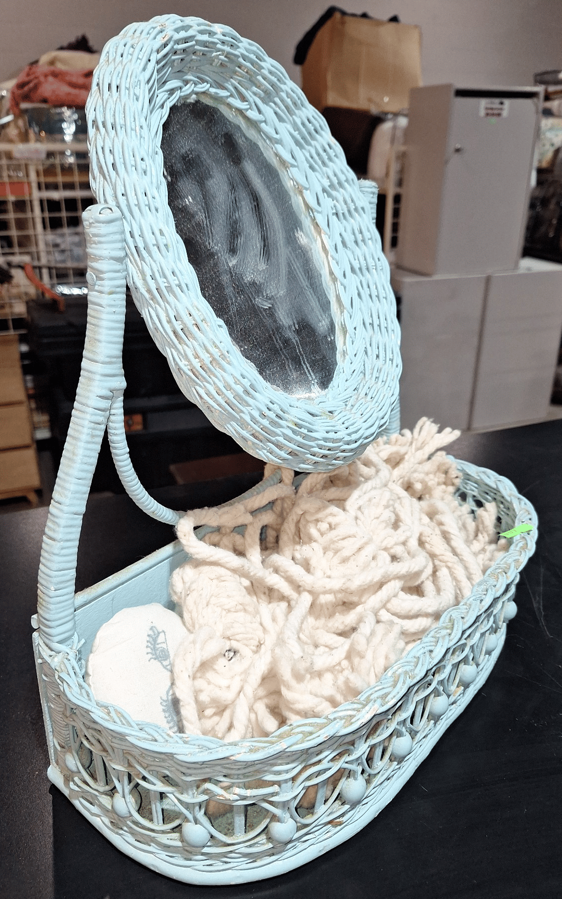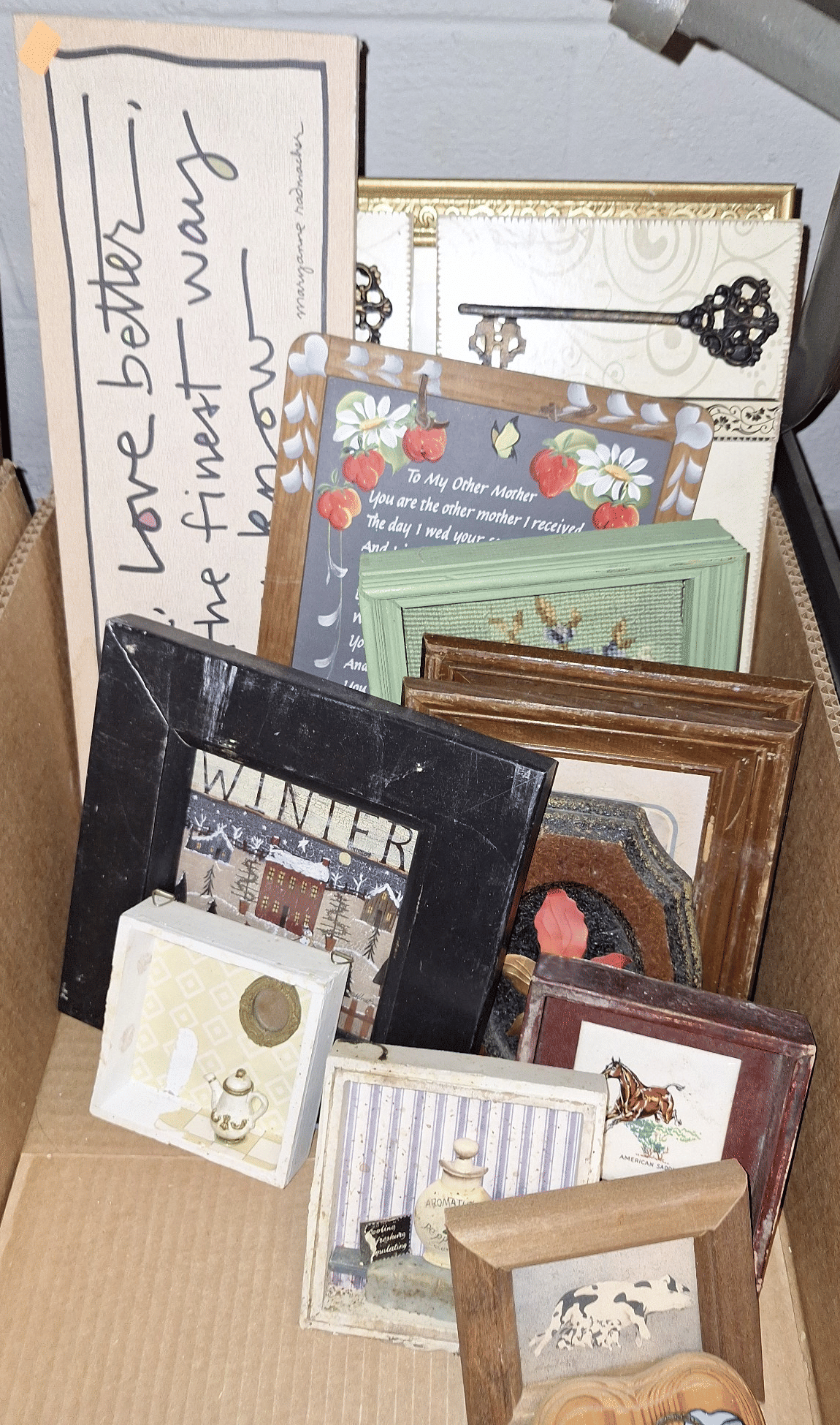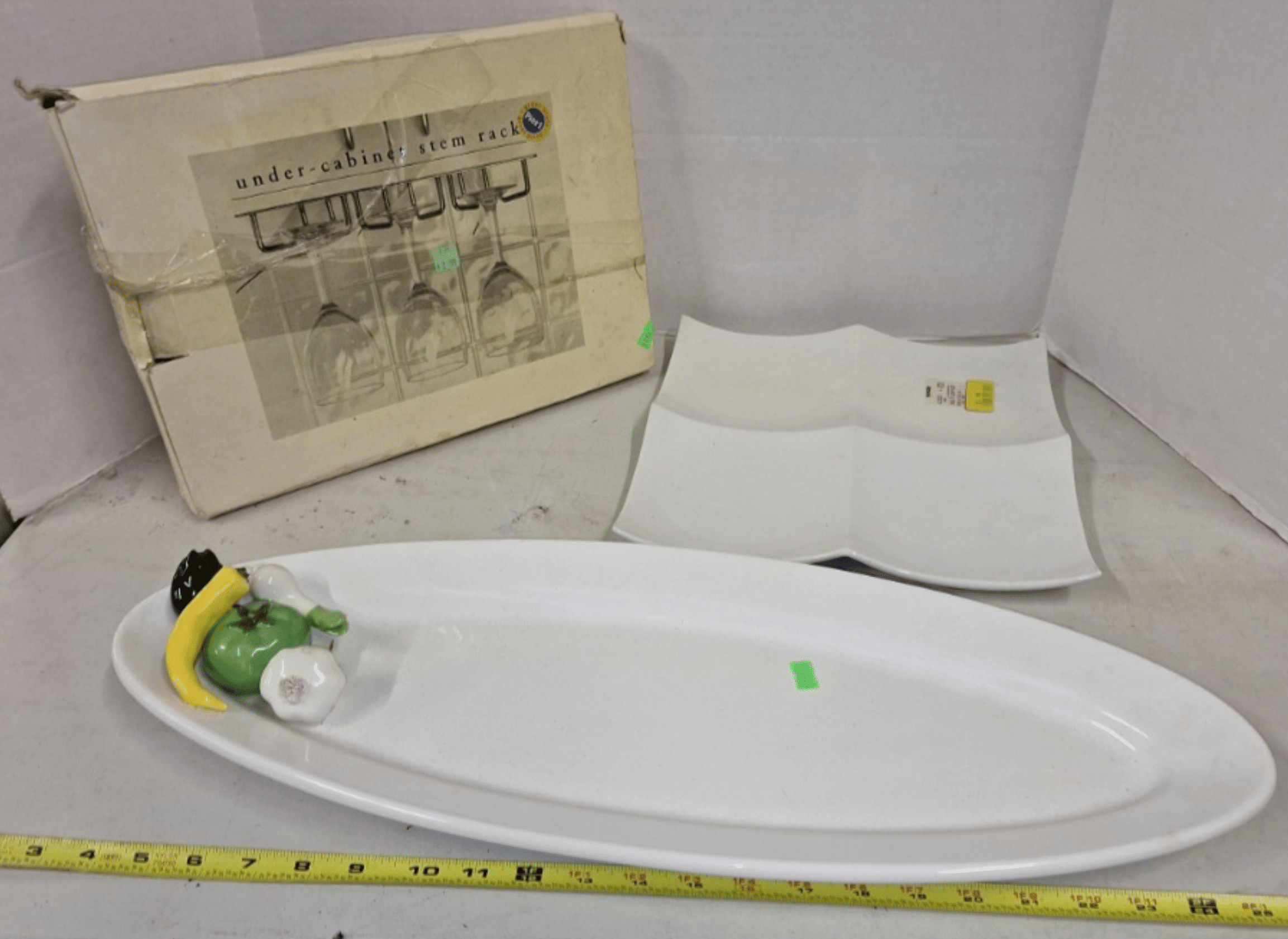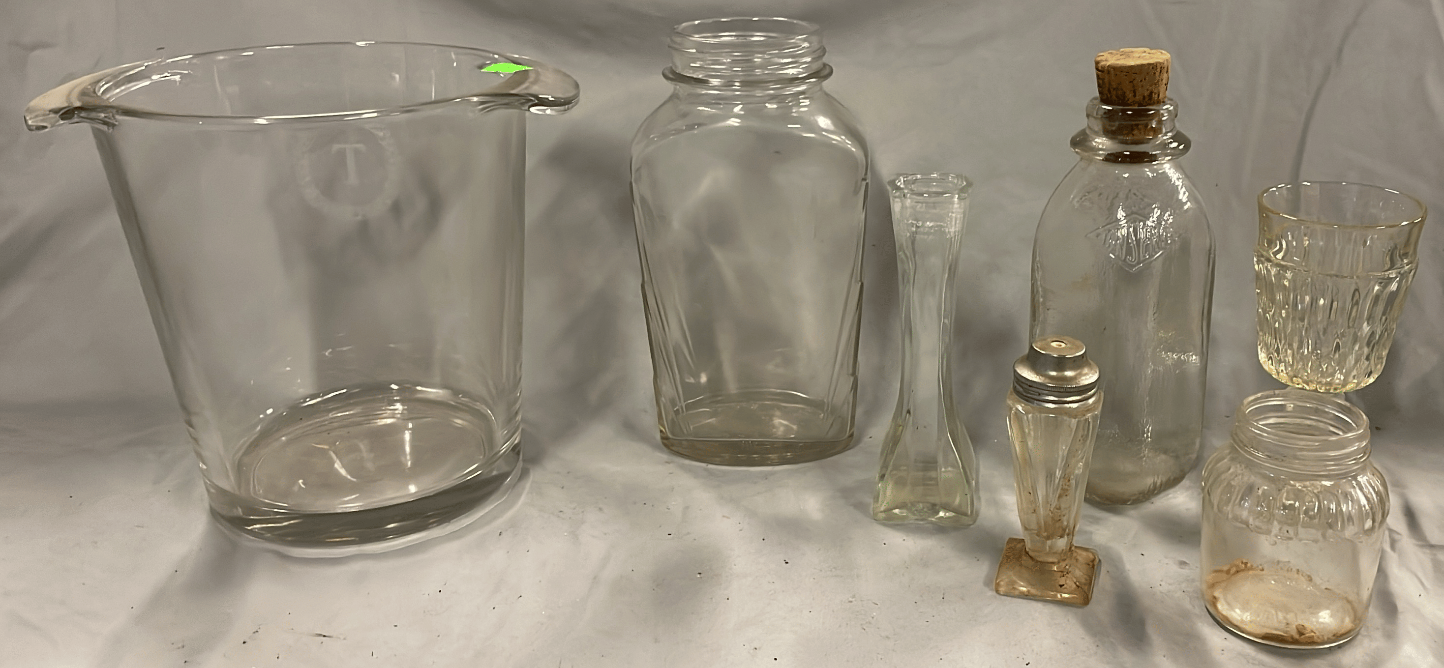 1158 Plastic organizers, hoops, bowl, glass light globe