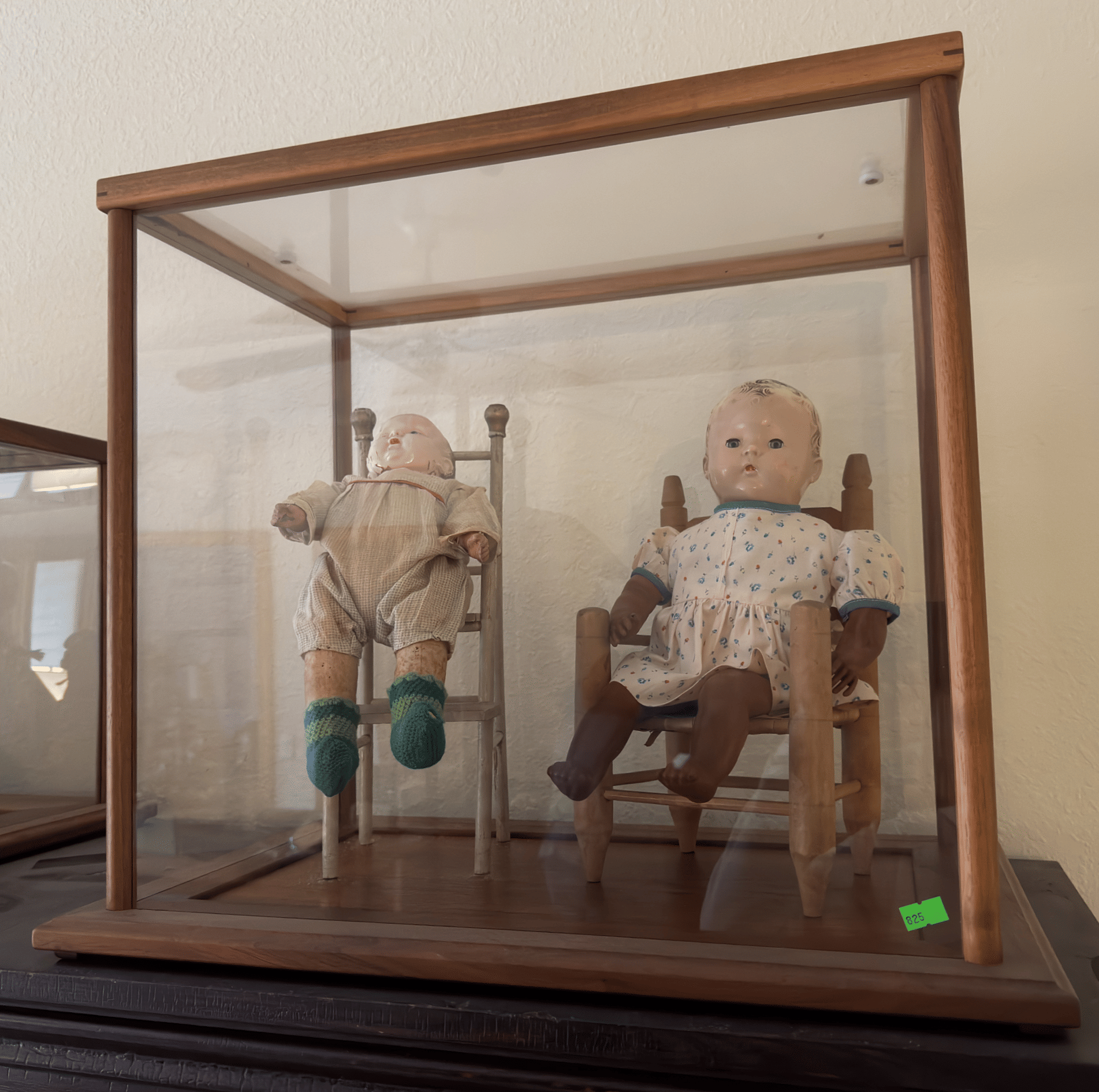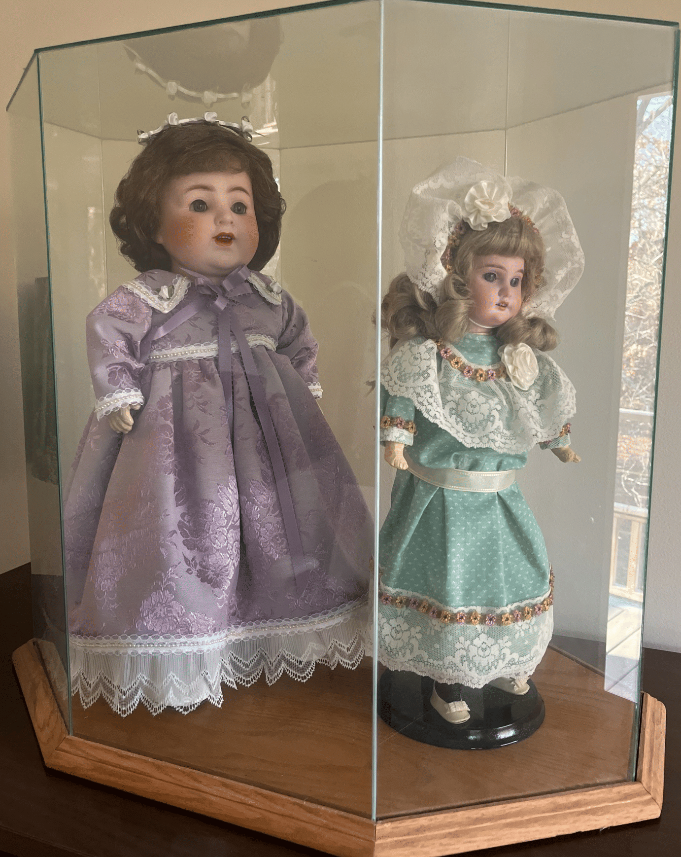 126 (2) Porcelain Dolls 18",16" with glass showcase 23"x14"x21"