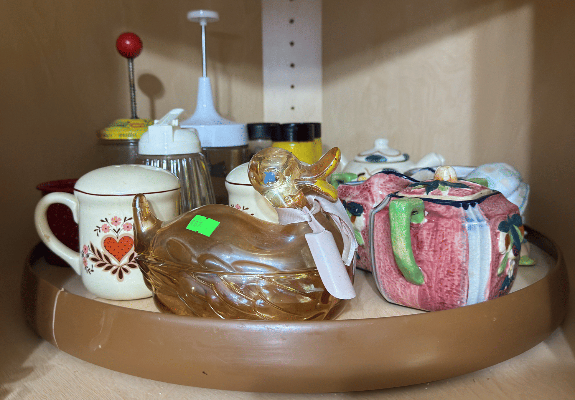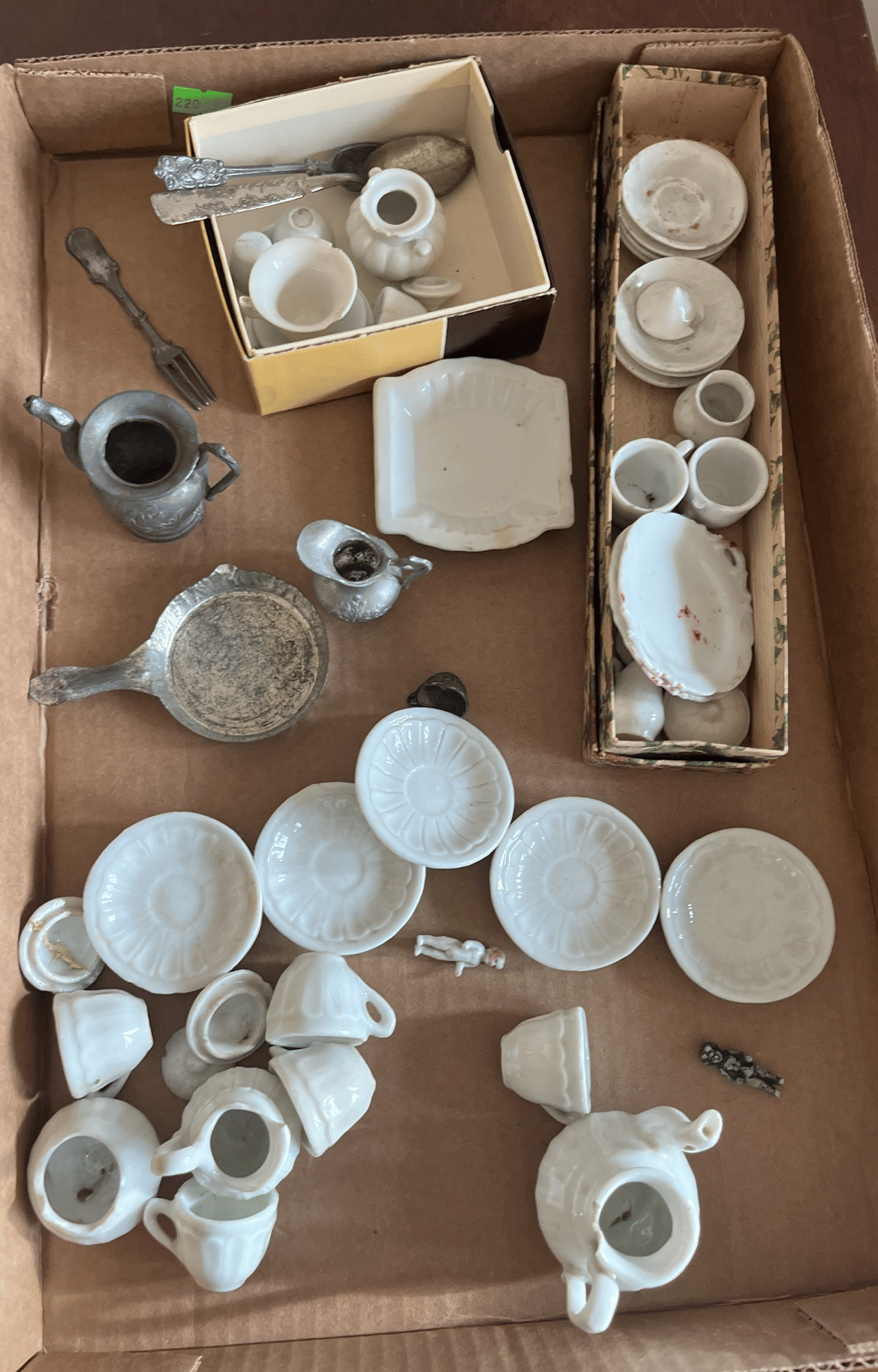 220 Child’s china tea set, spoons, metal pitchers