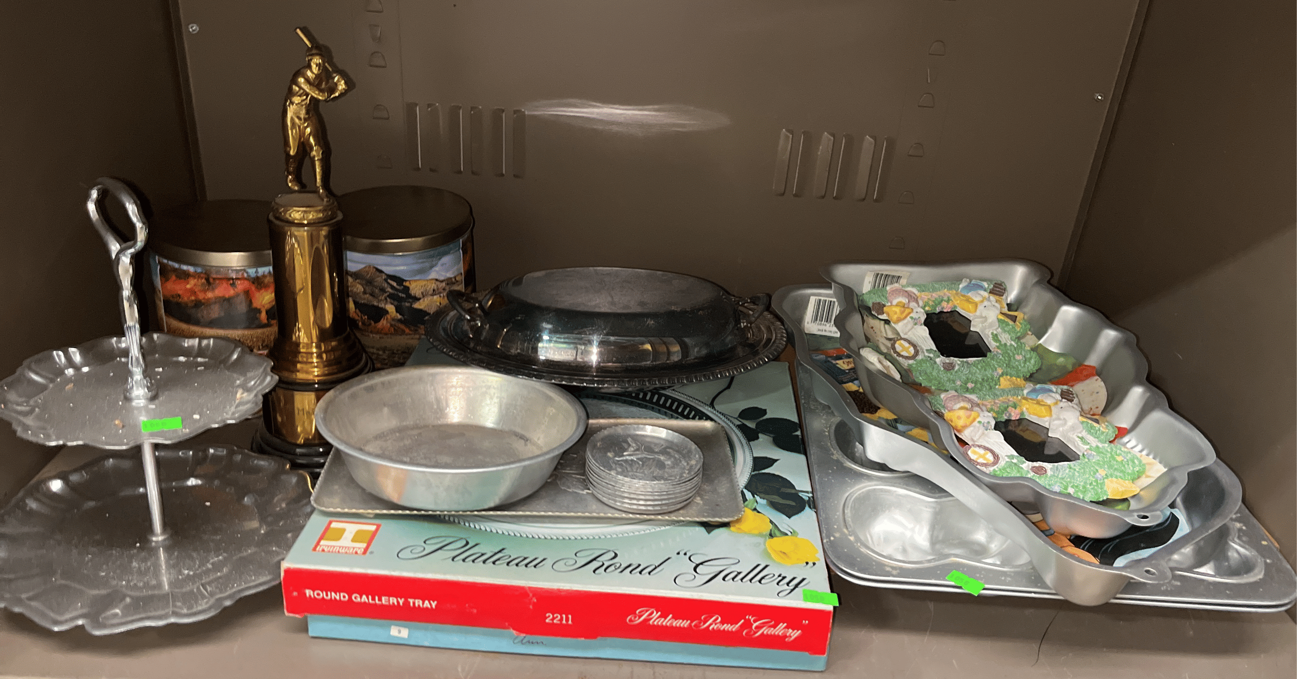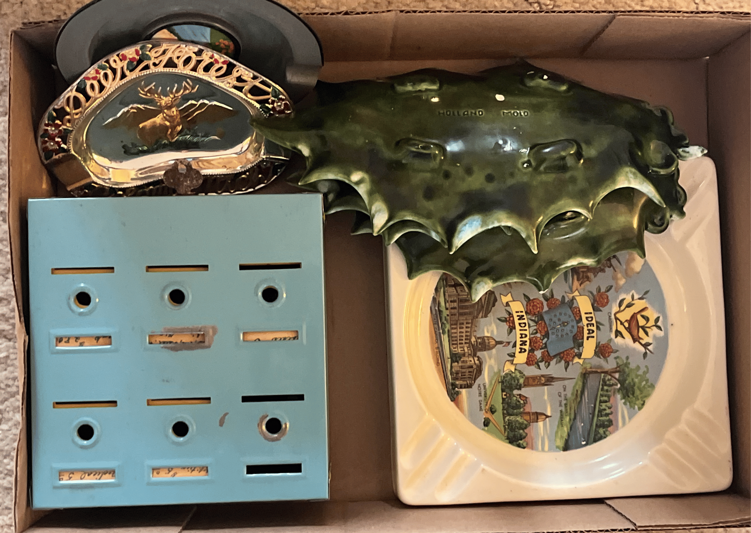 225 Metal Home Budget Bank, Ashtrays and Holland Mold Holly Leaf Candy Dishes
