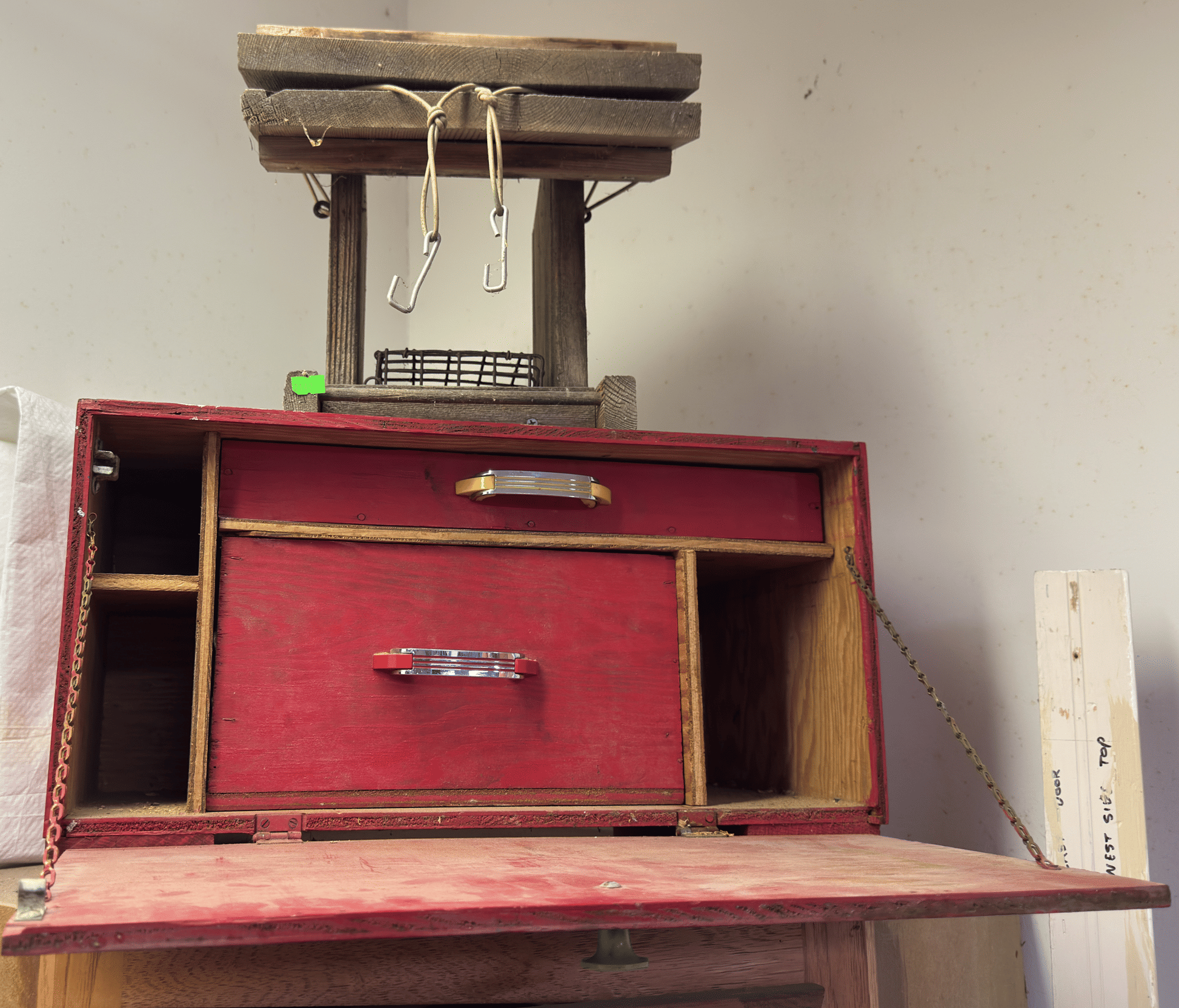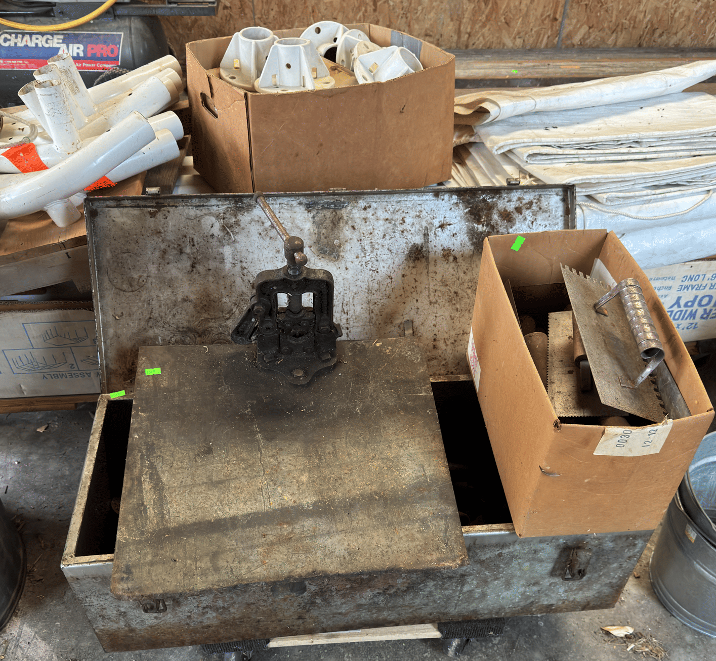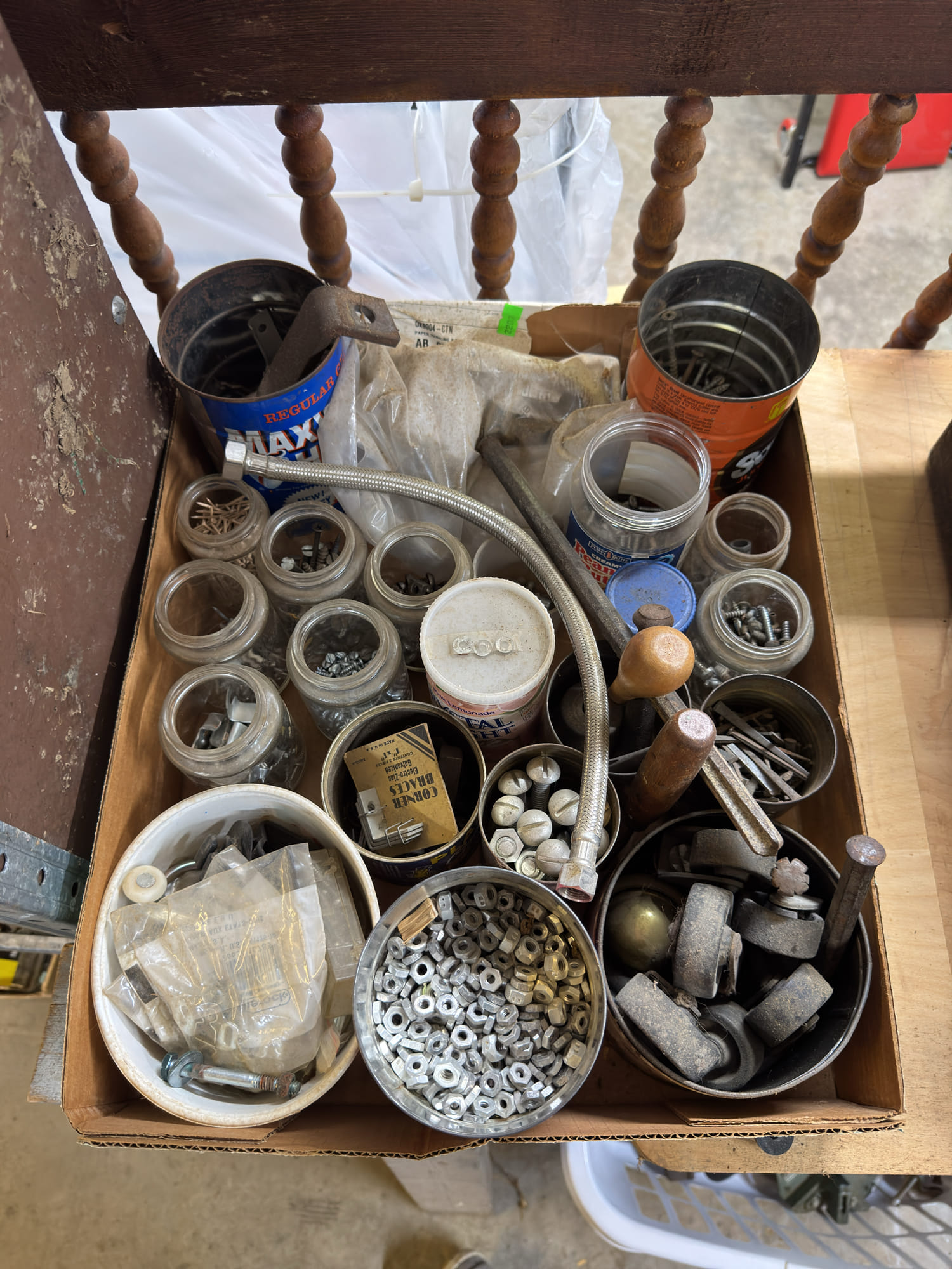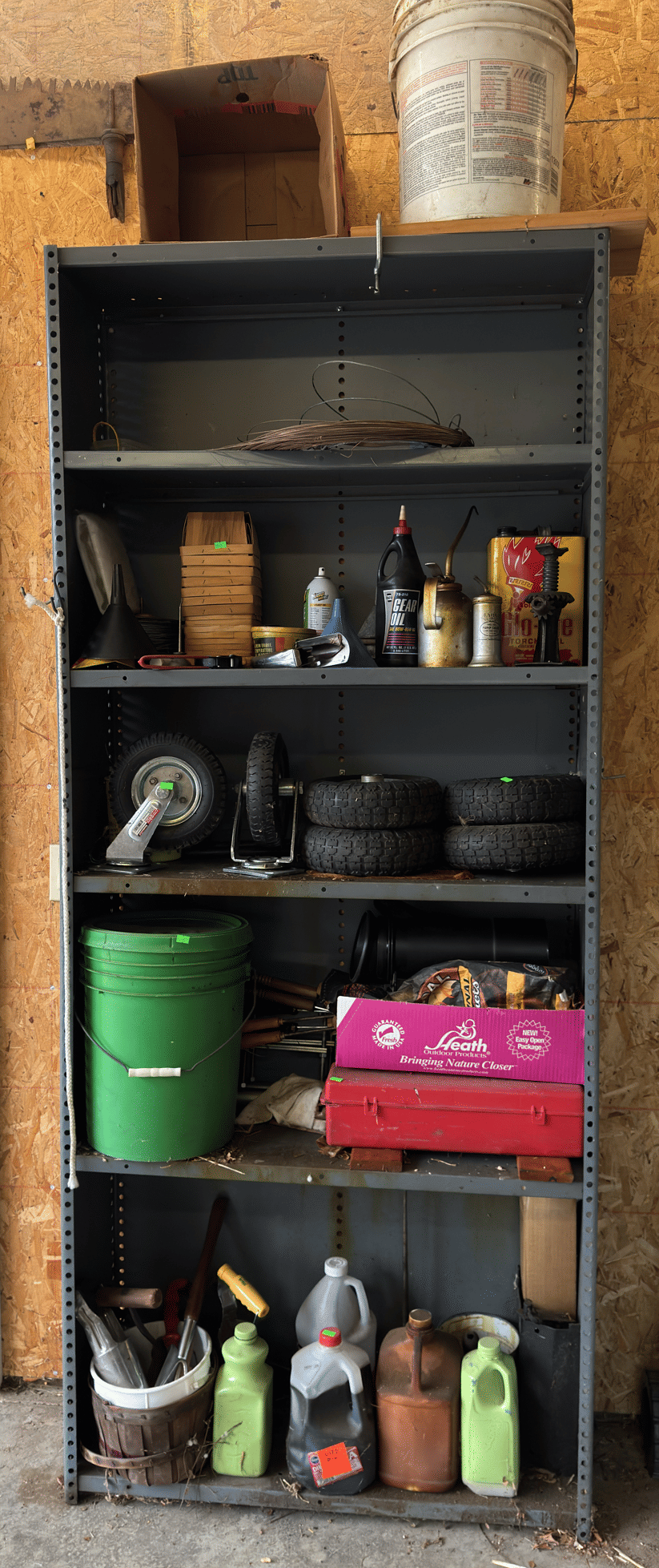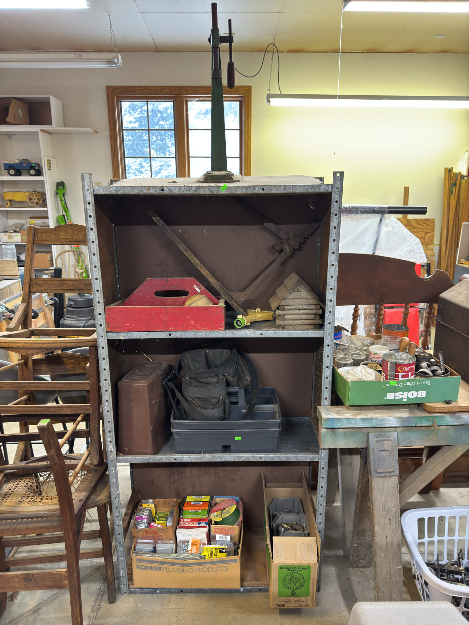 2205 Bottle cappers, wood tote, plastic totes, hardware, shelf 30x12x61
