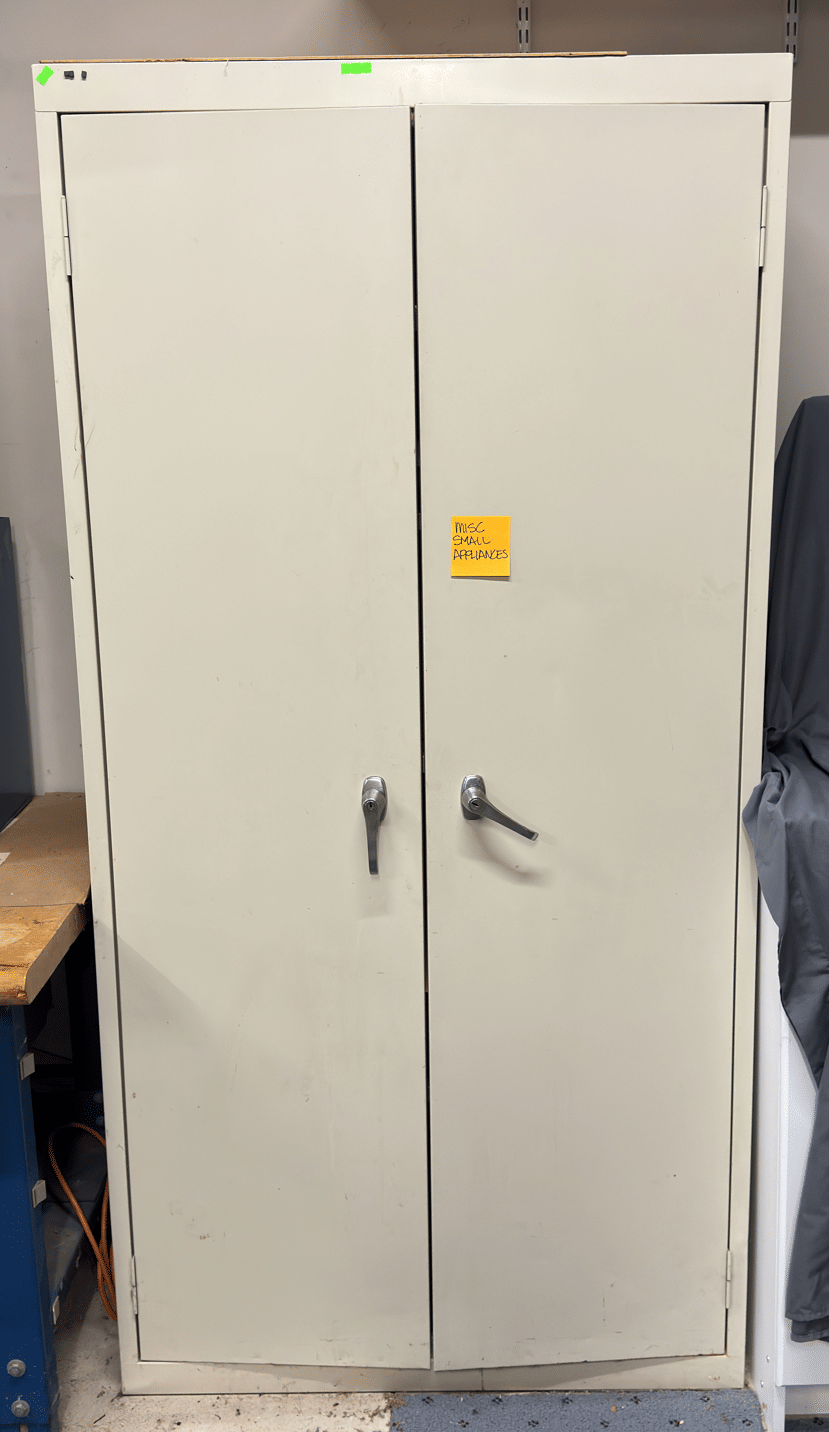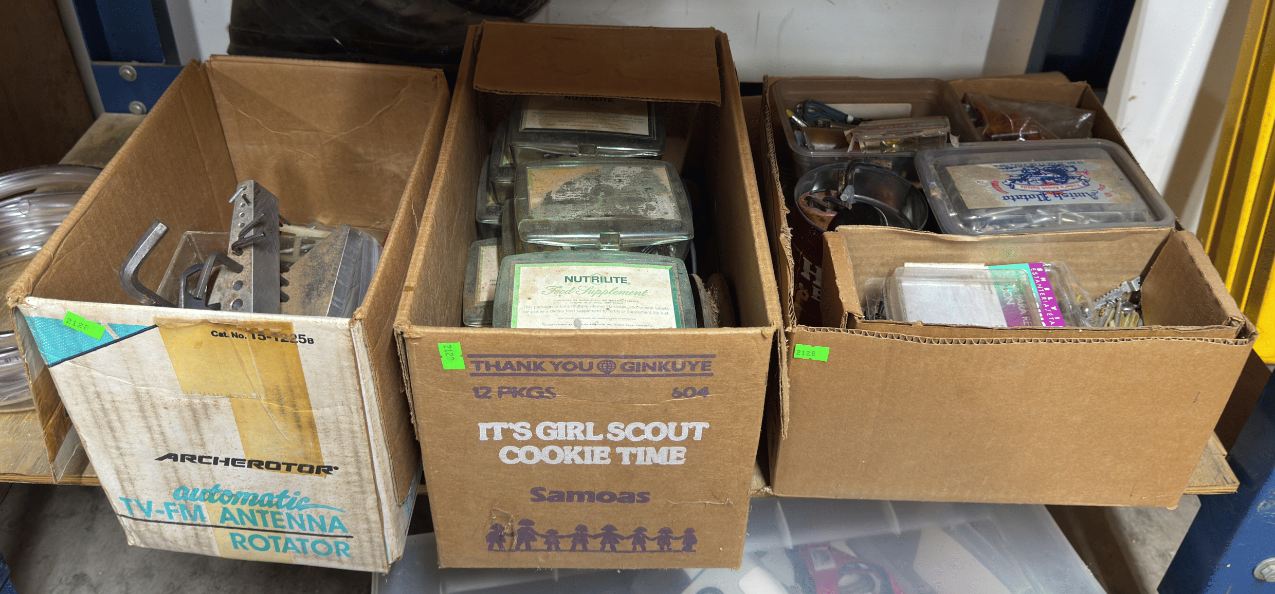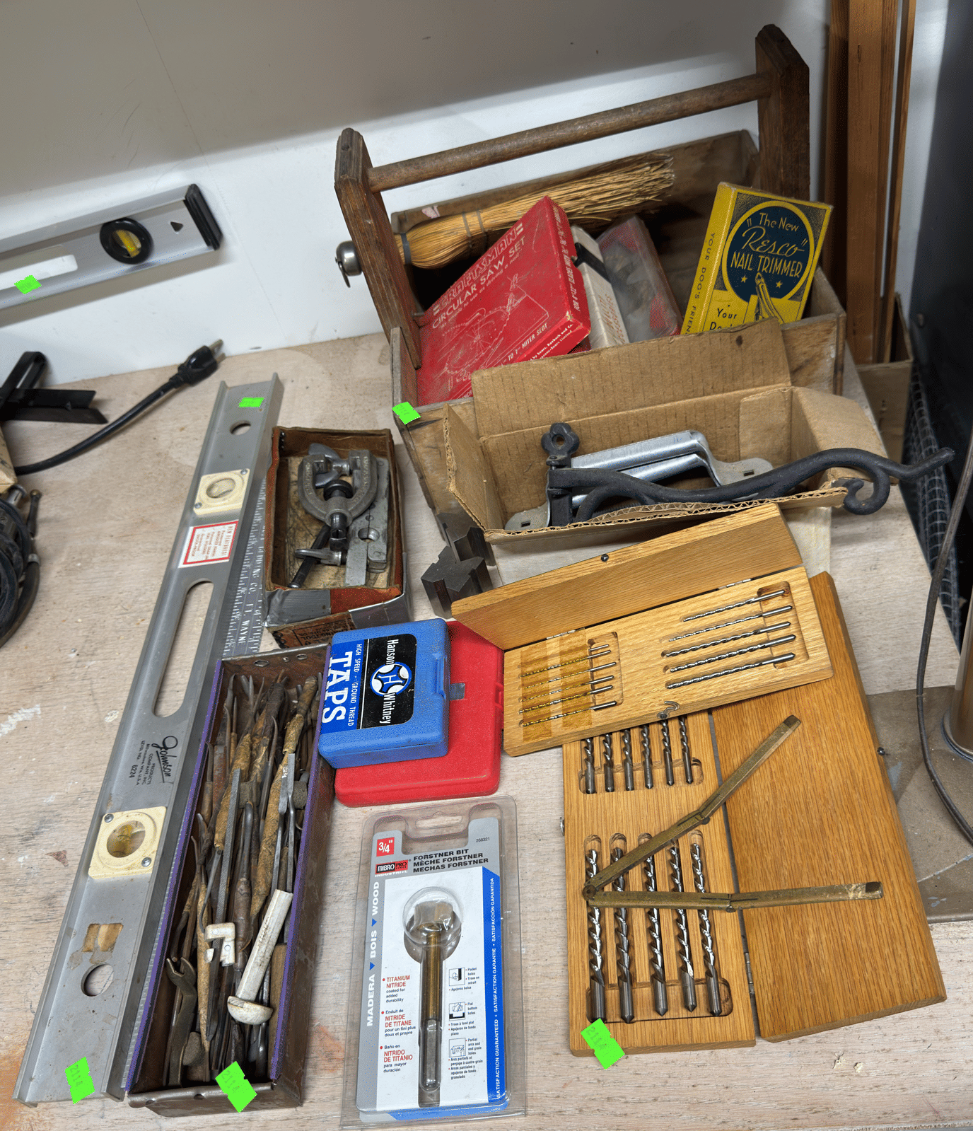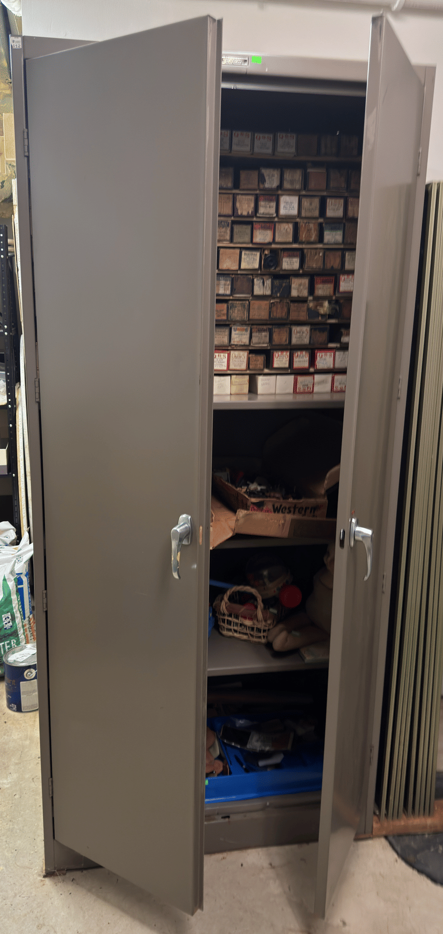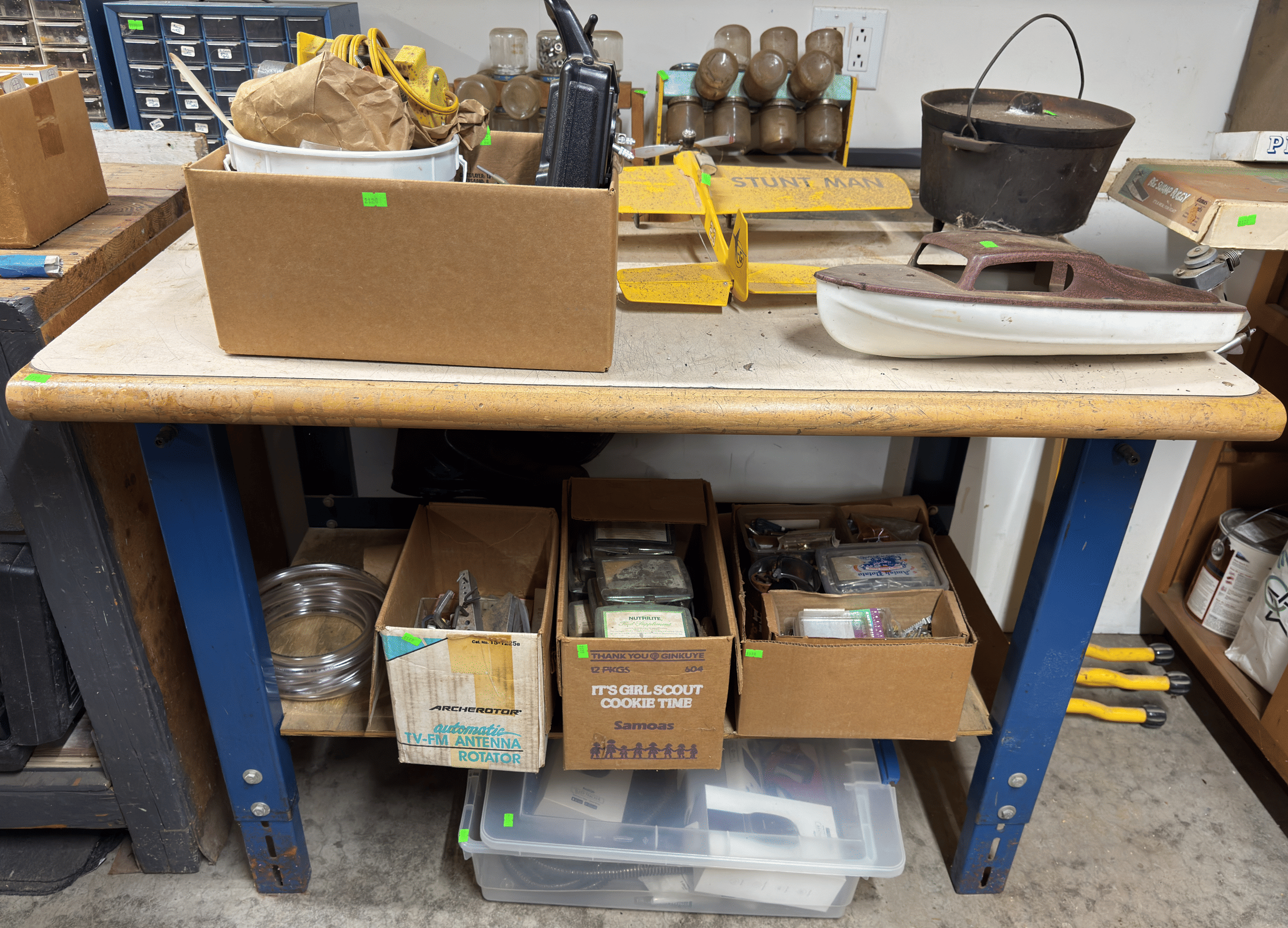 2205 Bottle cappers, wood tote, plastic totes, hardware, shelf 30x12x61