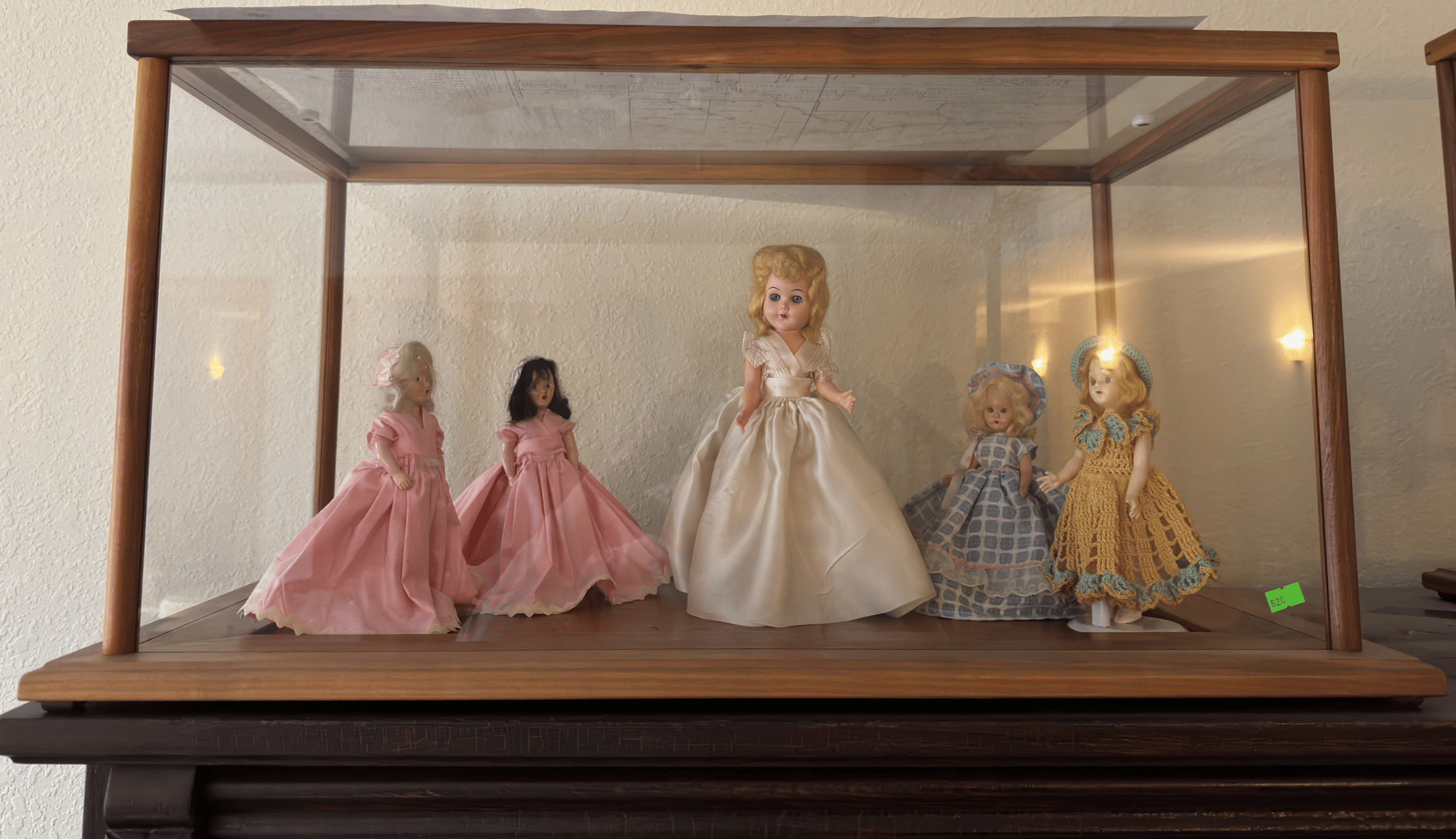 115 (3) Porcelain composite dolls with glass showcase: Dolls, 6",15,",16" Case 22x14x18"