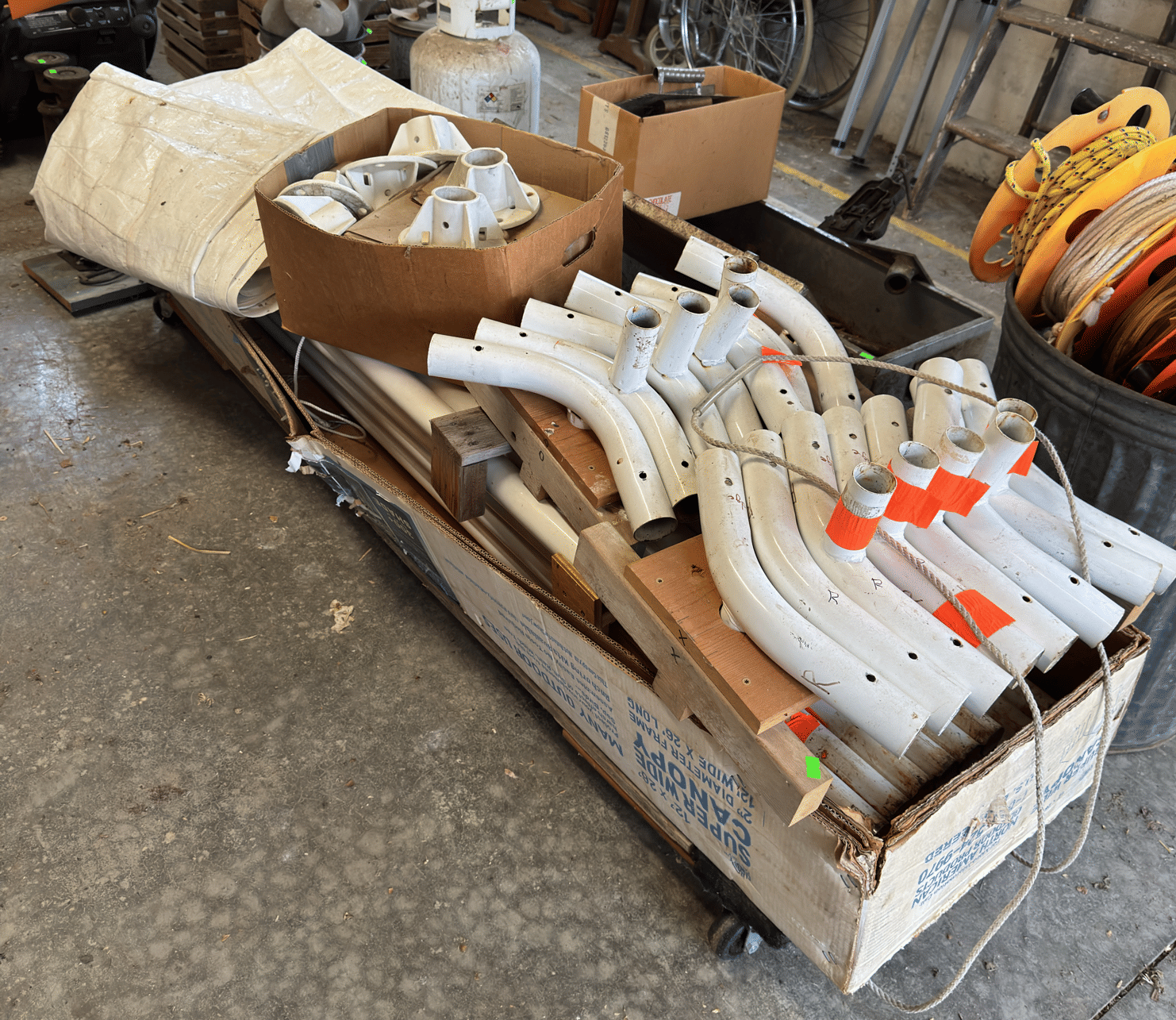2203 Hardware assortment, casters, hose section, misc