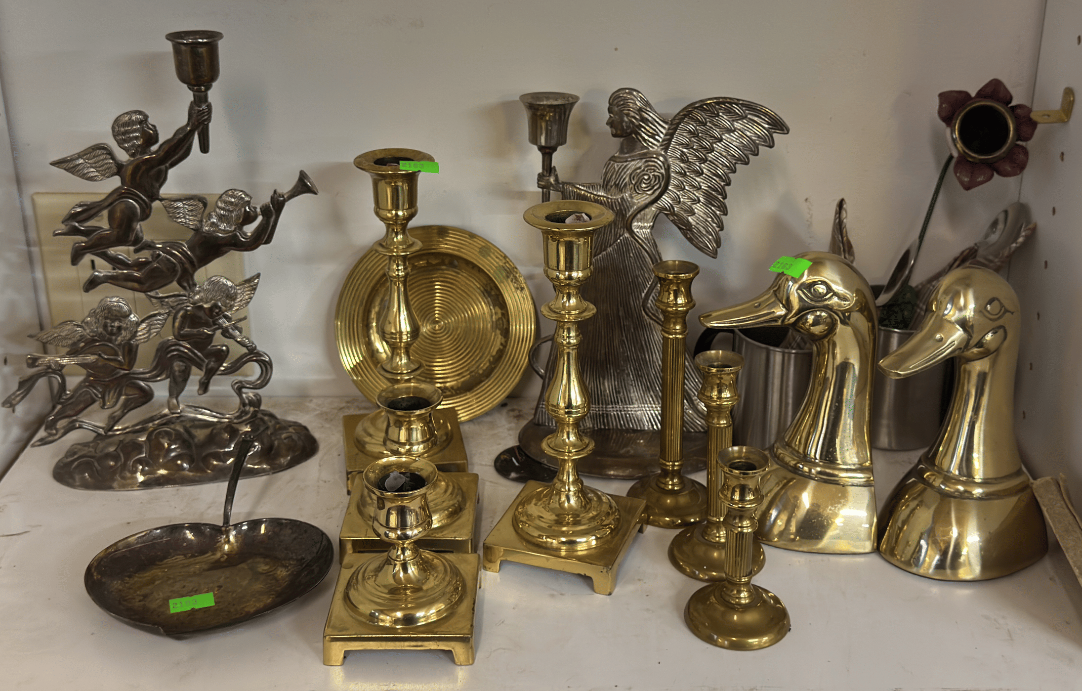 2163 Brass candle holders, book ends, decor assortment