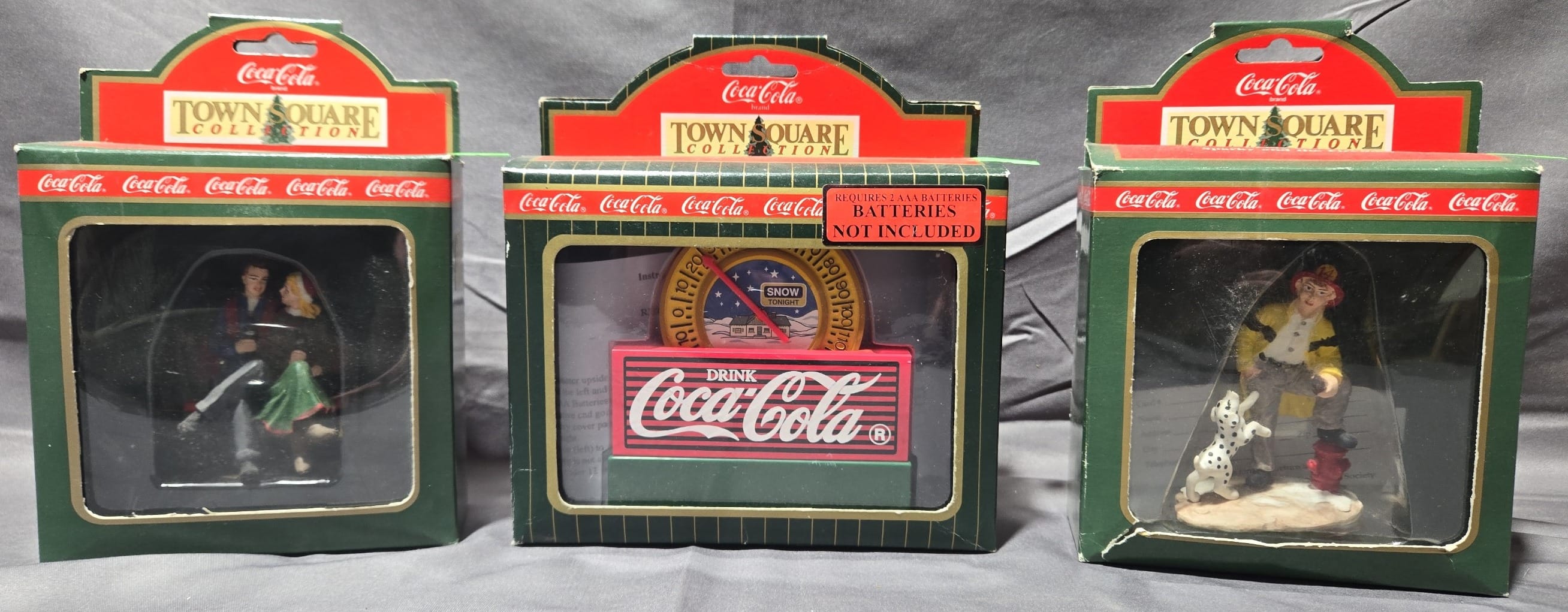 2002 (3) Coca-Cola Town Square Collection Figurines Including "Sparky and The Fireman", Time Together" and "Thermometer"