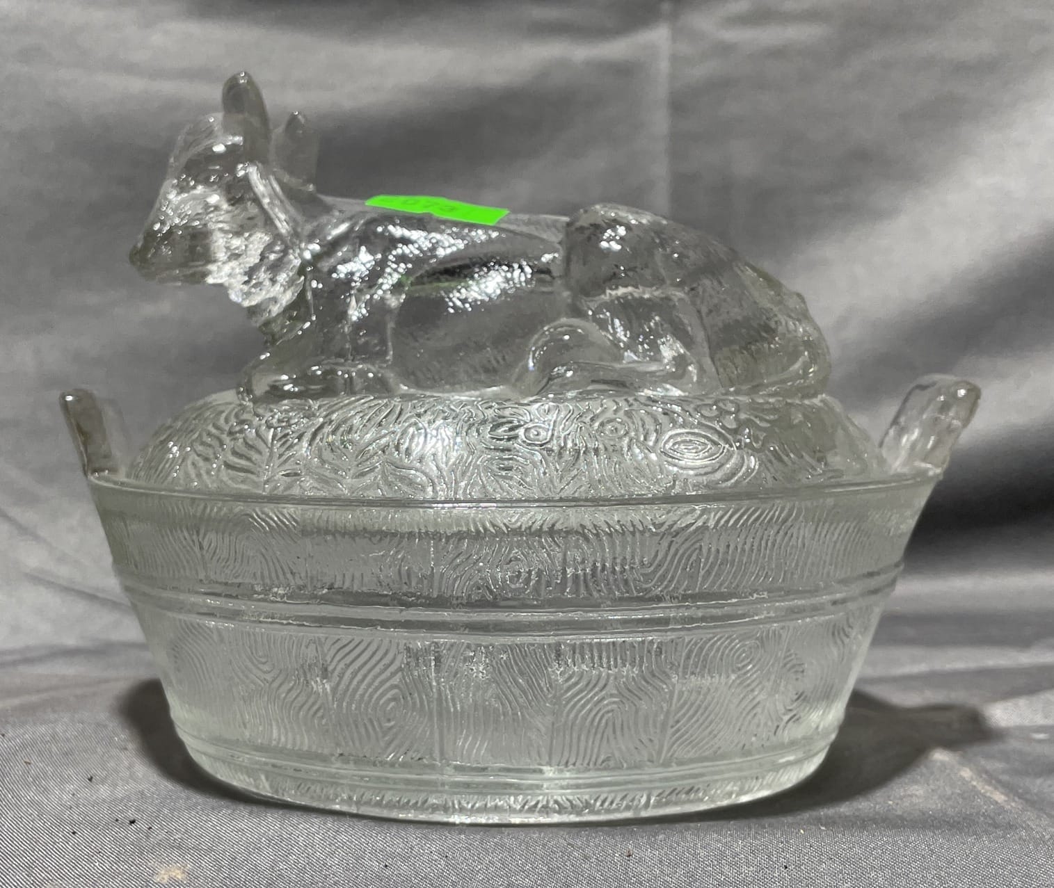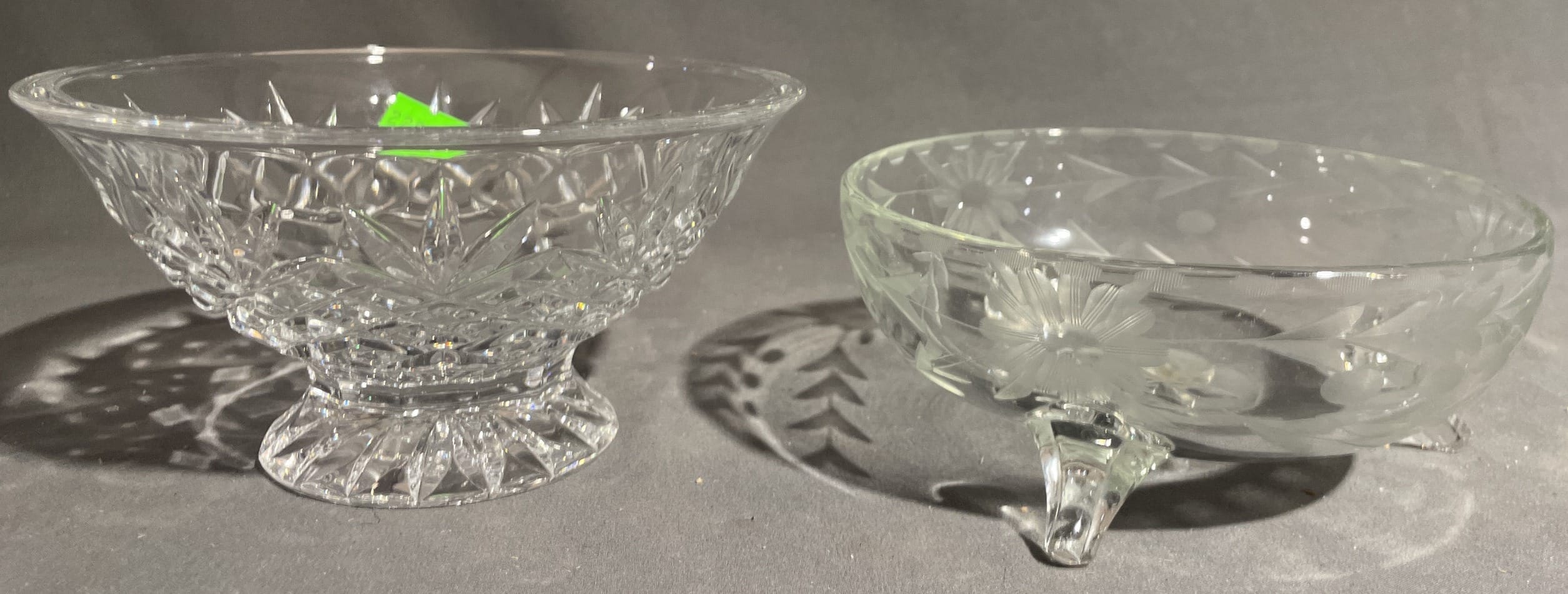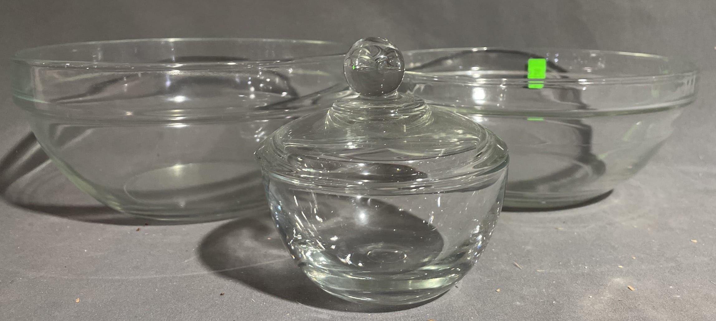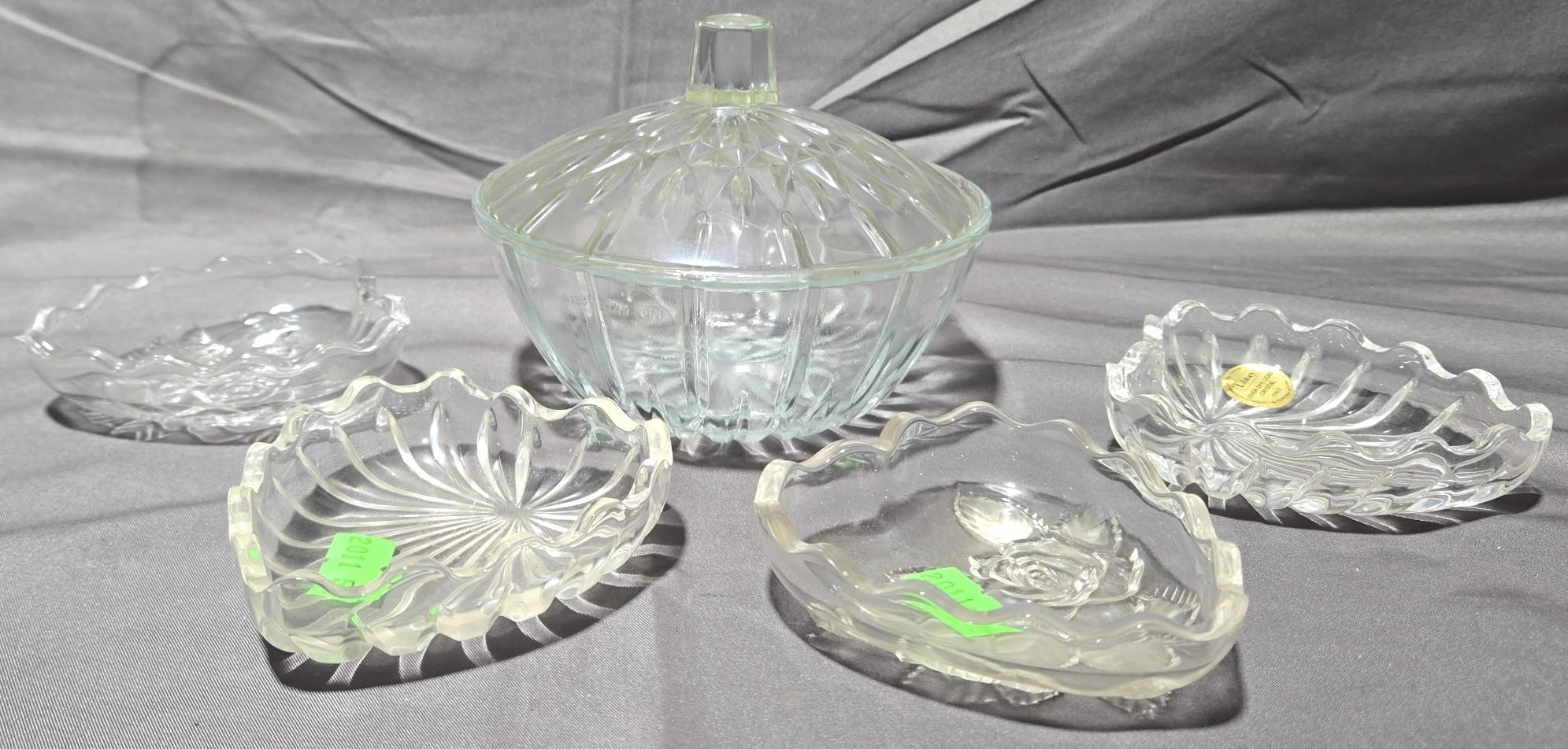 2011 (2) Libby Lead Crystal Heart Trinket Boxes 4" x 3", (1) Glass Covered Candy Dish 2" x 5'