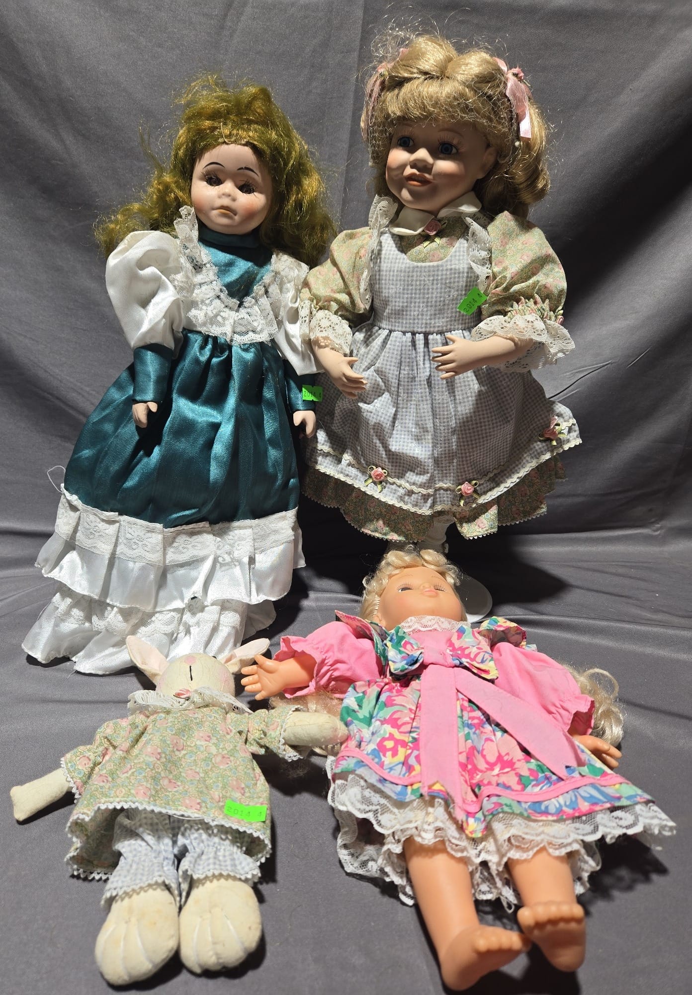 2014 (2) Porcelain Dolls 15", (1) Hand Made Cloth Rabbit Doll 8", (1) Plastic Doll 11"