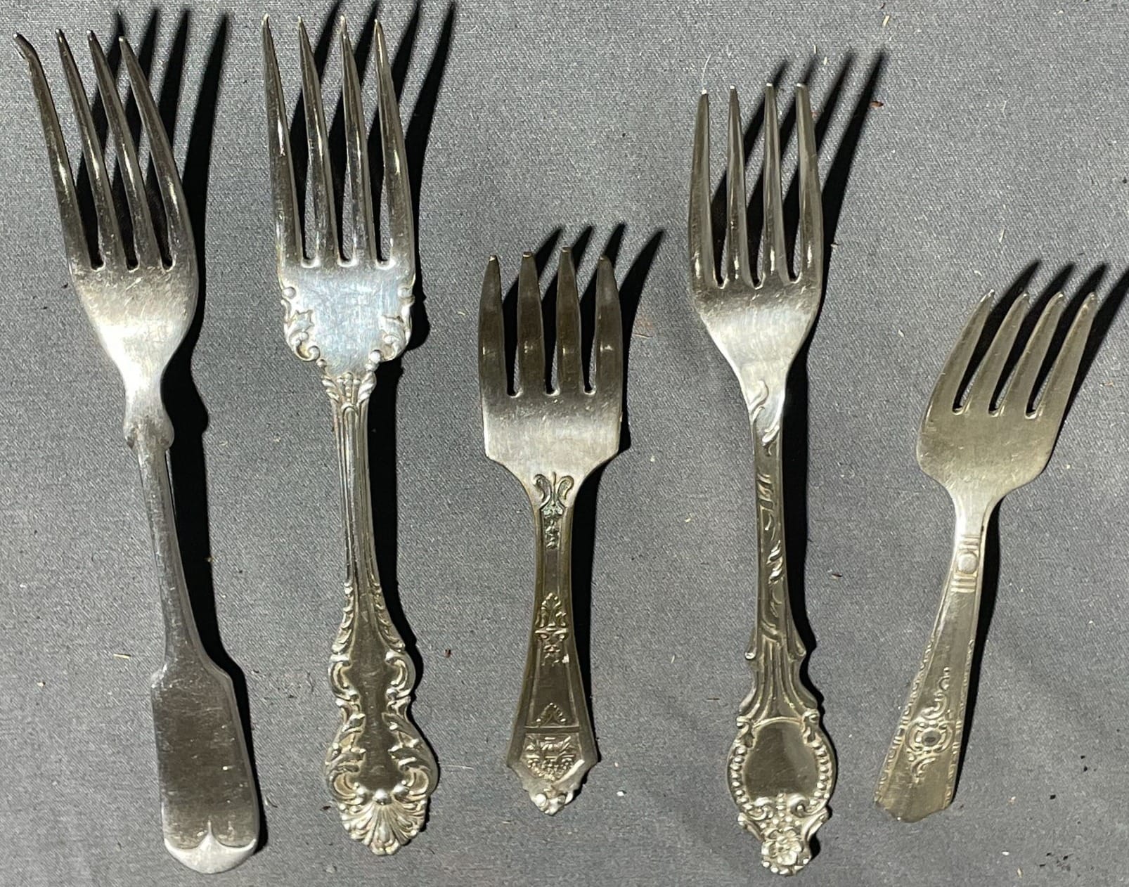 2045 (5) Children’s Forks- Including Harmony House Plate AA+, Niagara Falls Silver Co. & W. M. Rogers