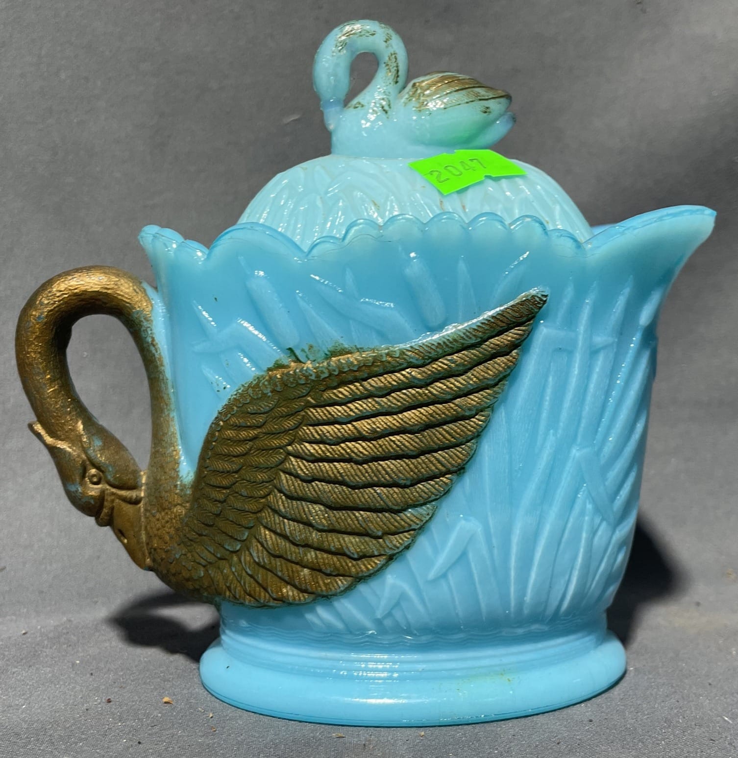 2047 Blue and Gold Tone Swan Cattail Domed Glass Candy Dish 4”H