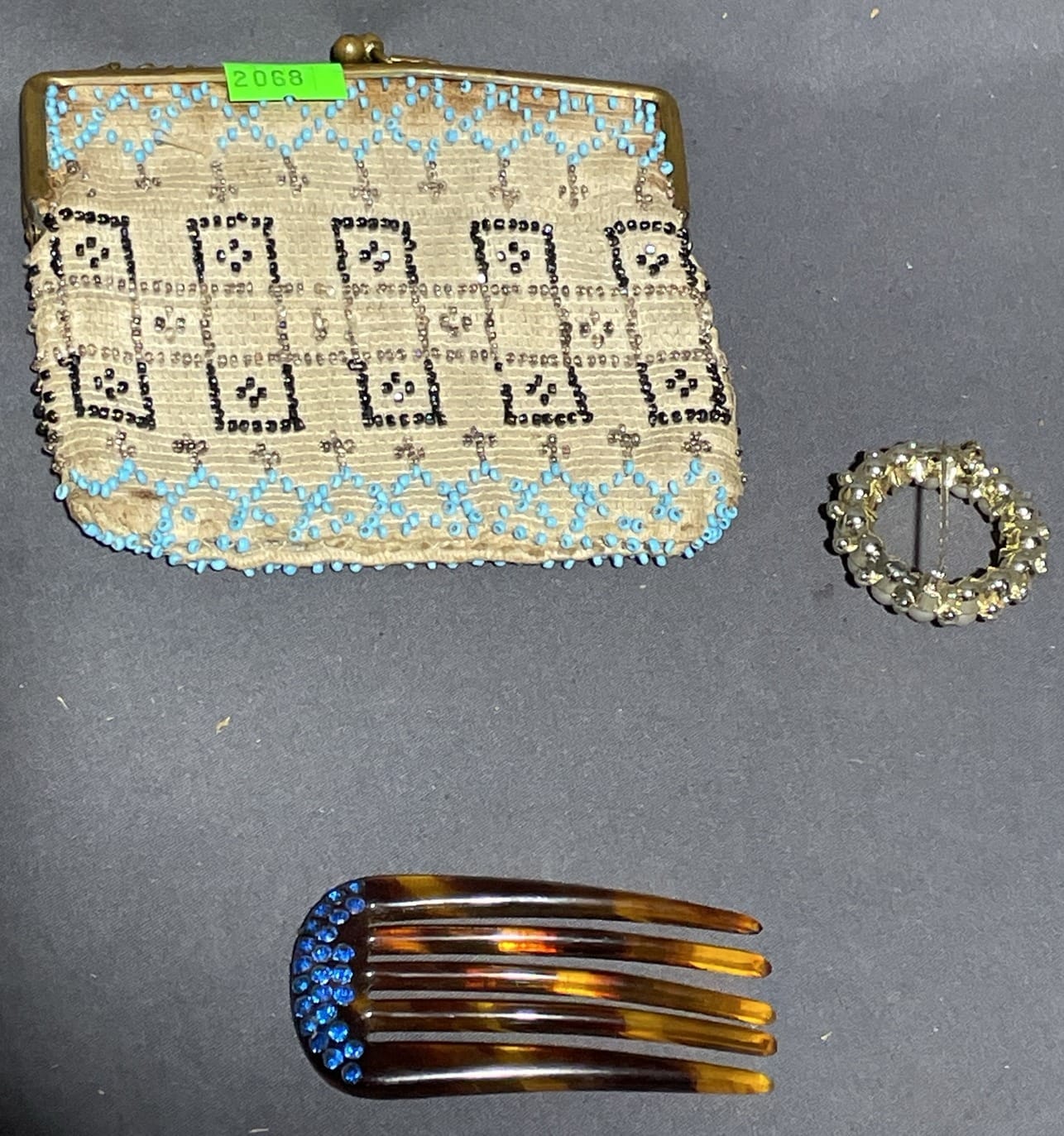 2068 Beaded Art Deco Brass Coin Bag 4”, 2 Hair Pins