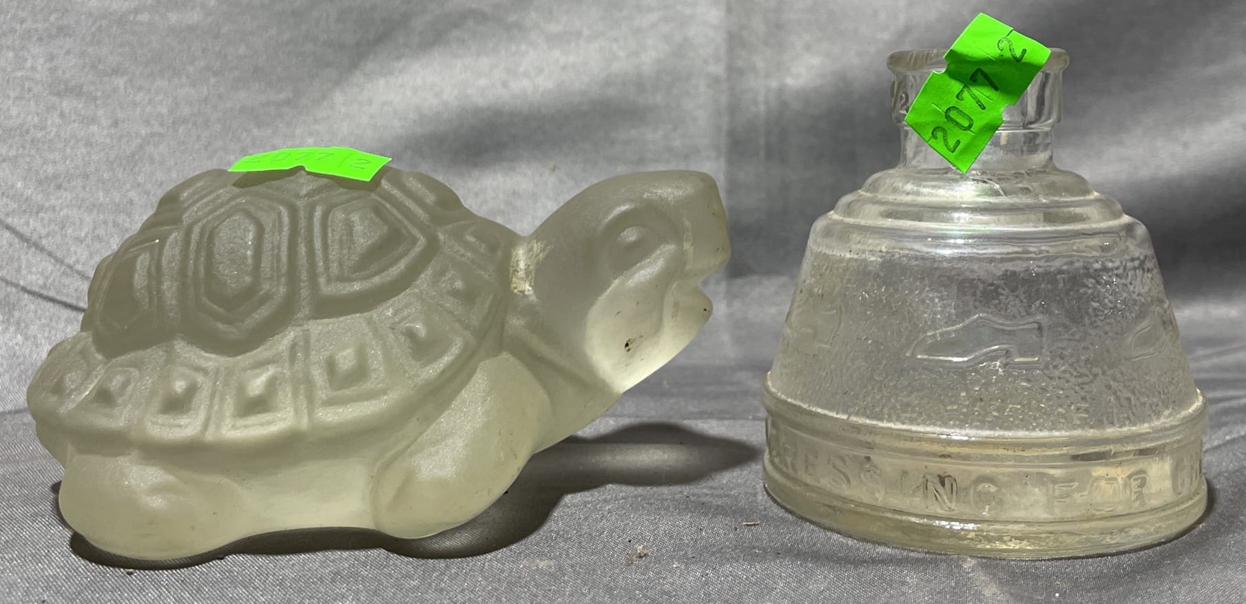 2077 Vintage Glass Bottle Shinola Dressing For Children’s Shoes 3”H, Glass Turtle Figurine 4”W