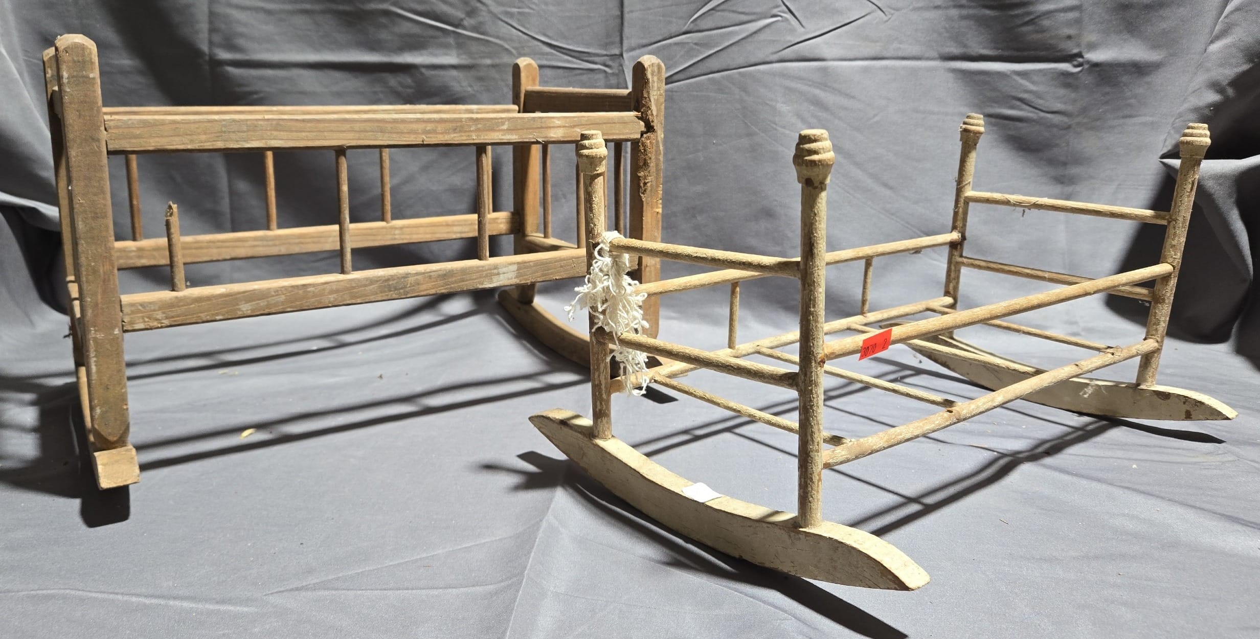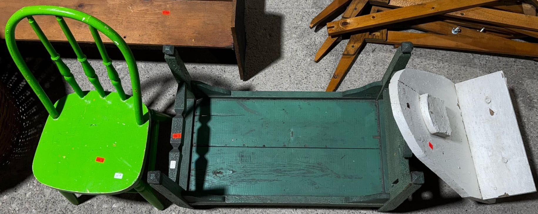 3253 Primitive Children's Painted: Chair, Doll Bed & Shelf. Chair 10x10x11, Doll Bed 22x12x6, Wood Shelf 36x13