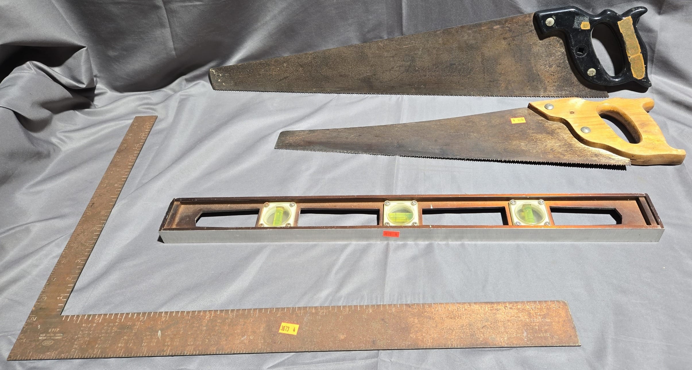 3073 (2) Wood Handle Hand Saws, Sands Steel Carpenter Framing Square, Sands Level