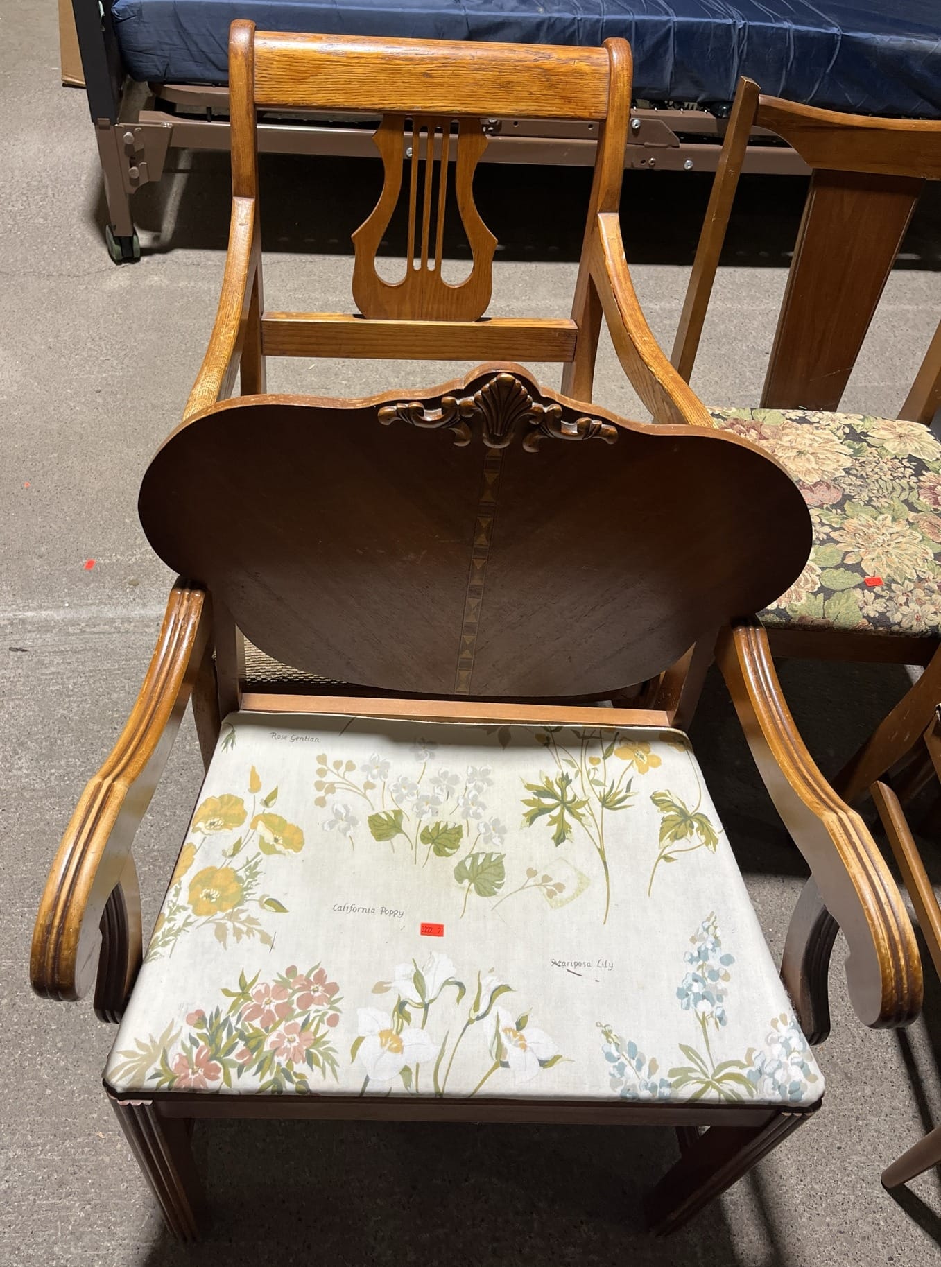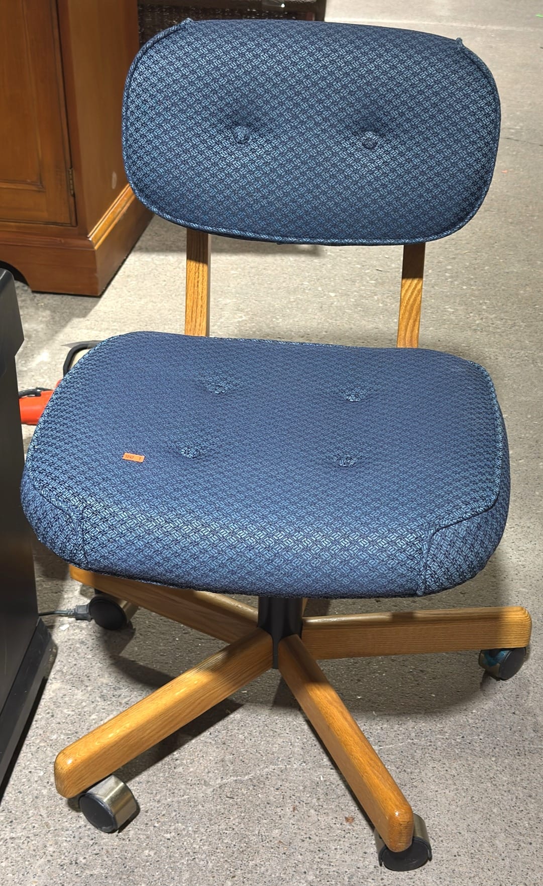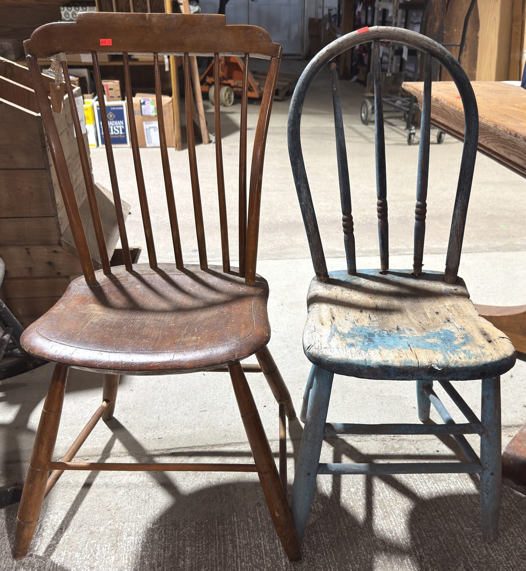 3312 2 - Plank Bottom Wood chairs one with blue paint