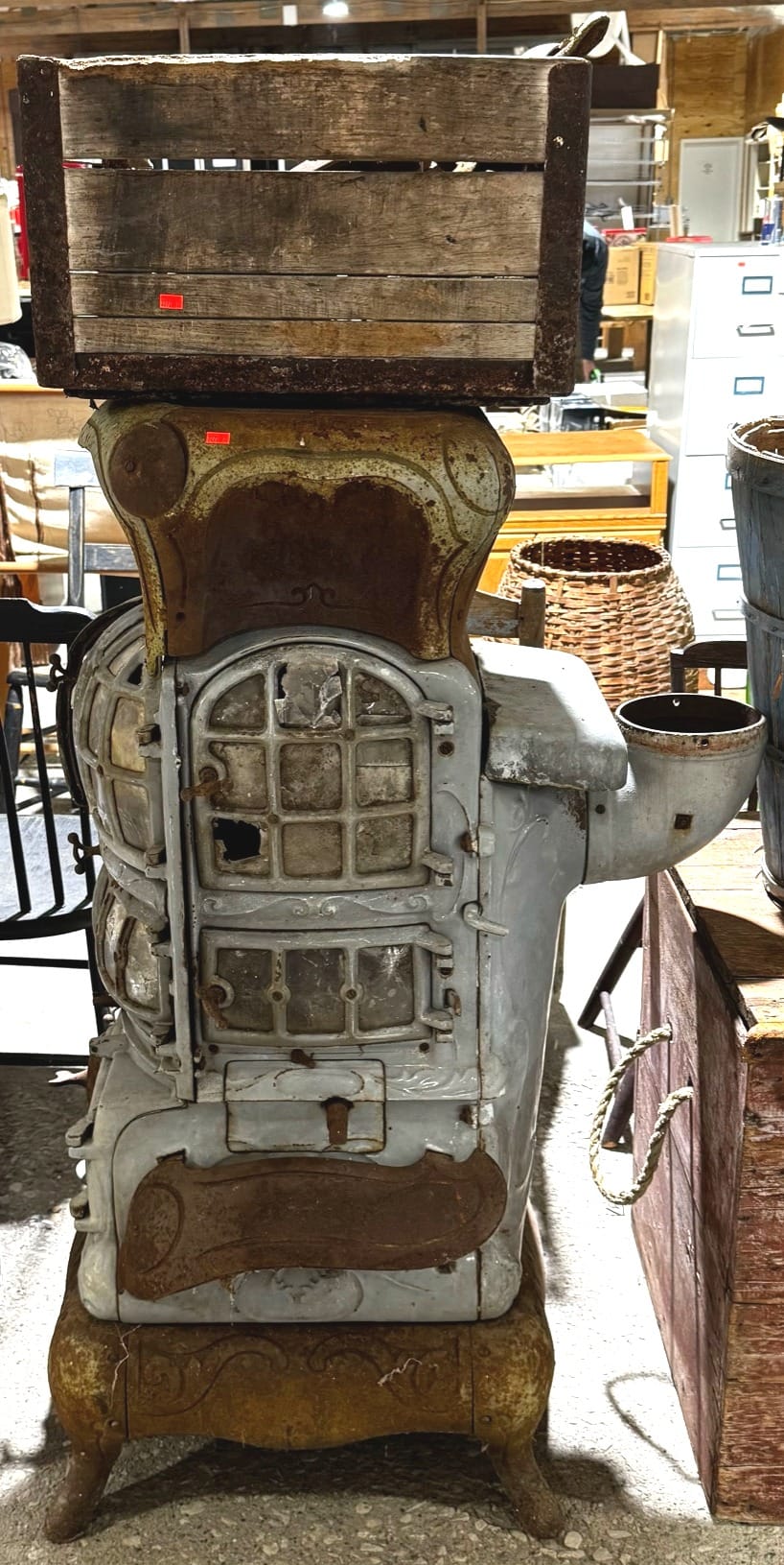 3272 Reading Stove Works Brilliant Sunshine Cast Iron Parlor Stove & Meadowmoor Dairies, 11-62 Wood & Metal Crate, The Stove measures 47" unsure if complete