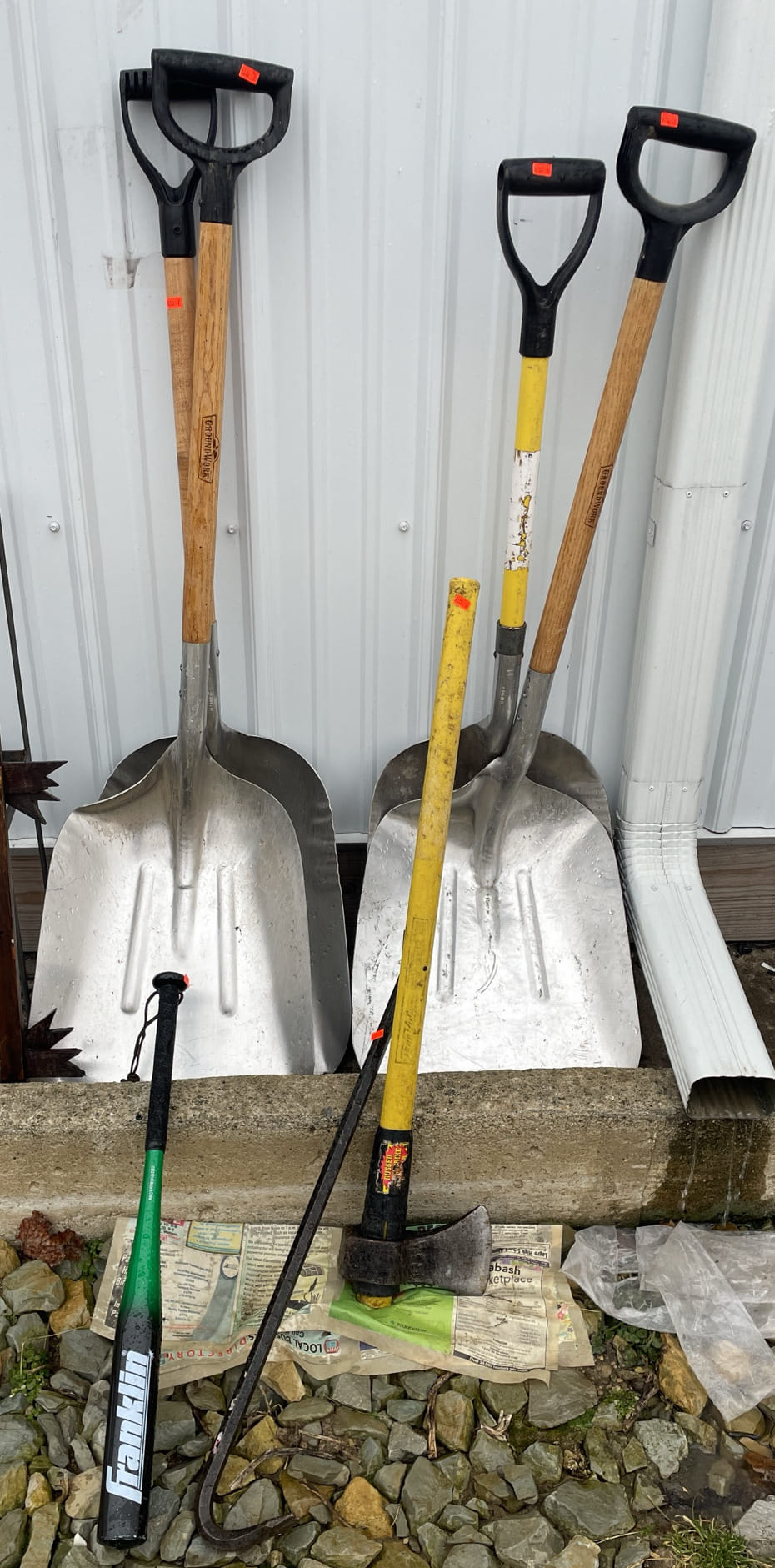9203 3- Groundwork shovels, Axe, Crow Bar, Franklin baseball bat