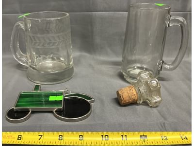 113 Warsaw Cut Glass Co. Mug - Warsaw, IND, Green Tractor Suncatcher, Mug, Corked Bottle