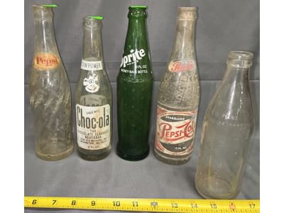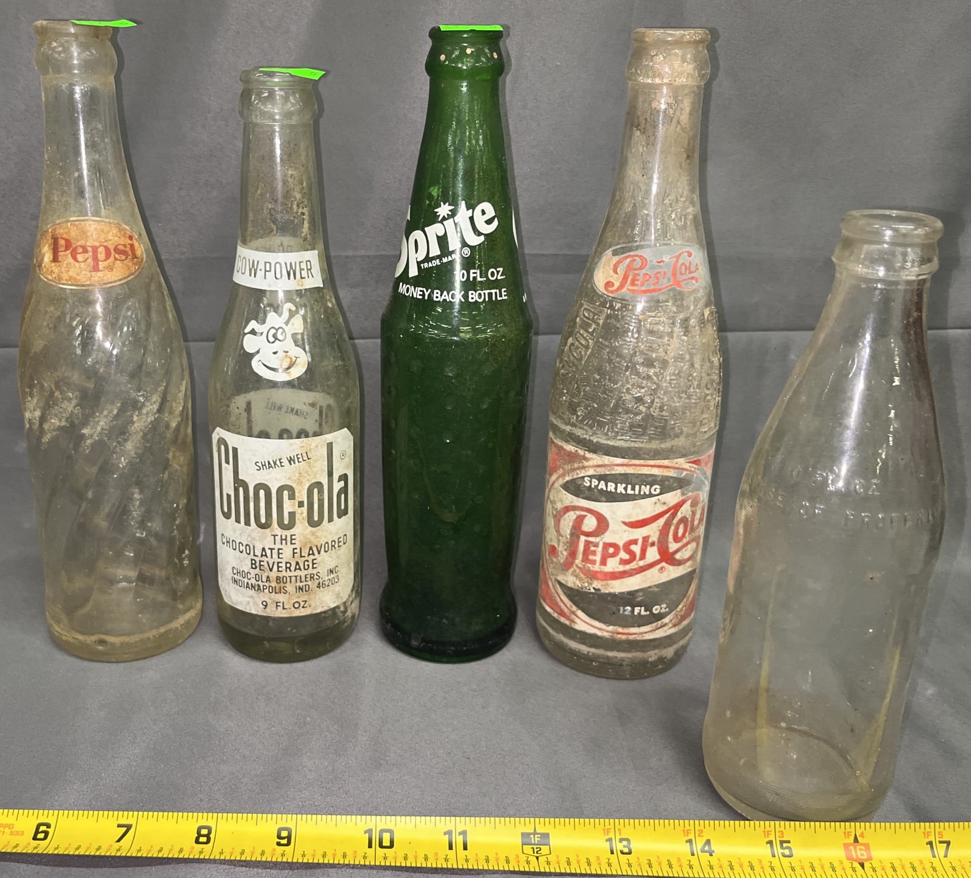 117 (5) Glass Soda Bottles Inc. Pepsi, Choc-Ola, Sprite, Unmarked