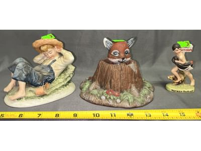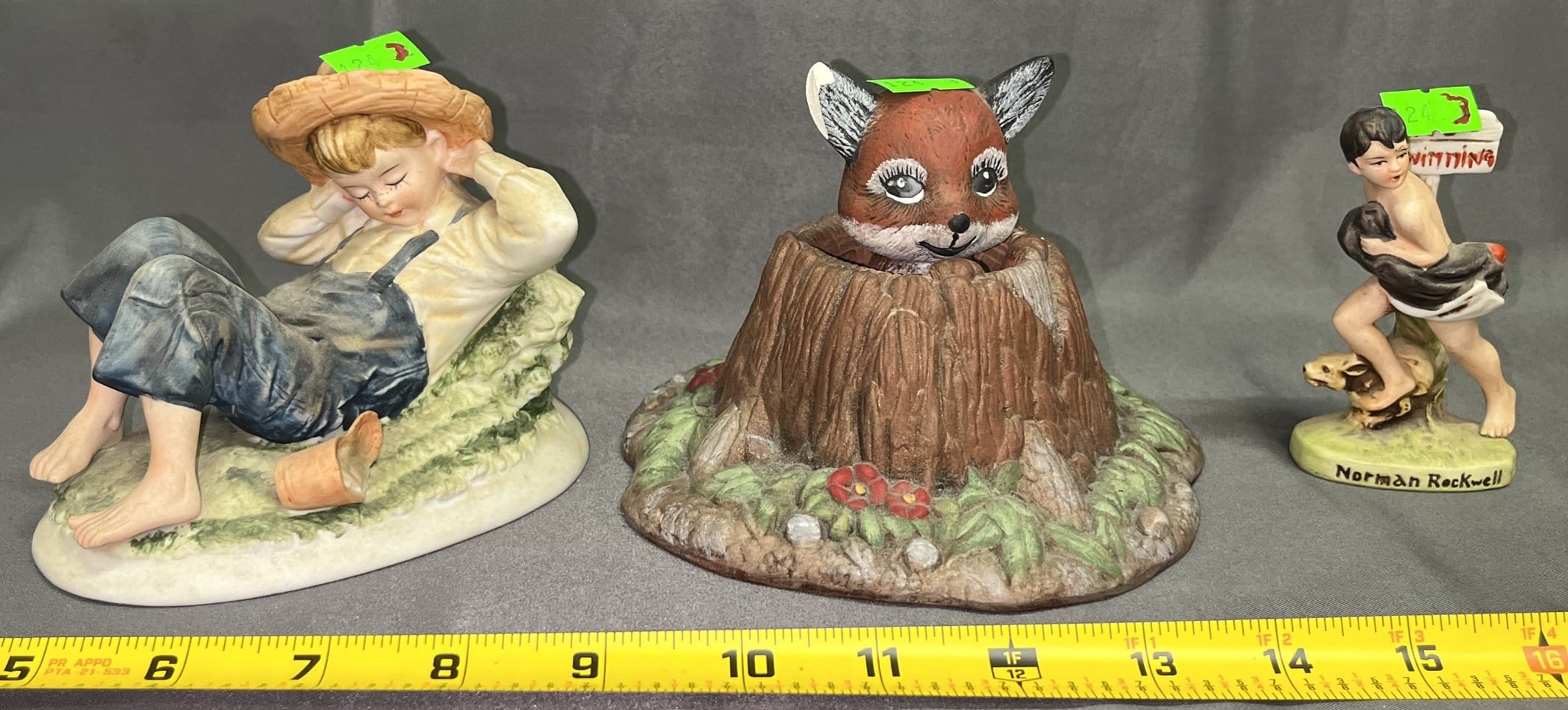 124 Porcelain Figurines Inc. Lefton Boy Sleeping, Norman Rockwell No Swimming, Fox In A Tree Stump - Has Chipped Ear