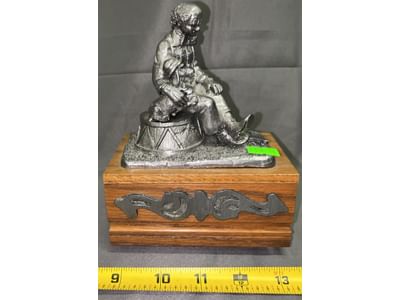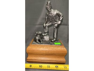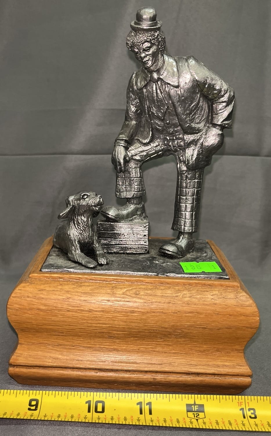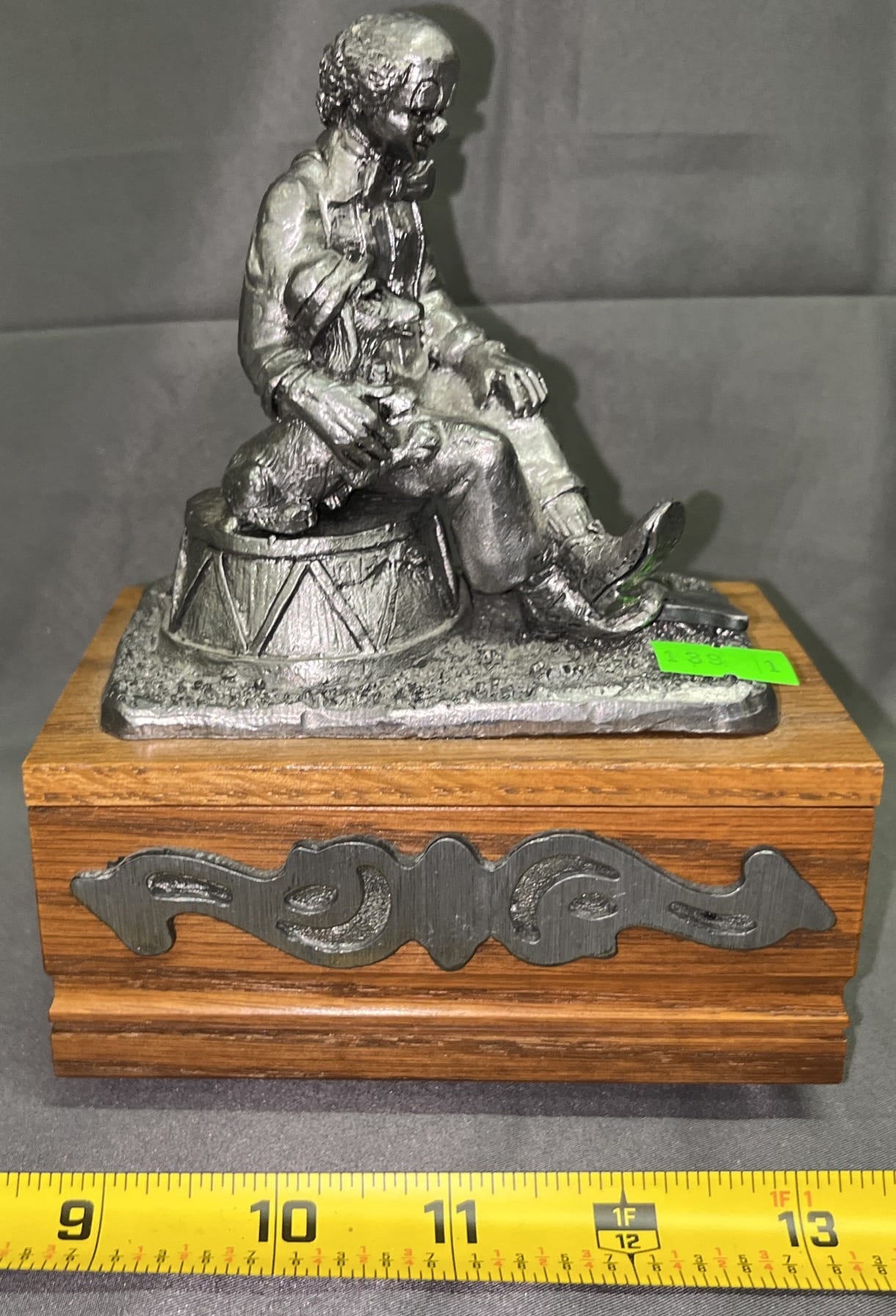 139 1985 Ricker-Bartlett Pewter Music Box Sitting Clown and Dog - Needs Box Adornment Reattached, Plays "Park City" 3467/5000