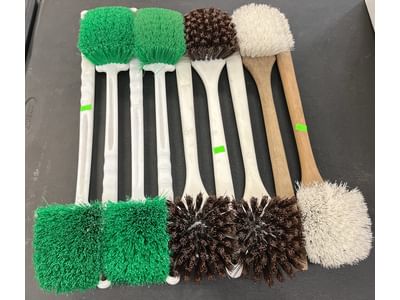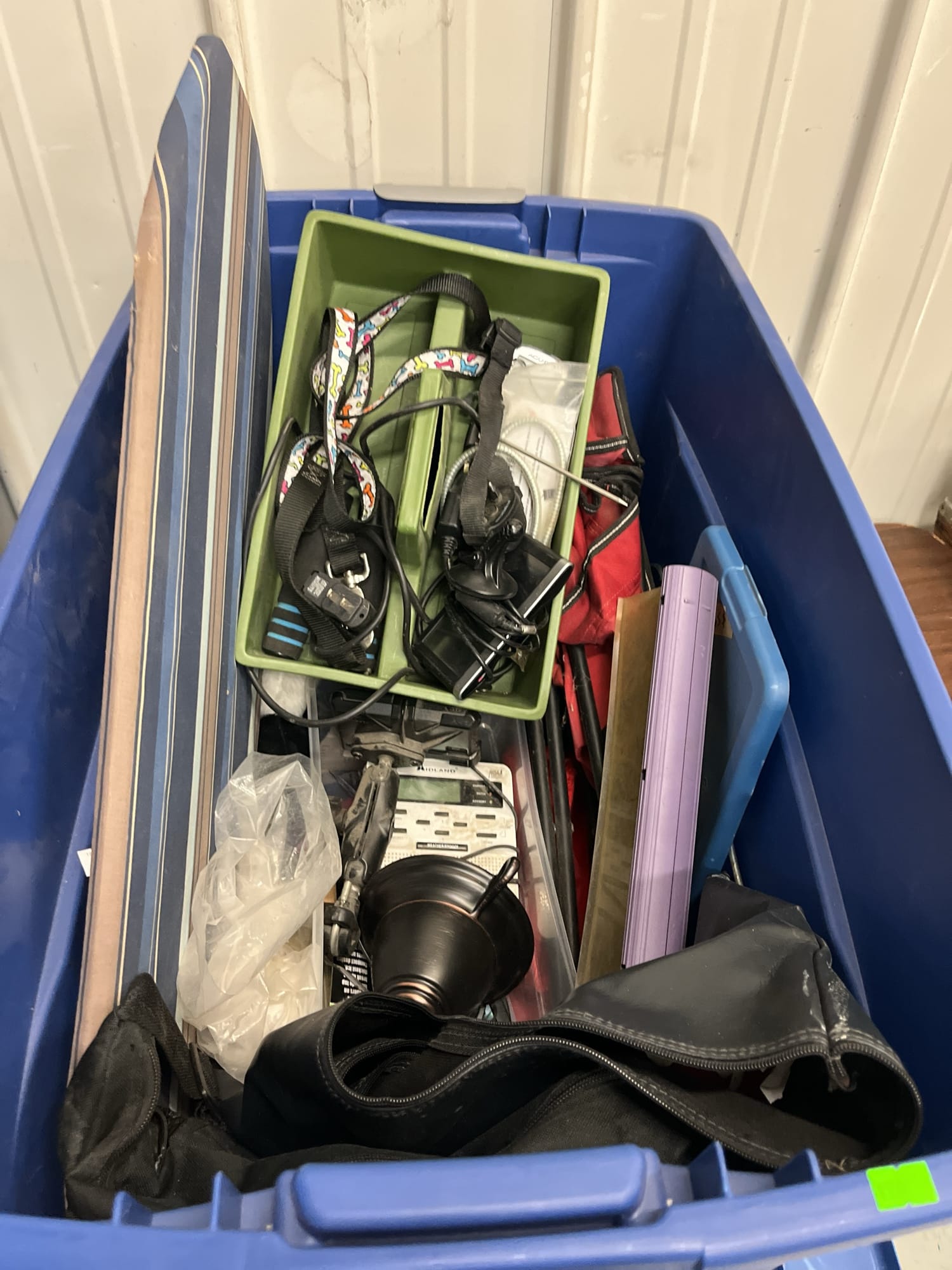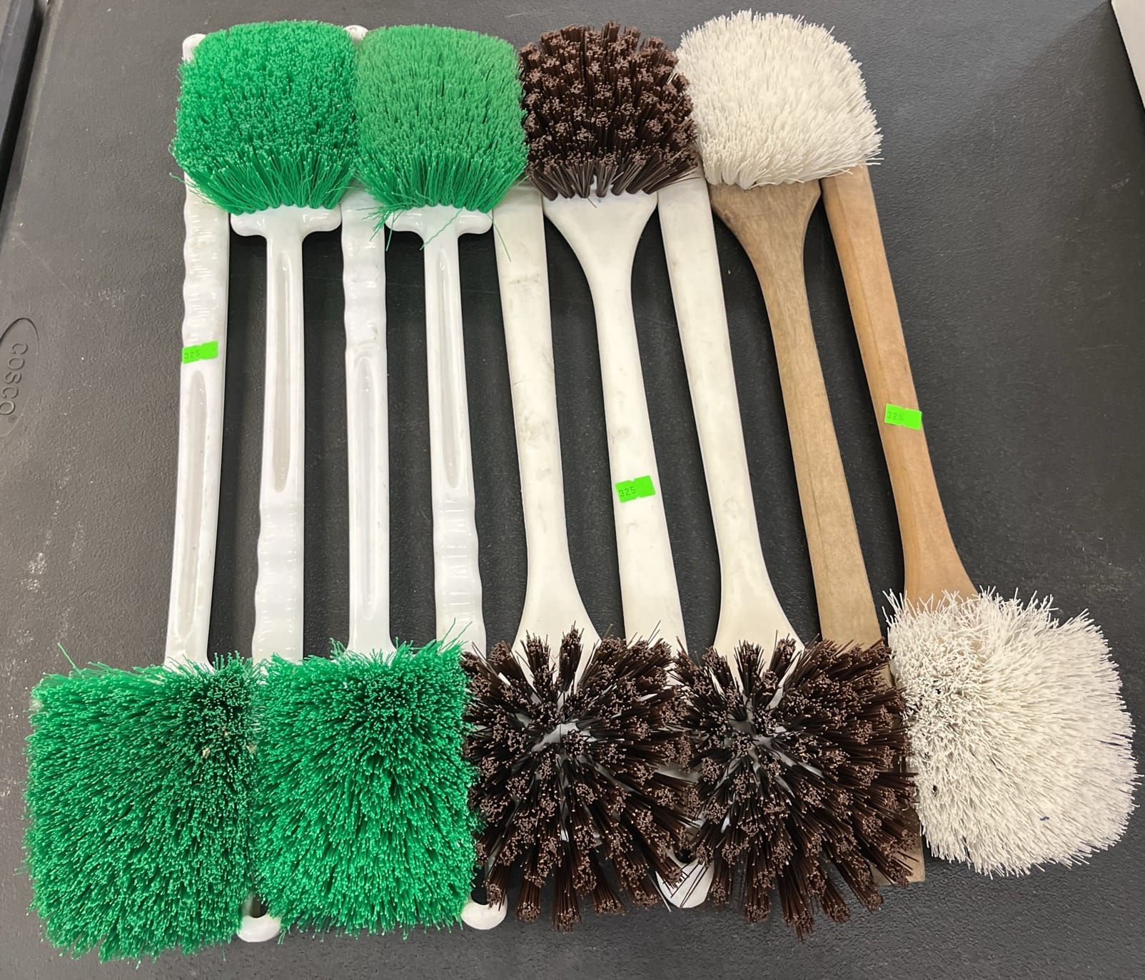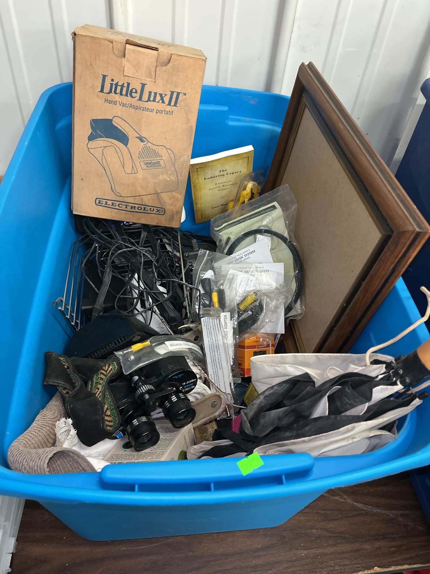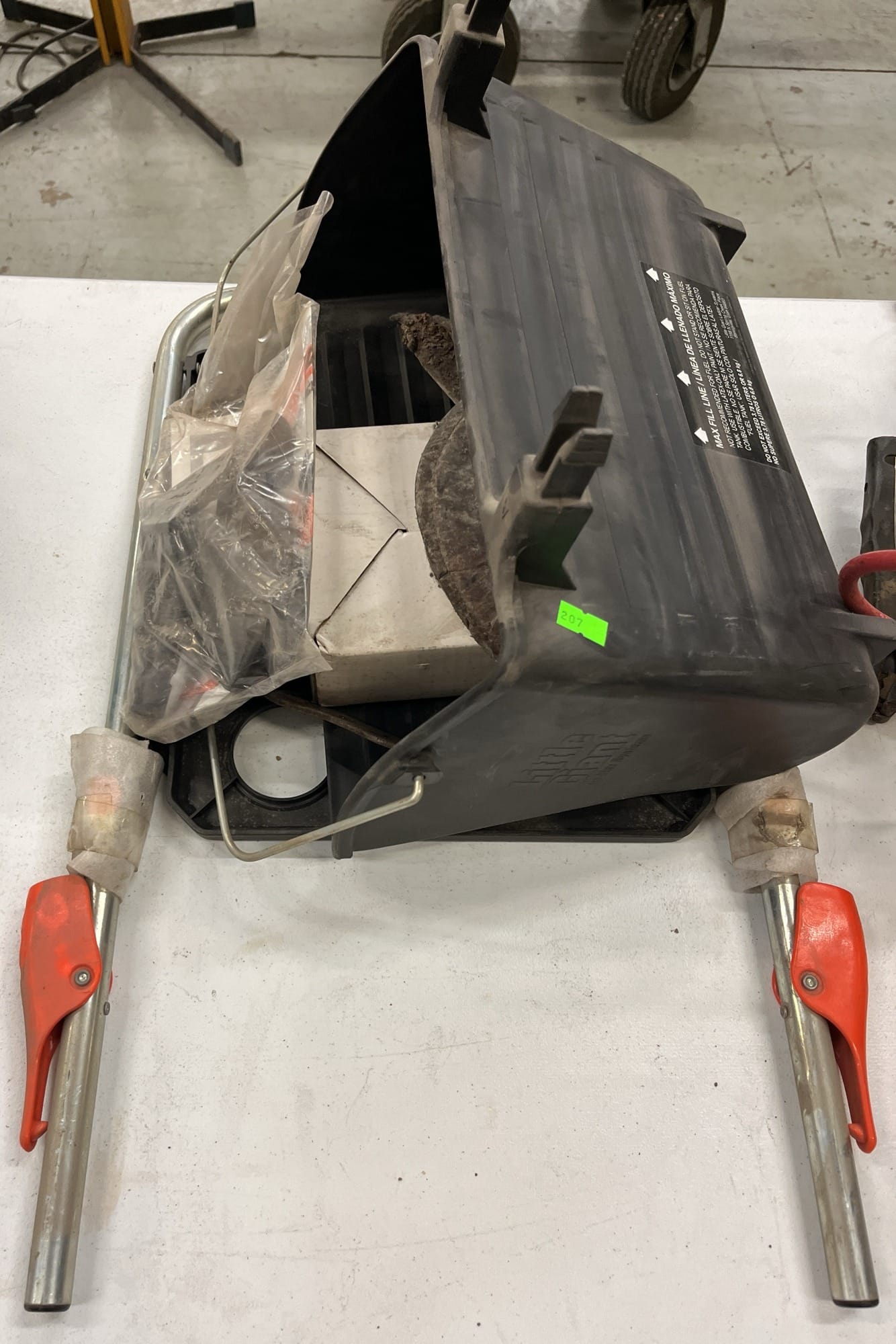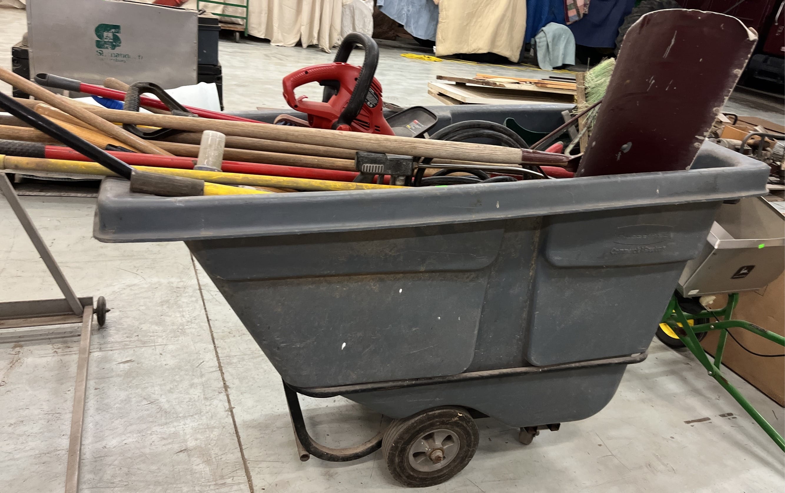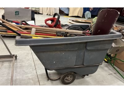 407 Rubbermaid Plastic Tote Cart With Brooms and Long Handle Tools, Hedge Trimmer